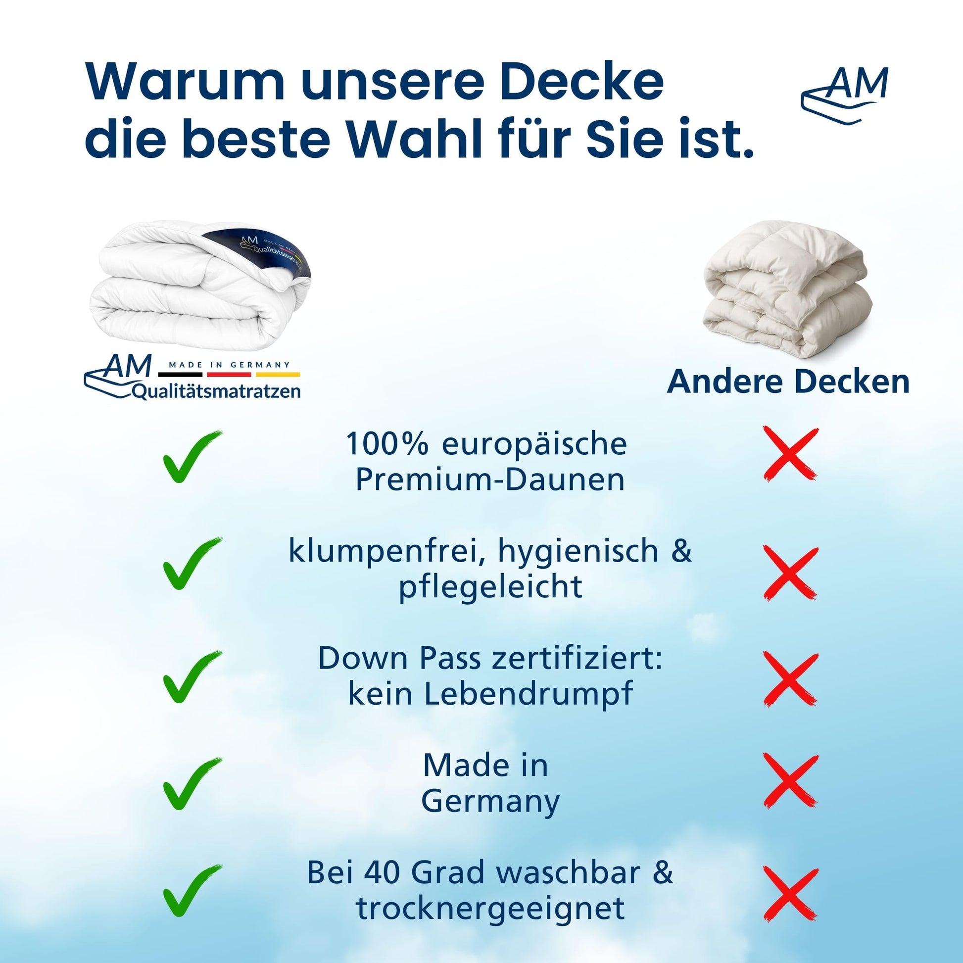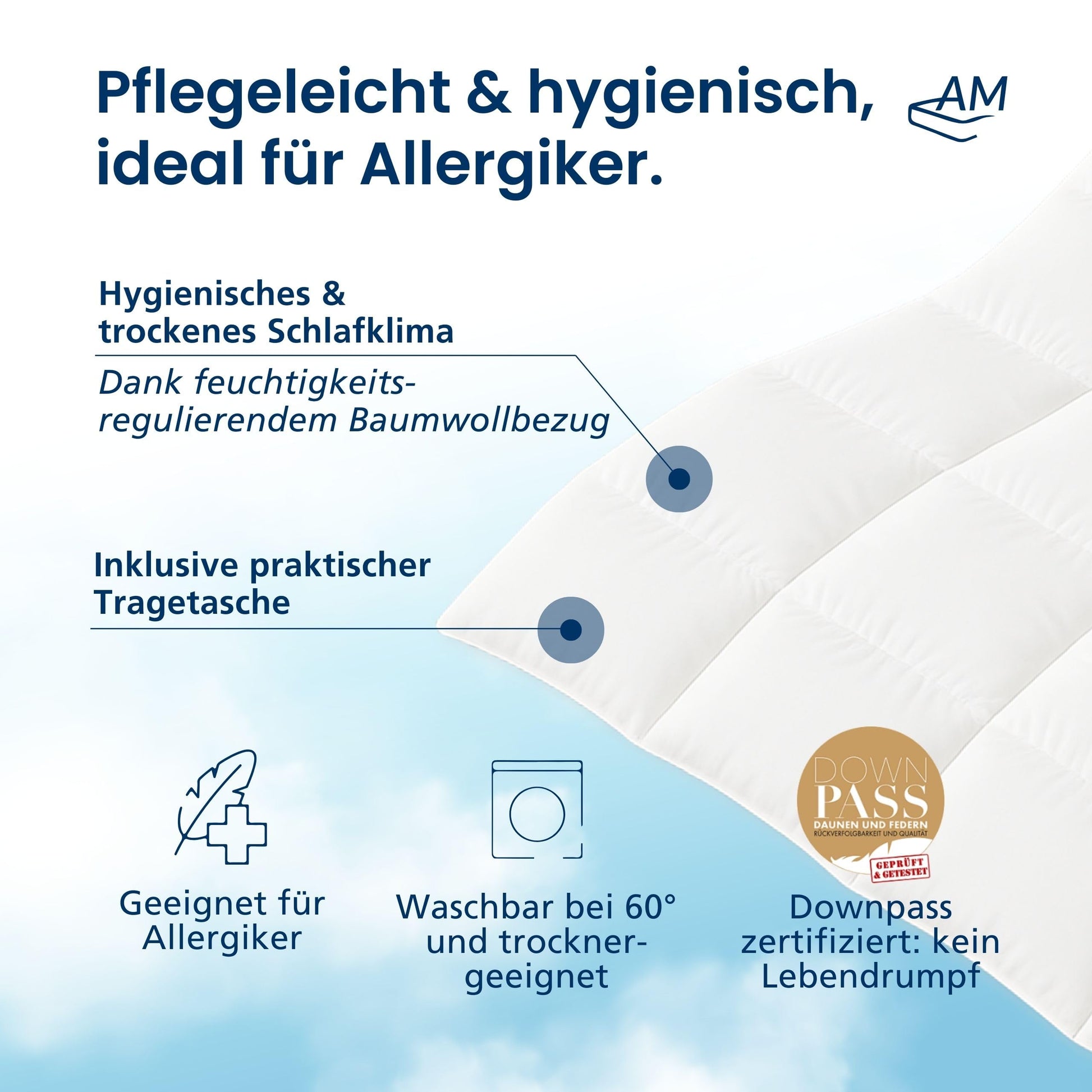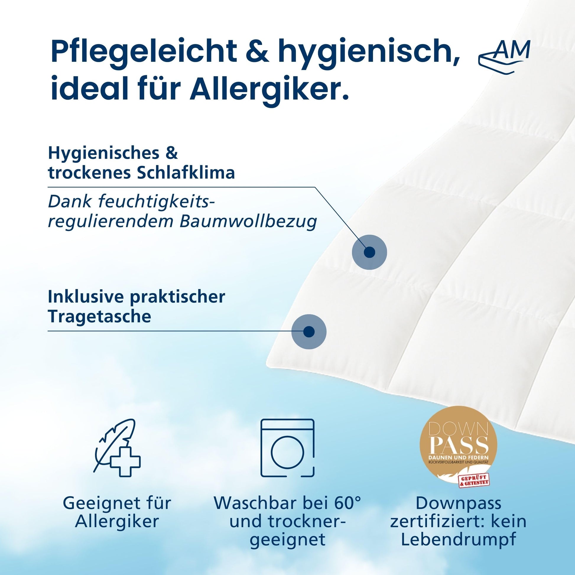 - Certified quality made in Germany – Our transition down duvet carries the Downpass (formerly Traumpass) as well as the Nomite seal and is therefore ideal for allergy sufferers. Made in Germany is not just an empty phrase for us: Our products are completely made in Germany.