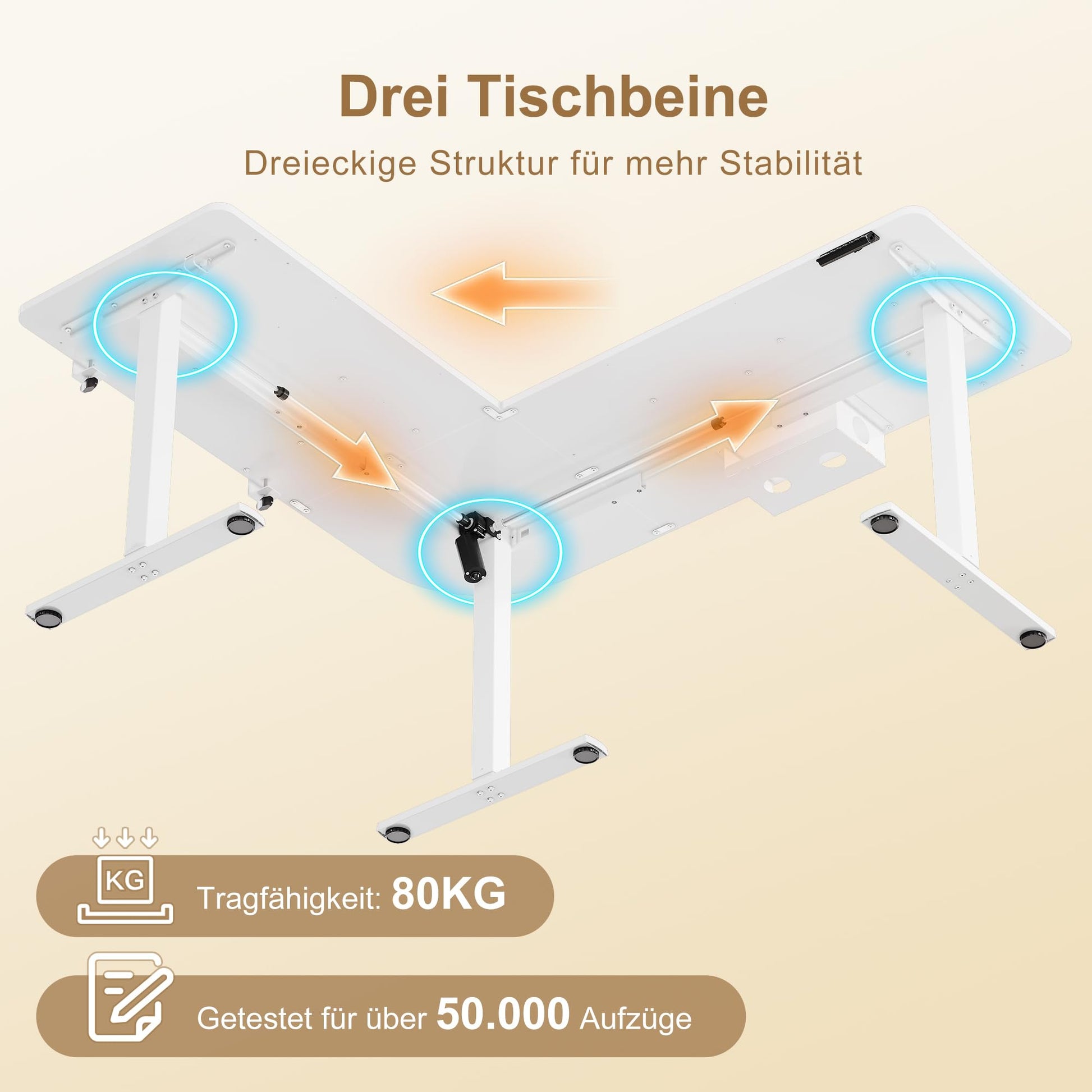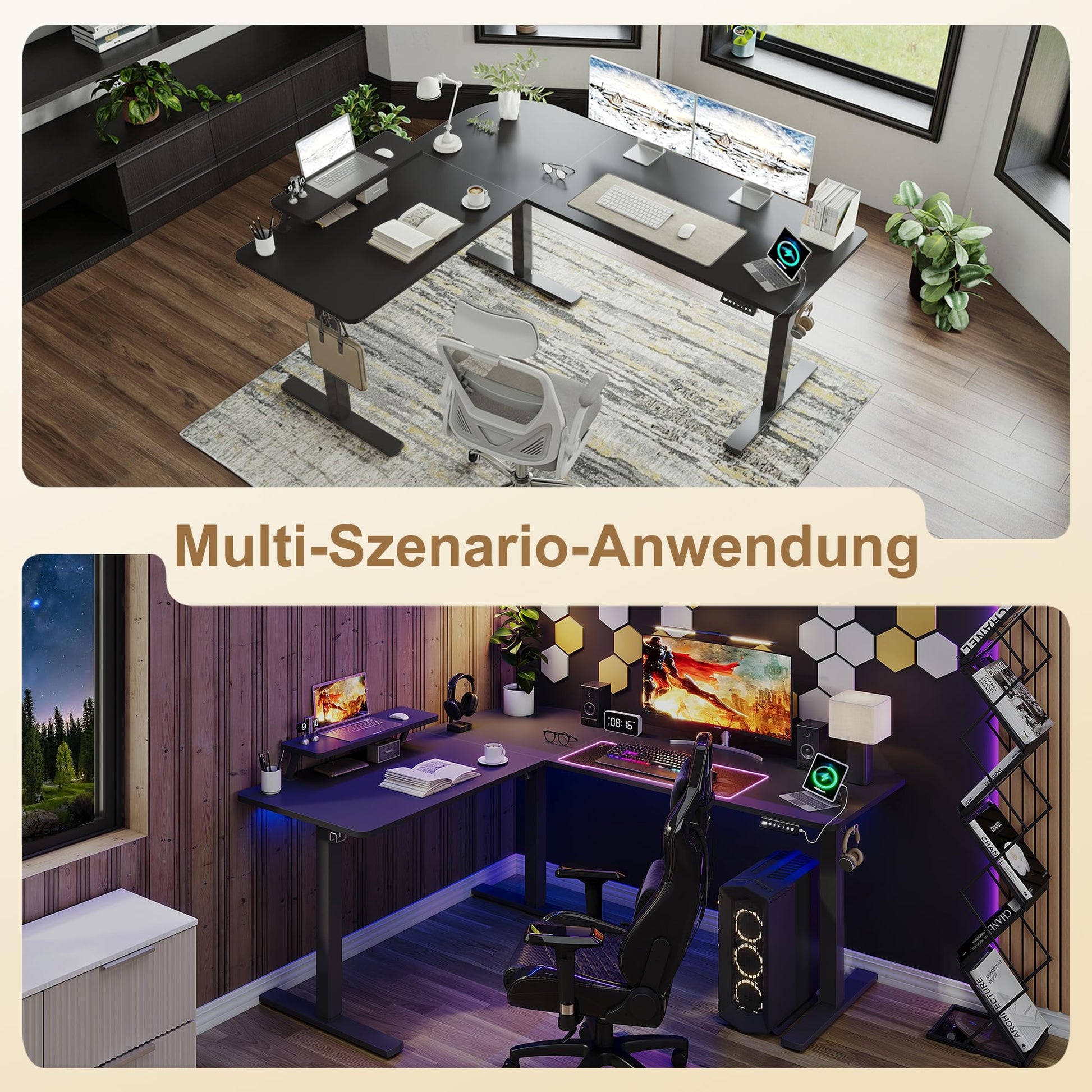 - Intelligent height adjustable: the replaceable corner desk height adjustable makes optimal use of space in the corner, saves space and impresses with its simple and high-quality workmanship. The L-shaped height adjustable desk has 2 preselection buttons to adjust the desired height from 73 cm to 120 cm. With USB port for your electronic devices to charge.
