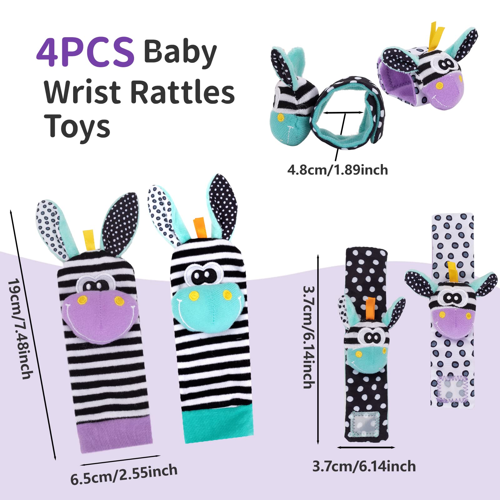 - Cute and interesting: all wrist rattles and foot finder socks have bells inside, all animals ear have sound paper inside, when you interact with your baby shake these toys, it makes a nice ringtone, the wrists rattles attach with simple Velcro fastener, easy to put on and take off, foot finder socks have elastic, suitable for all babies, set includes: 4 pieces: x2 wrist rattles straps & x2 . It comes with 2 sets of animals, the whole package can be divided into 2 different gift sets if you want.