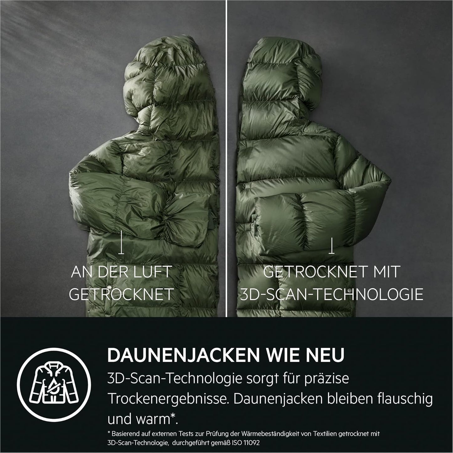 - Serie 9000 - Die AEG 9000 AbsoluteCare Plus Wäschetrockner mit 3D-Scan-Technologie trocknen mehrlagige Textilien präzise und gleichmäßig, damit Kleidungsstücke und Daunenjacken flauschig und warm bleiben