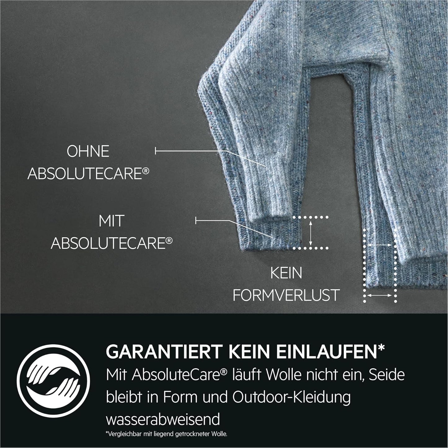 - Das AbsoluteCare-System - passt Temperatur und Trommelbewegung an deine Textilien an und ermöglicht schonende Trocknung von Wolle, Seide und Outdoor-Kleidung. Wolle wird ohne Reibung getrocknet, Outdoor-Bekleidung erhält genau die nötige Wärme zur Reaktivierung der wasserdichten Membran