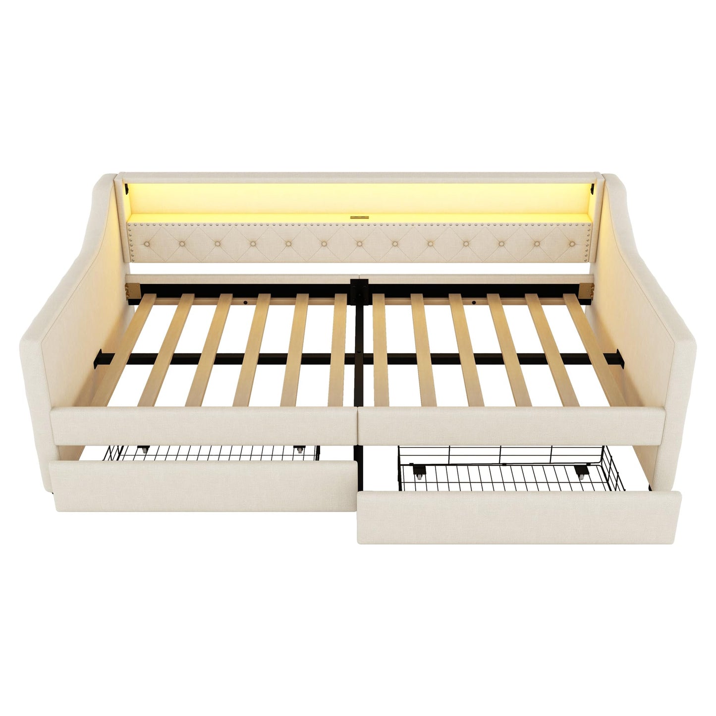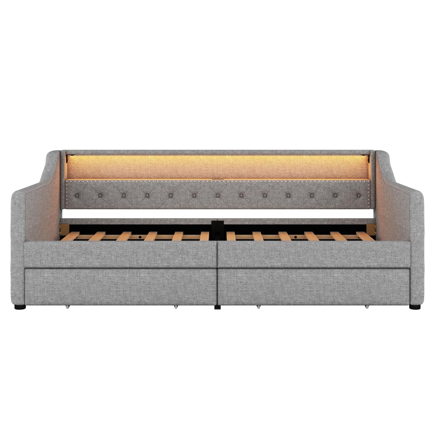 Aoskem Polsterbett Tagesbett Einzelbett 90x200 mit 2 Stauraum Schubladen, Kinderbett LED-Sofabett mit USB-Ladebuchse, Bettgestell mit Lattenrost, Jugendbett Schlafsofa, Ohne Matratze, Leinen (Grau)