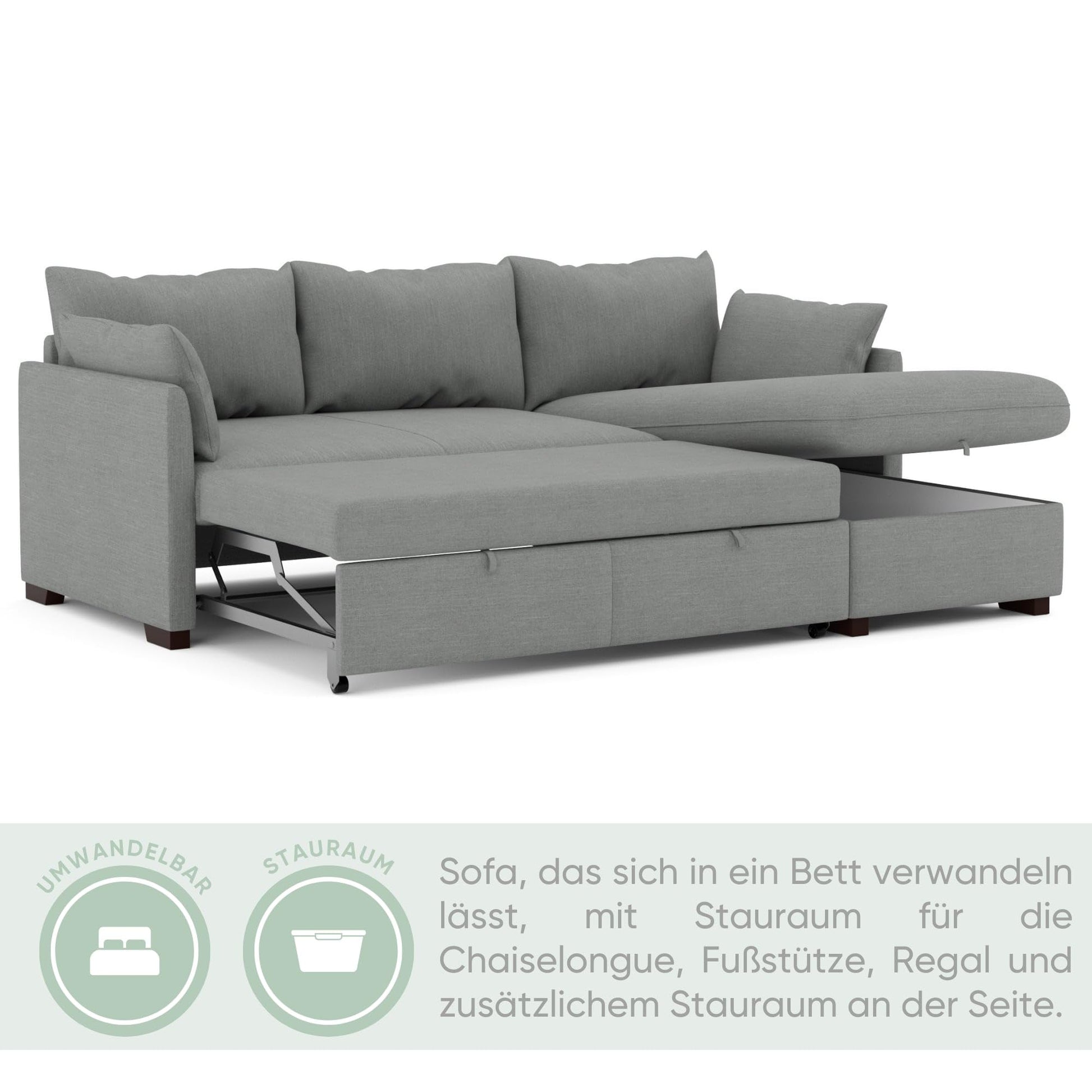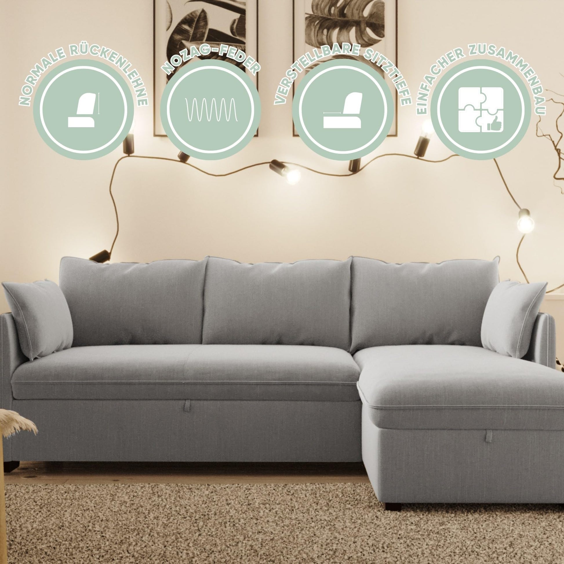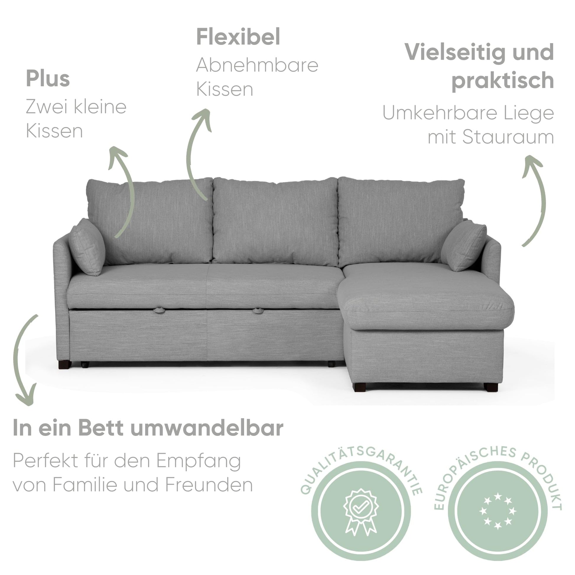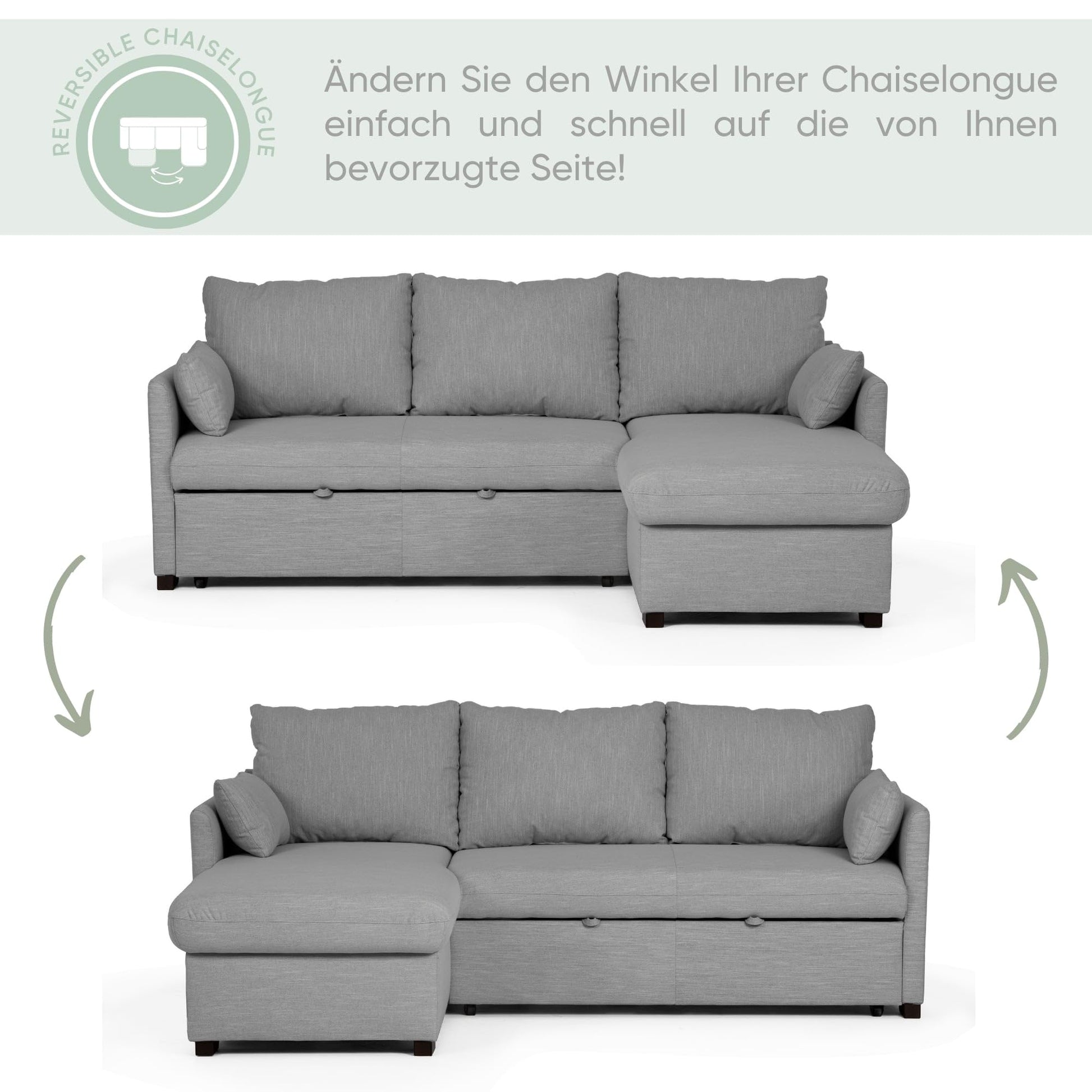 aquinos BUDWING Orlando Ecksofa mit Schlaffunktion Schlafsofa Bettfunktion Bettkasten Kleine 3 Sitzplätze Schenkelwahl Links oder rechts (graue Farbe)