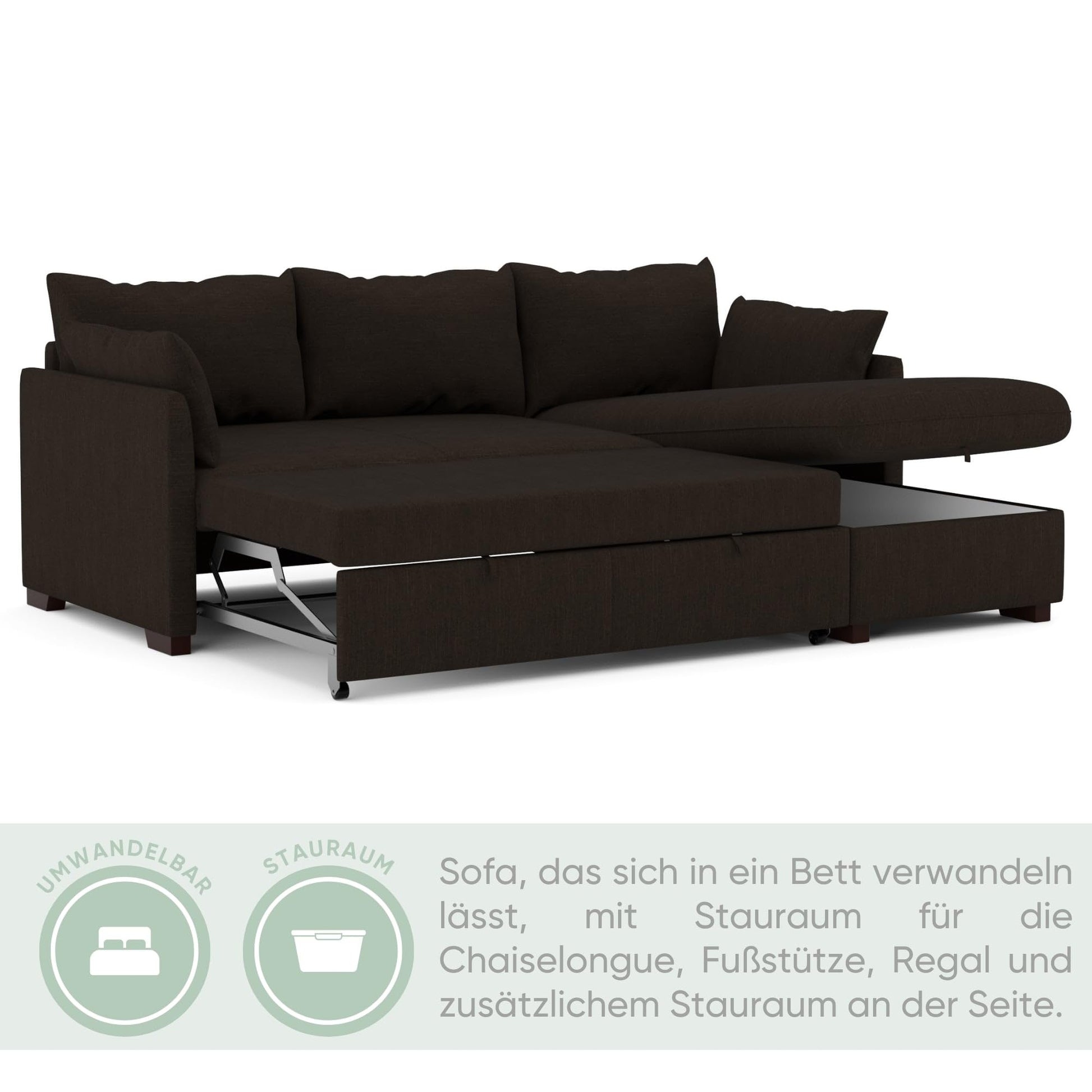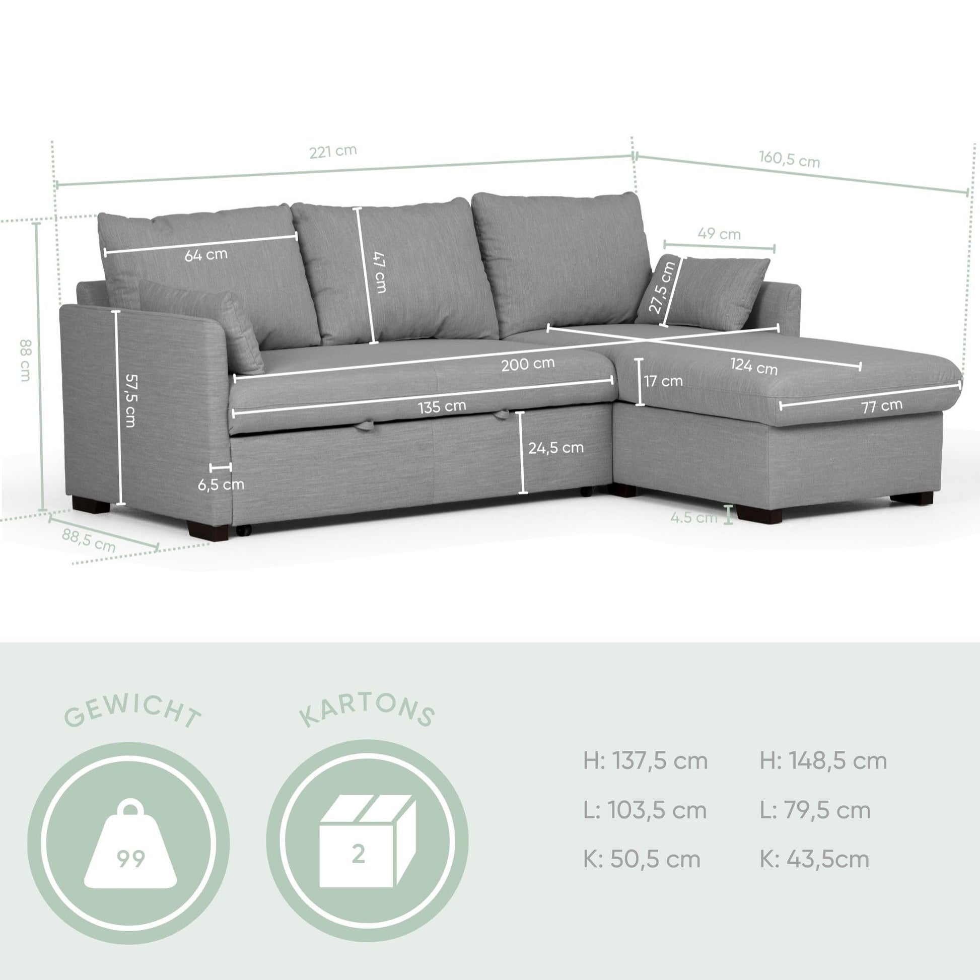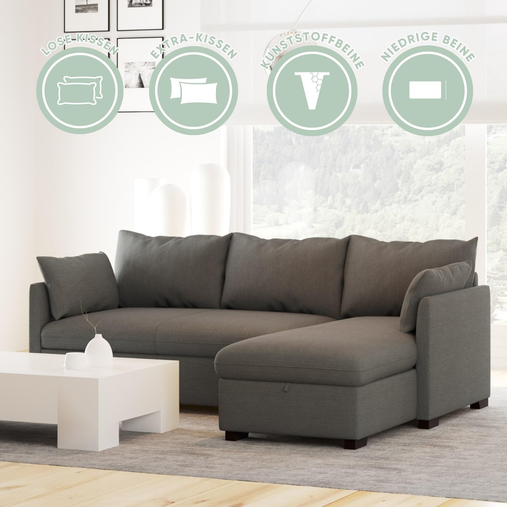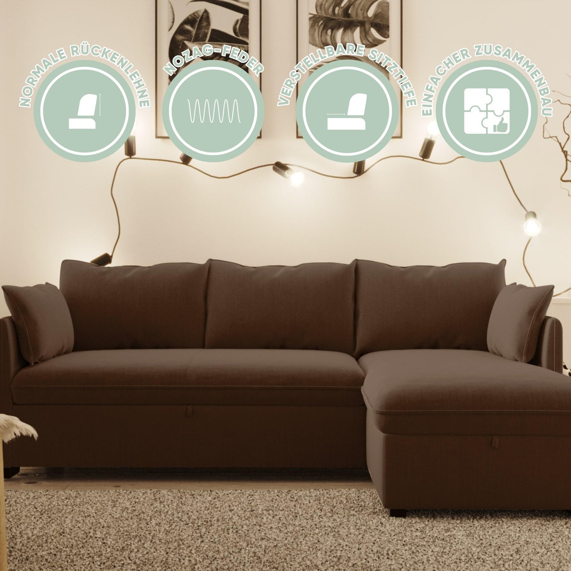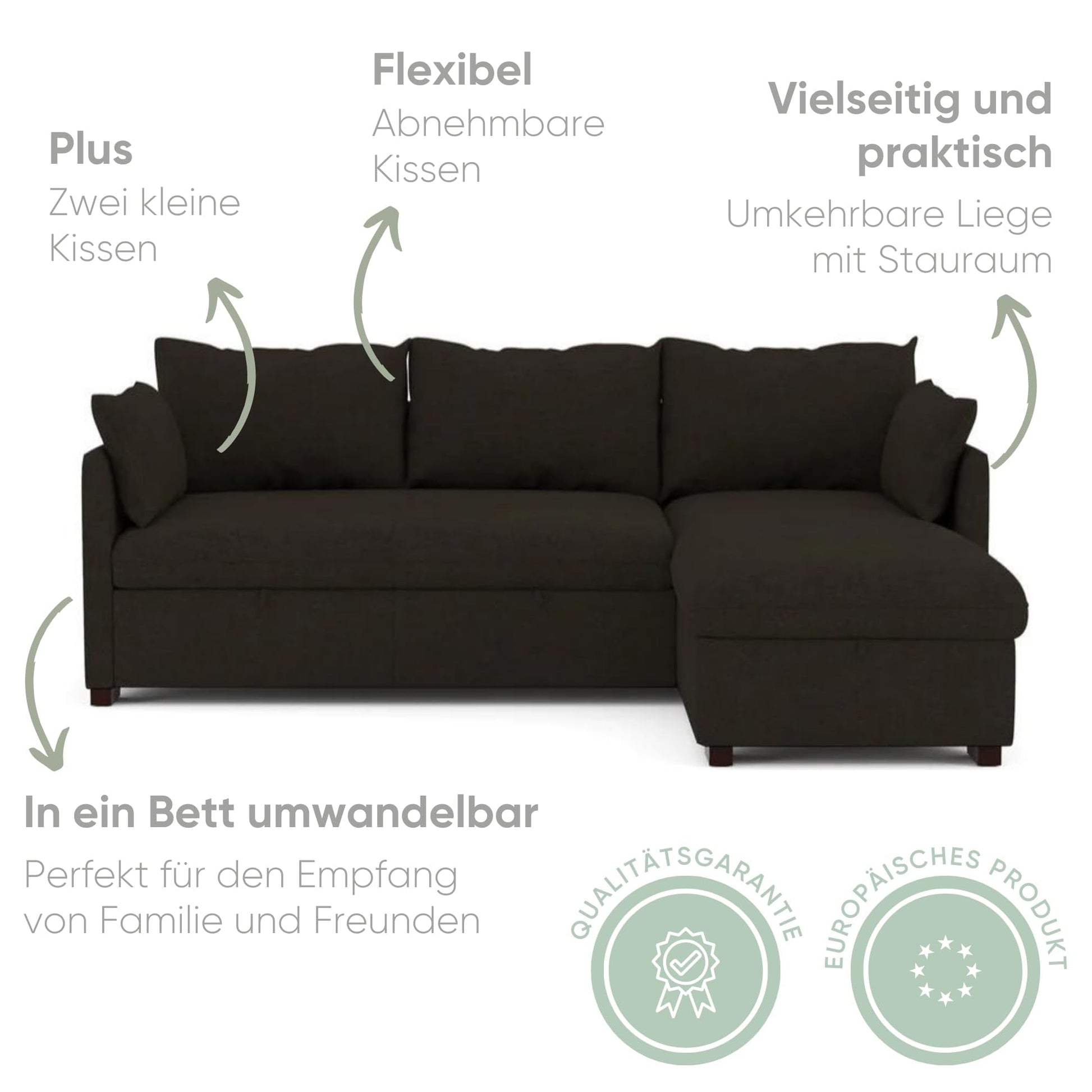 aquinos BUDWING Orlando Ecksofa mit Schlaffunktion Schlafsofa Bettfunktion Bettkasten Kleine 3 Sitzplätze Schenkelwahl Links oder rechts (graue Farbe)
