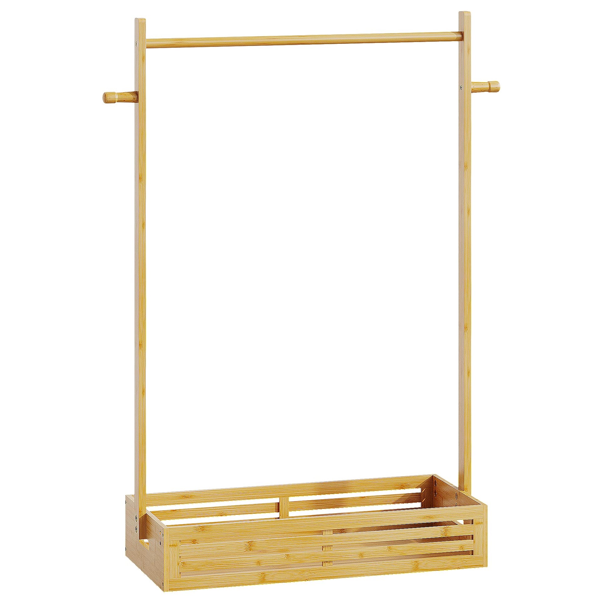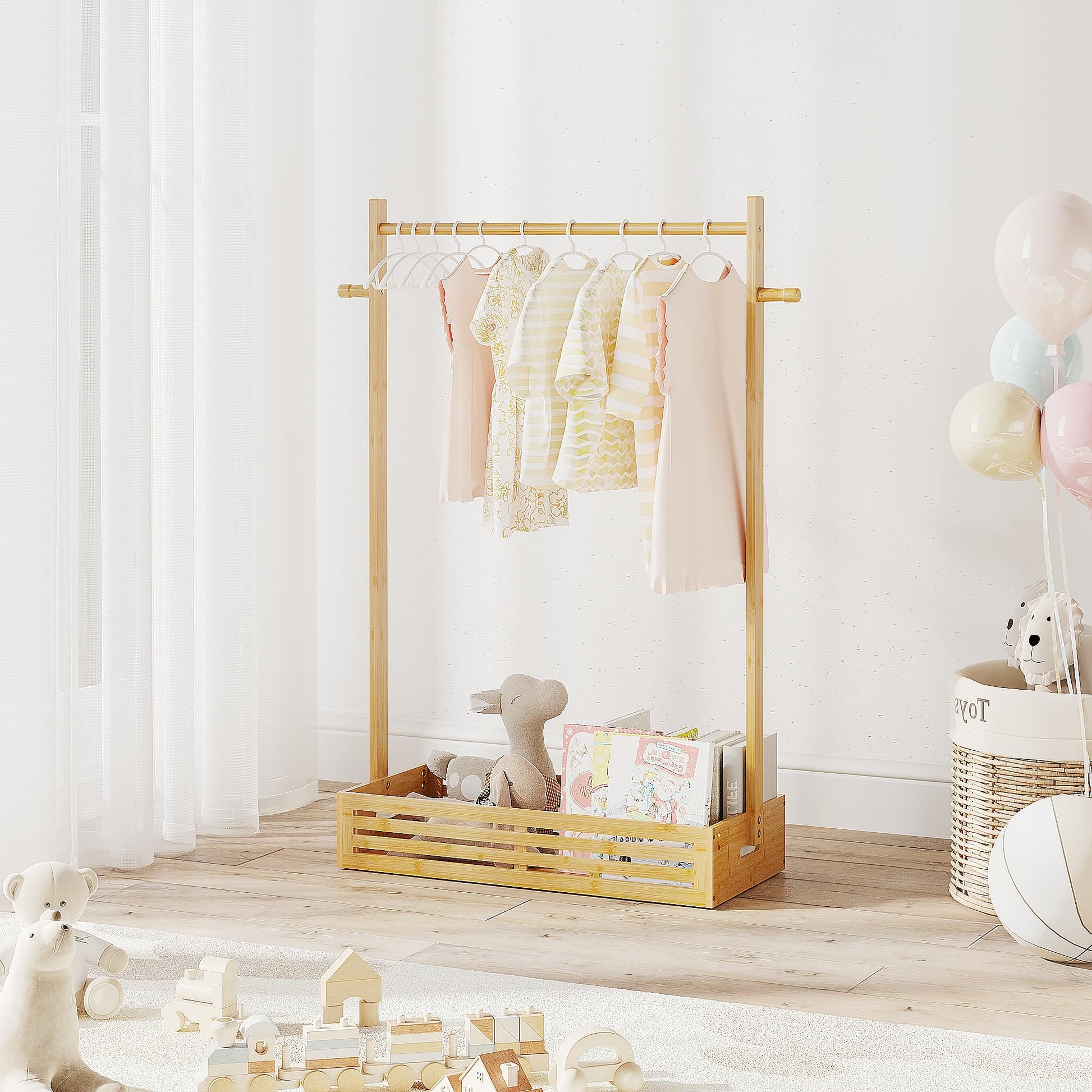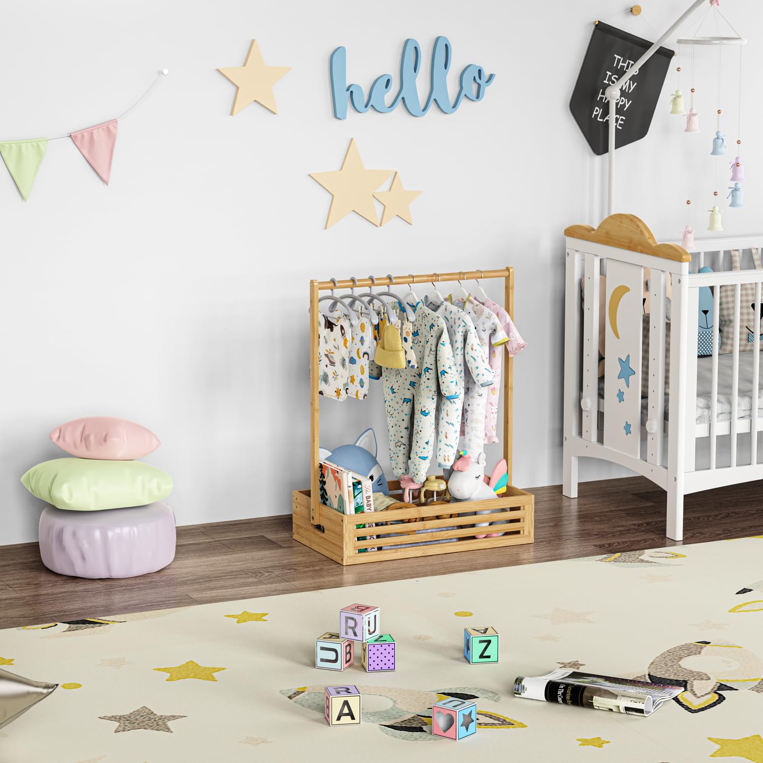 - DOUBLE FUNCTION This small coat rack with handle provides double functionality for storage and hanging. Compared to other baby clothes racks that only allow hanging, our baby clothes rack comes with a spacious storage box and an adjustable clothes rail. The bamboo design of the basket at the bottom provides enough space for plush toys, clothes, towels and more. The clothes rail is 54.5 cm long, which is enough to hang your baby or pet's clothes, and it can be fixed on the side or in the middle if necessary.