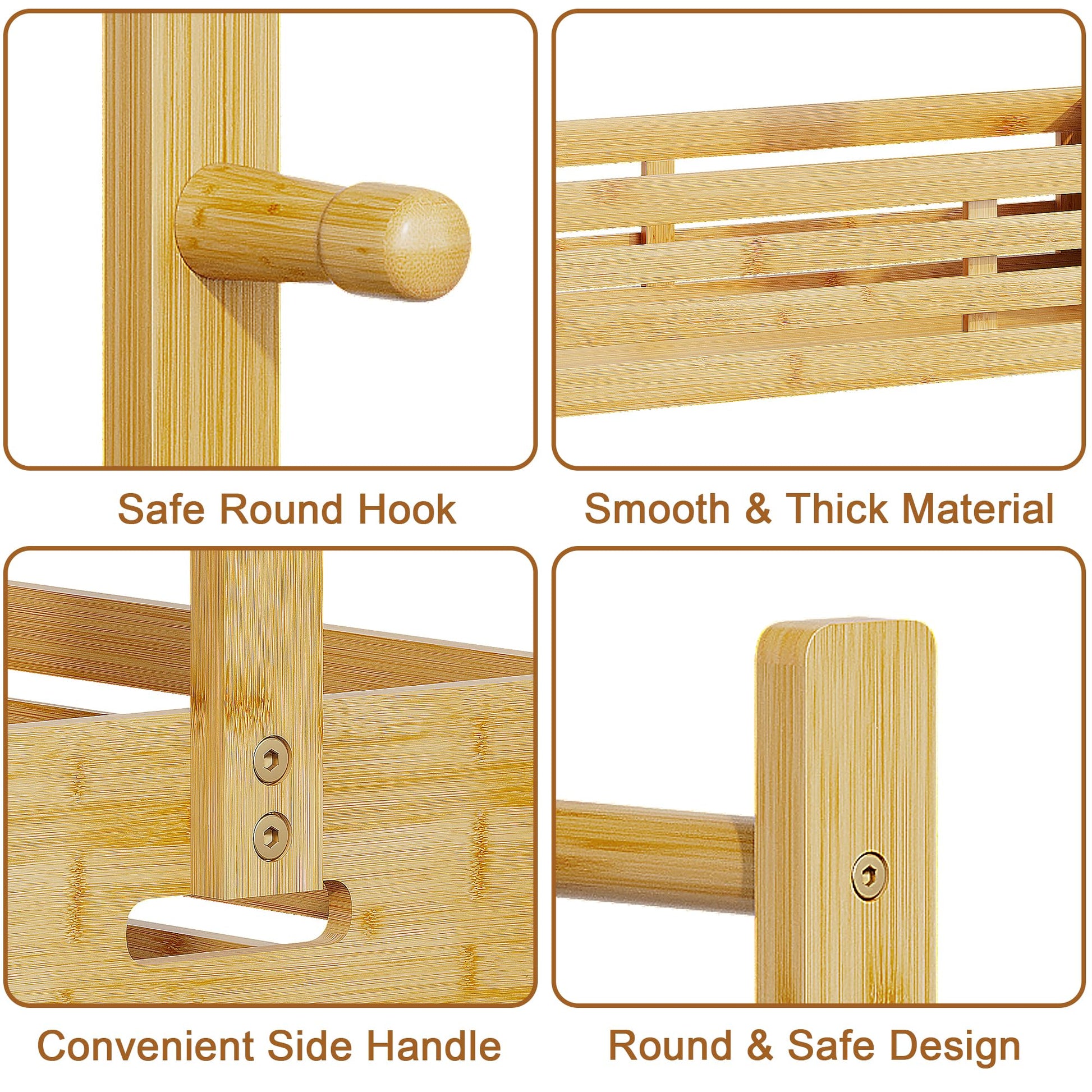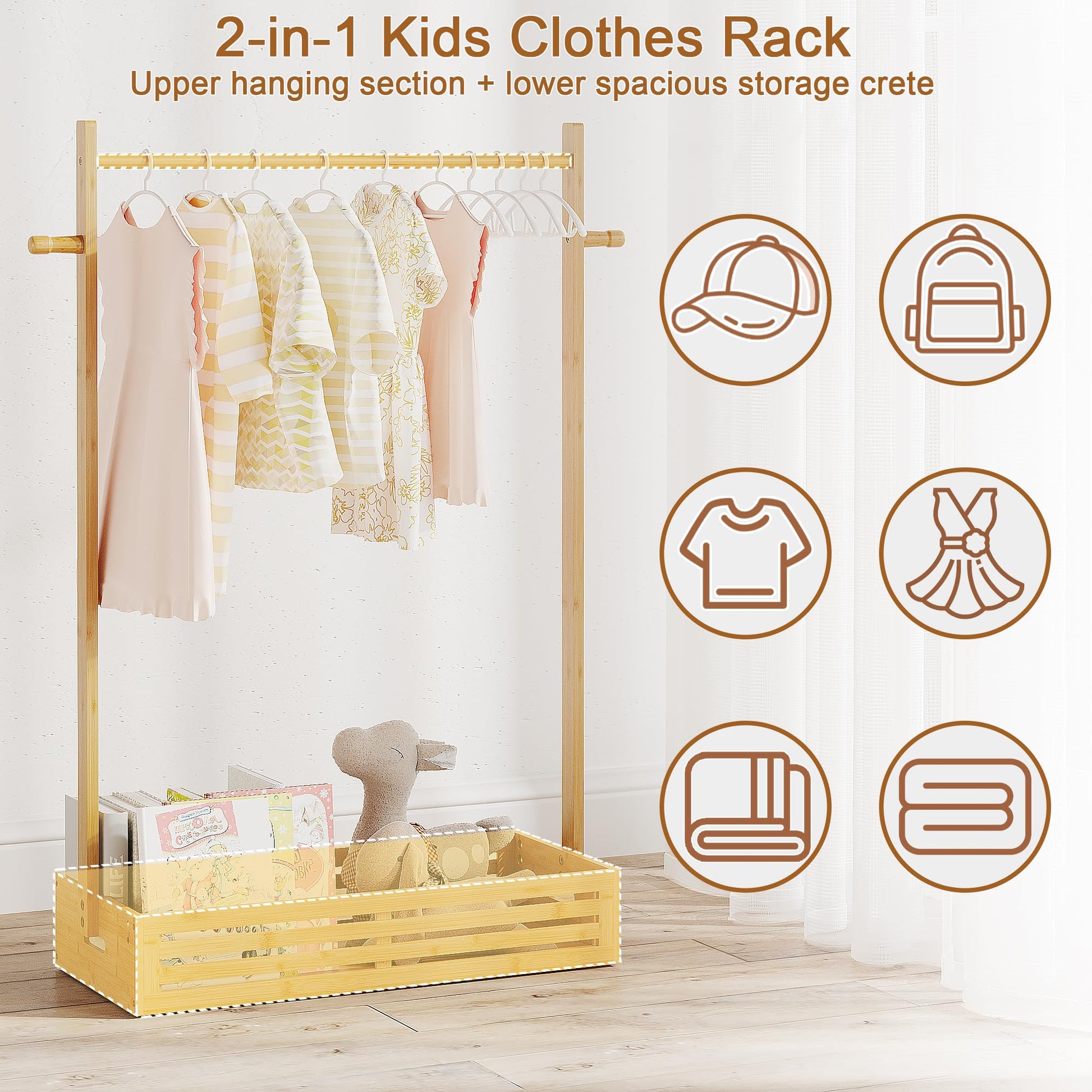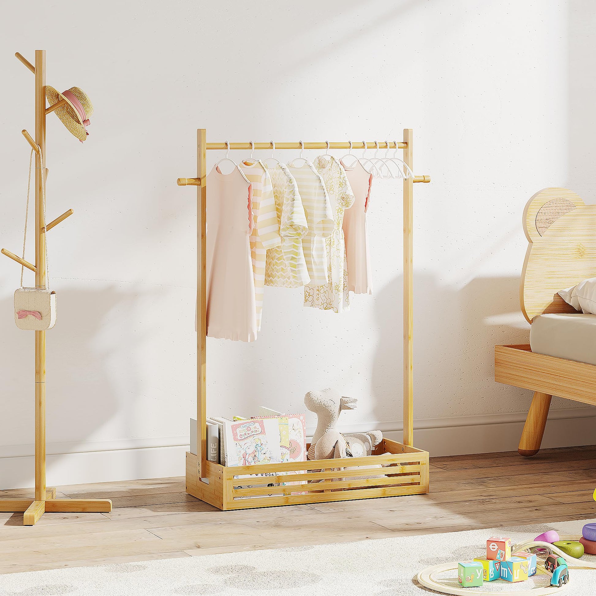 - DOUBLE FUNCTION This small coat rack with handle provides double functionality for storage and hanging. Compared to other baby clothes racks that only allow hanging, our baby clothes rack comes with a spacious storage box and an adjustable clothes rail. The bamboo design of the basket at the bottom provides enough space for plush toys, clothes, towels and more. The clothes rail is 54.5 cm long, which is enough to hang your baby or pet's clothes, and it can be fixed on the side or in the middle if necessary.