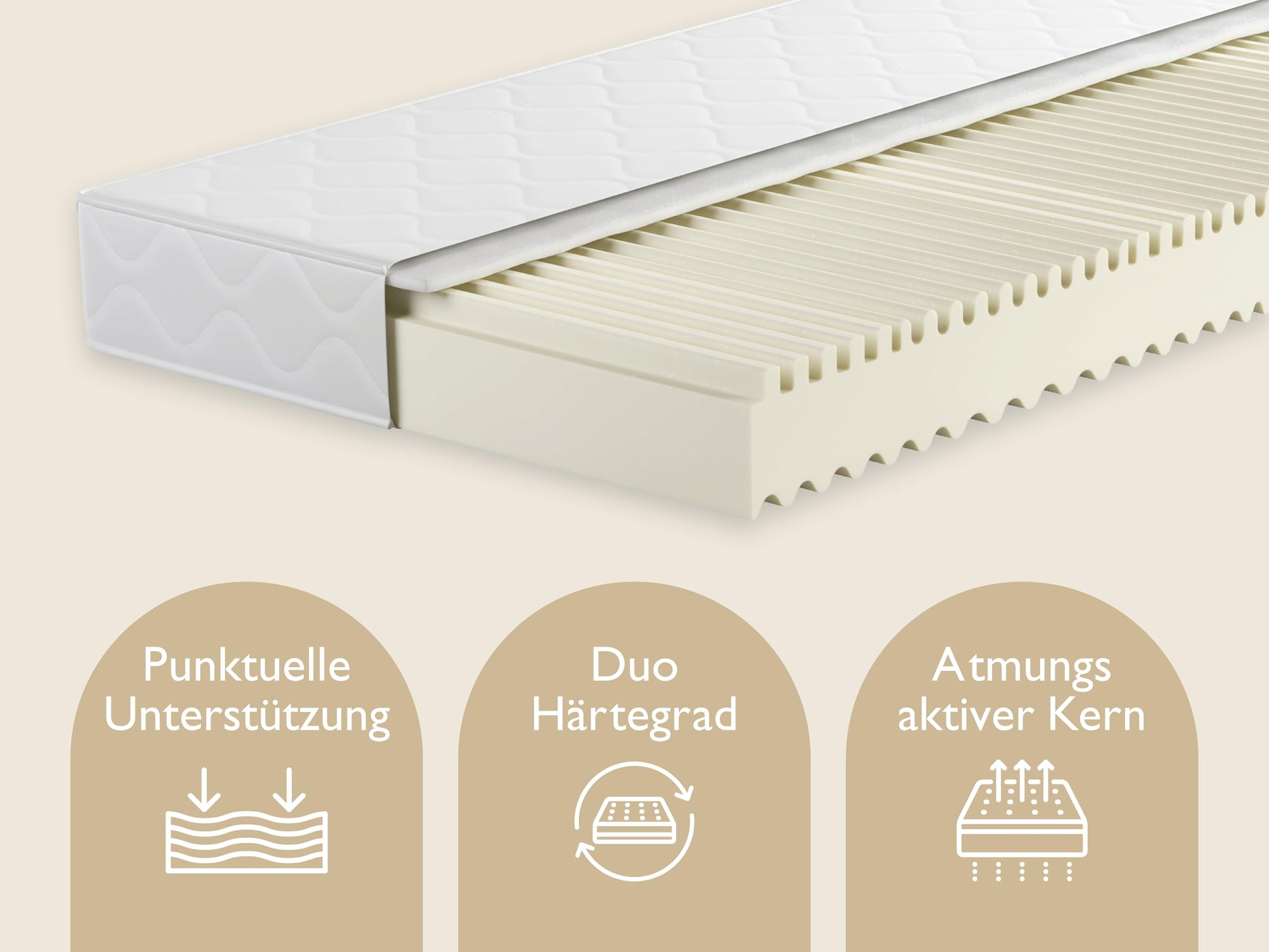 - OPTIMALER SCHLAFKOMFORT - Orthopädische 7-Zonen Duo 2 in 1 Komfortschaummatratze mit einer weichen und einer mittelfesten Schlafseite, Ausgezeichnete Anpassung an die Körperform, Geeignet für Bauch-, Seiten- oder Rückenschläfer