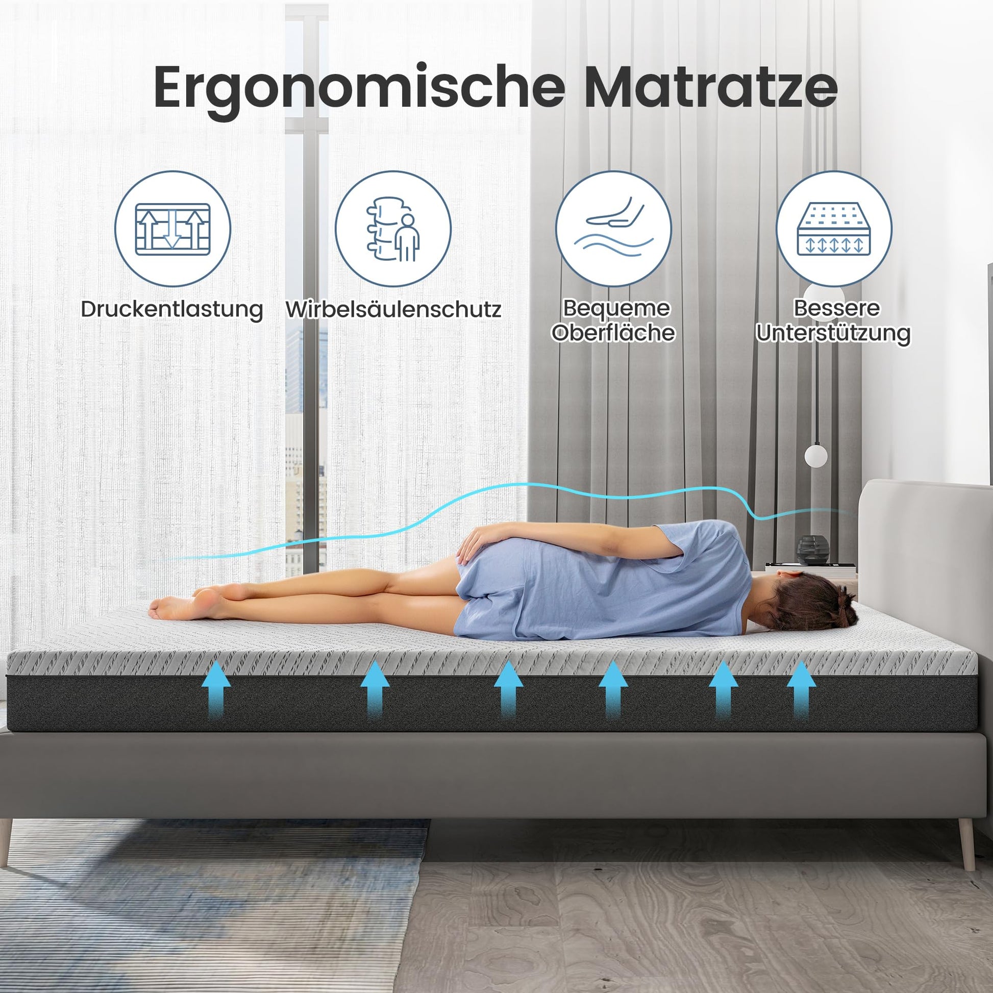 BedStory Mattress 180 x 200 cm Bamboo Charcoal Gel Foam, Height 18 cm, 7-Zone Memory Foam Mattress, Medium Hardness with Support, Removable and Washable Cover (180 x 200 x 18 cm)