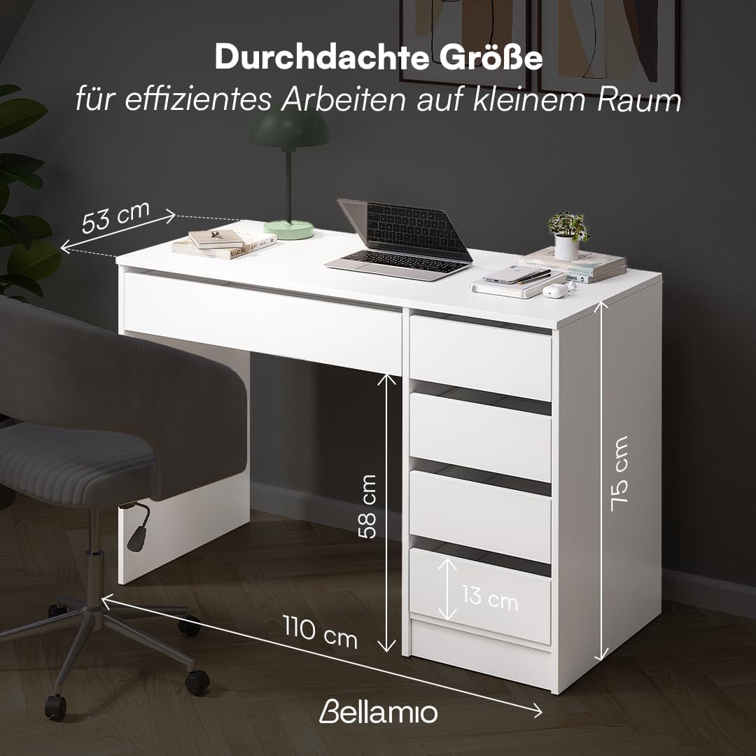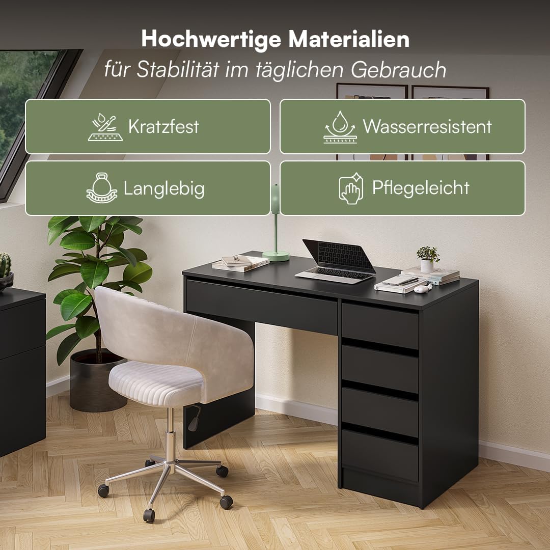Bellamio Nore Schreibtisch in Schwarz mit 5 Schubladen - Jugendschreibtisch 75x53x110 cm - Schminktisch & Schreibtisch Kombi - Computertisch mit Schubladen beidseitig montierbar – Bürotisch