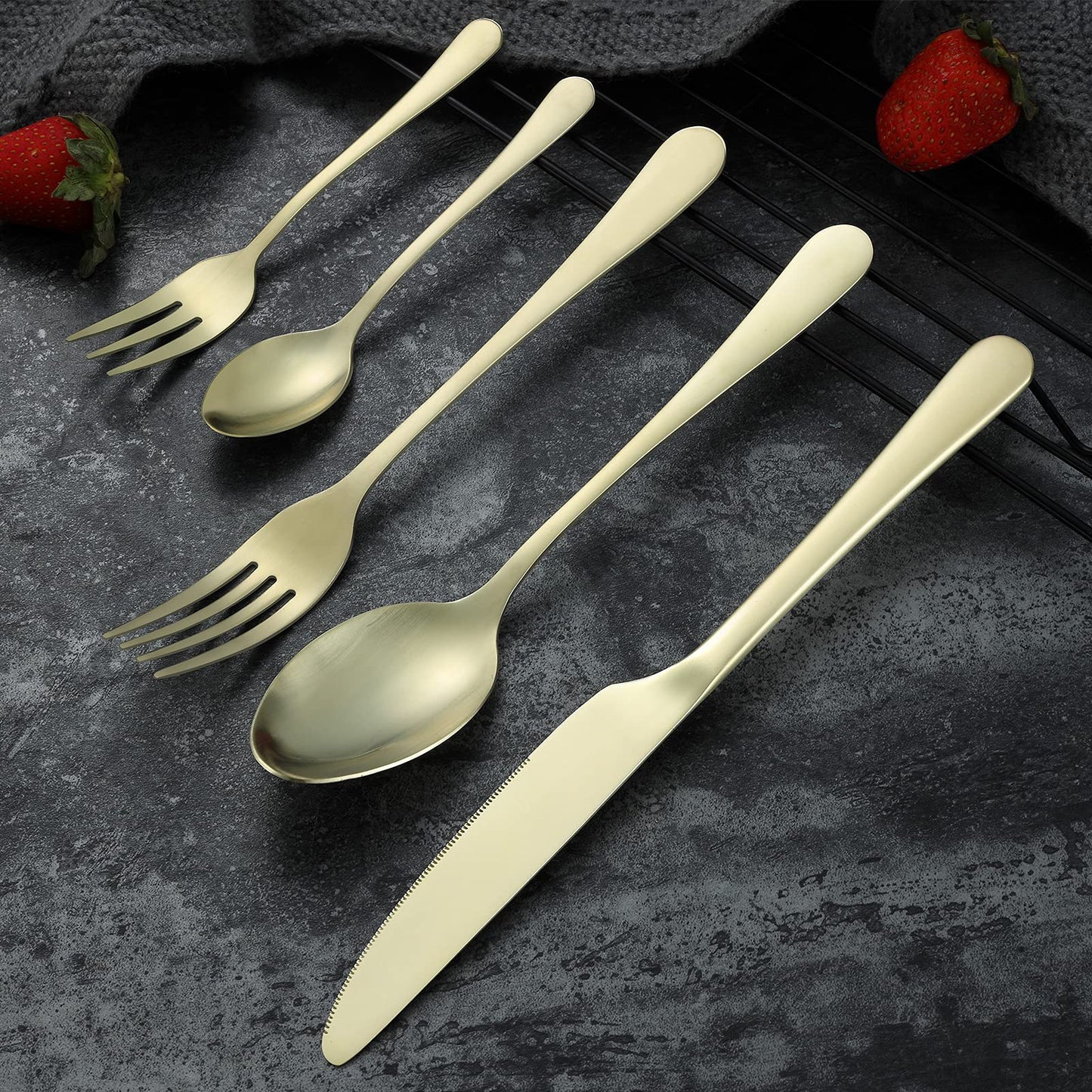 - 【Ergonomisches Design】Elegantes Erscheinungsbild mit schlichtem Design wird nicht aus der Mode kommen, was sich von anderem Besteck abhebt und eine exquisite Essszene schafft. Die glatte Oberfläche und das Hochglanzpolieren machen das Besteck ohne raue Stellen, die Ihre Lippen verletzen könnten. Außerdem ist der Griff dieses Bestecks ergonomisch geformt und 5 mm dick, was nicht zu schwer oder leicht ist, um bequemer zu halten.