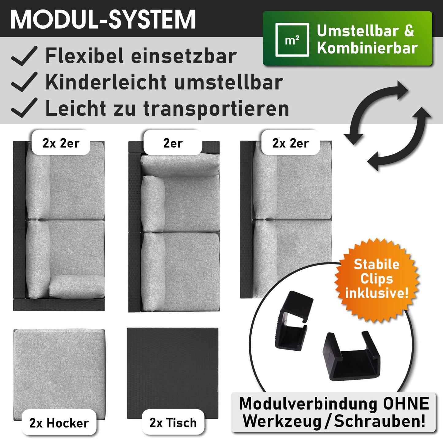 - 𝐓𝐞𝐜𝐡𝐧𝐢𝐬𝐜𝐡𝐞 𝐃𝐚𝐭𝐞𝐧: 2x 2-Sitzer-Sofa-Modul rechte Armlehne (BxTxH) 140x75x70cm, 2-Sitzer-Sofa-Modul linke Armlehne 140x75x70cm, 2x 2-Sitzer-Sofa-Modul je 130x75x70cm, 2 Hocker und 2 Loungetisch je 75x75x37cm (9tlg.), linker Flügel (BxTxH) 475x75x70cm, rechter Flügel 280x75x70cm, Sitzhöhe 37cm (mit Kissen 46cm), 12 Sitzkissen, 11 Rückenkissen, 2 Seitenkissen, Platz für 11 Personen, Belastbarkeit je Sitz 160kg (unter 40°C), Glasplatte aus Sicherheitsglas