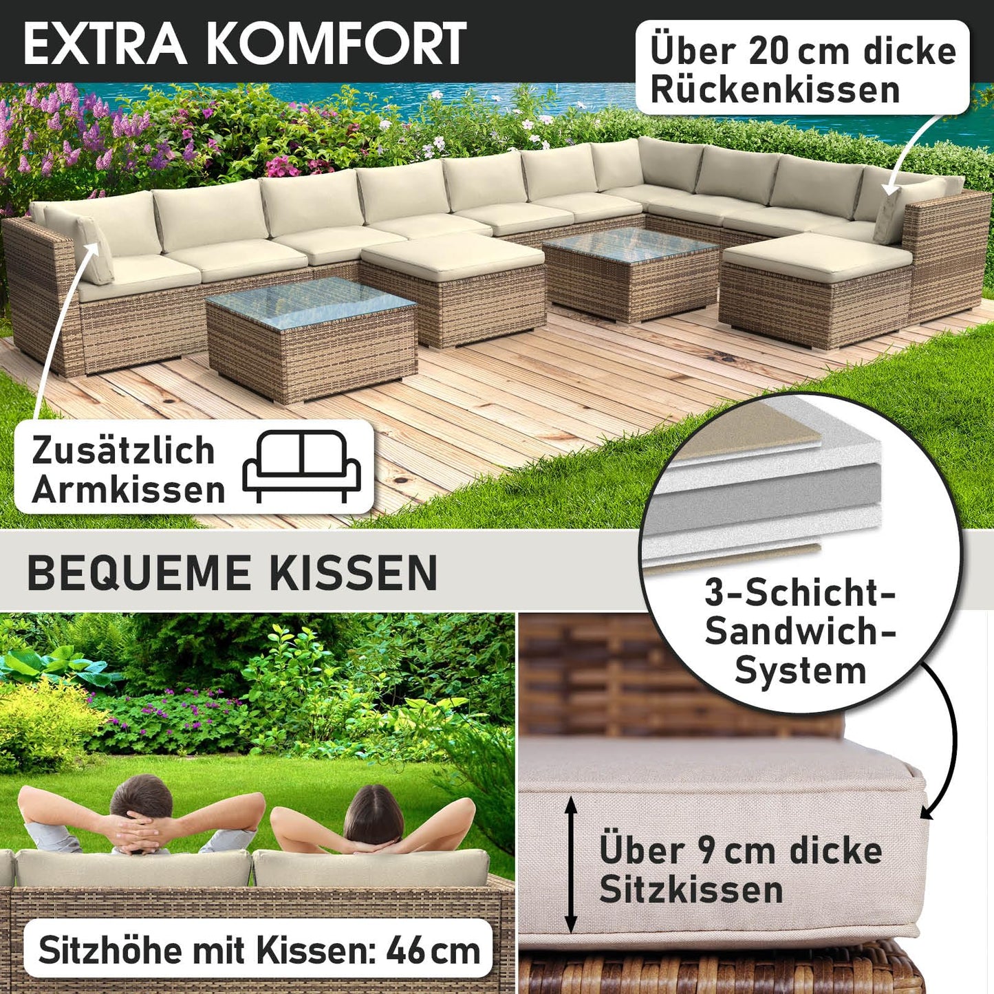 - 𝐄𝐱𝐭𝐫𝐚 𝐊𝐨𝐦𝐟𝐨𝐫𝐭: Der Kissenbezug unserer Rattan Gartenlounge aus edlem Leinen-Touch-Gewebe besticht nicht nur durch seine anspruchsvolle Optik, sondern fühlt sich auch ausgesprochen geschmeidig an. Die Kissen mit einem erheblich bequemeren 3-Schicht-Sandwich-System bieten einen exquisiten Sitzkomfort. Mit eindrucksvollen 9cm dicken Sitz- und 20cm dicken Rückenkissen verspricht unsere Lounge pure Entspannung