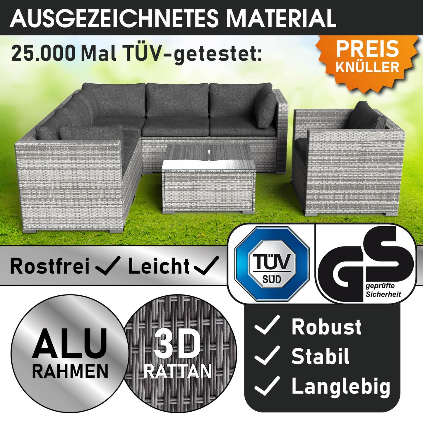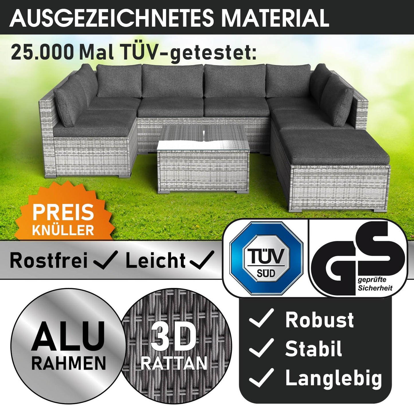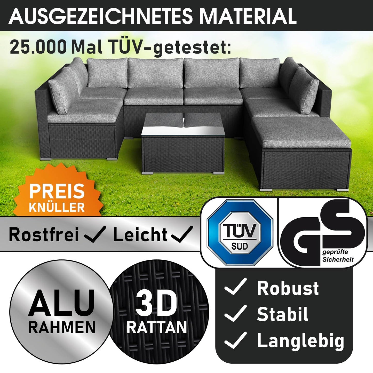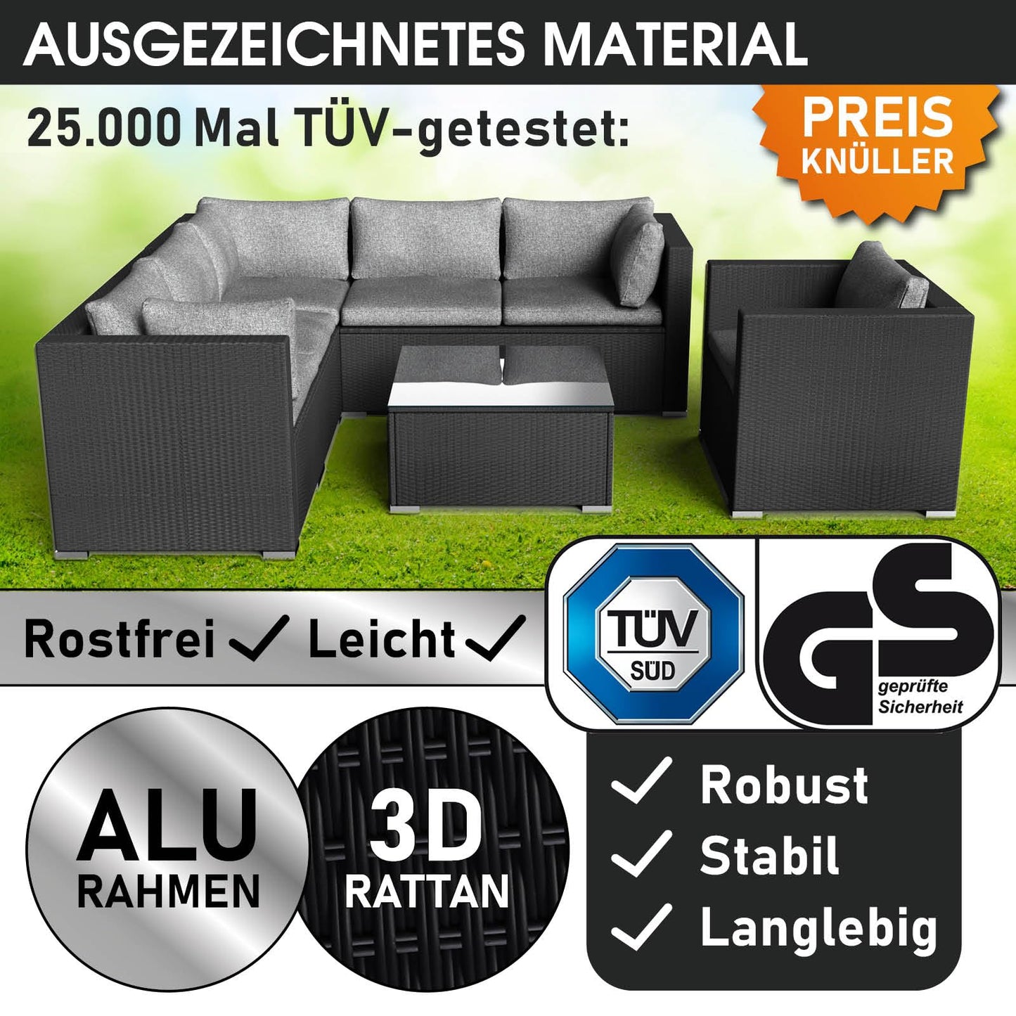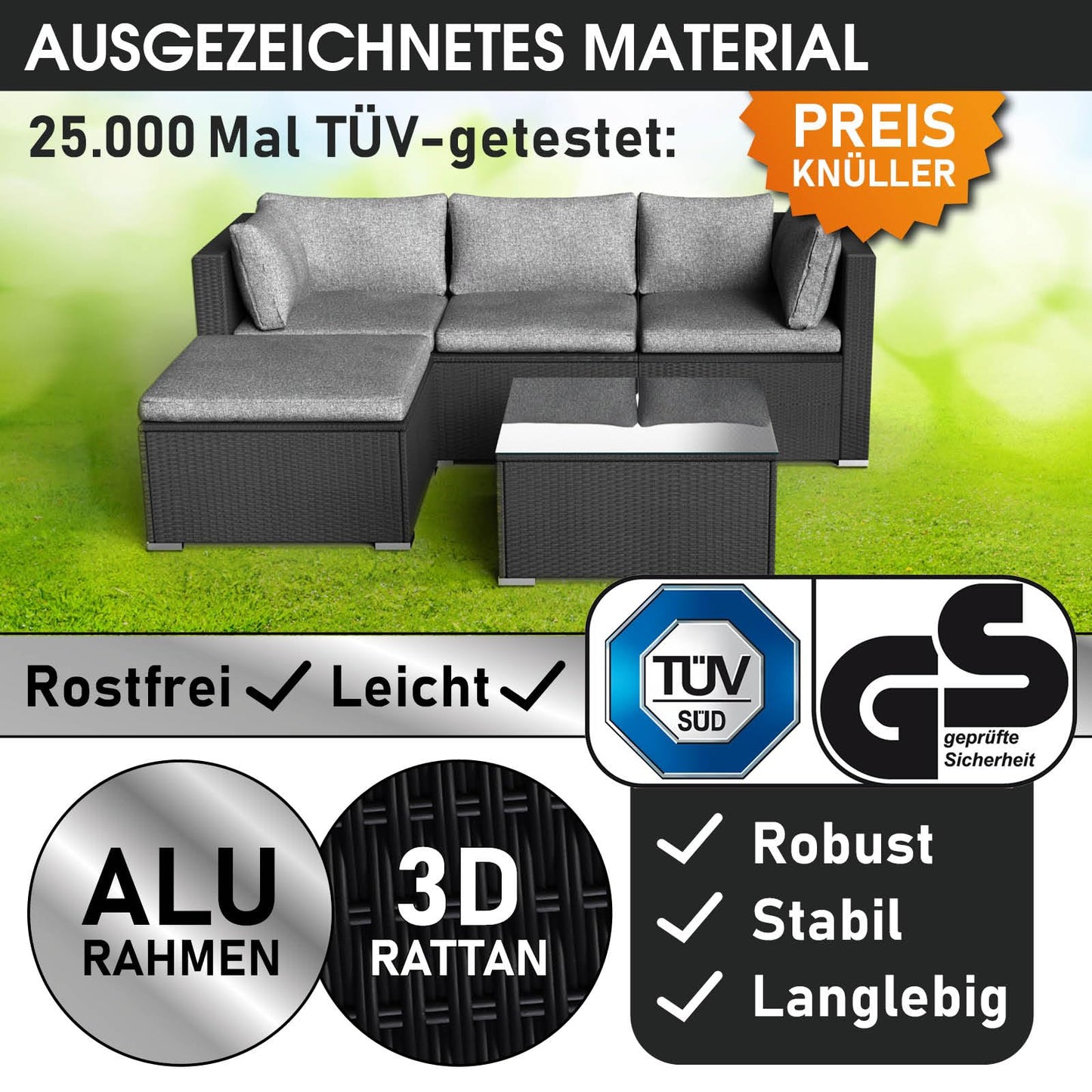 - 𝐆𝐞𝐩𝐫ü𝐟𝐭𝐞 𝐒𝐢𝐜𝐡𝐞𝐫𝐡𝐞𝐢𝐭: Unsere Alu Garten Lounge setzt neue Maßstäbe in puncto Sicherheit und gehört zu den wenigen Gartenmöbeln ihrer Klasse mit TÜV/GS-Zertifizierung. Über 25.000 Belastungs- und Stabilitätstests belegen eindrucksvoll ihre außergewöhnliche Zuverlässigkeit. Das robuste Aluminiumgestell trägt mühelos bis zu 160 kg pro Sitz (bei Temperaturen unter 40 °C), während das hochwertig verarbeitete Rattan-Geflecht durch besondere Langlebigkeit und Stabilität überzeugt. Zertifiziert mit der Zertifikatsnummer Z1A 079808 0047 Rev. 00 – weitere Informationen finden Sie in der TÜV SÜD Zertifizierungsdatenbank