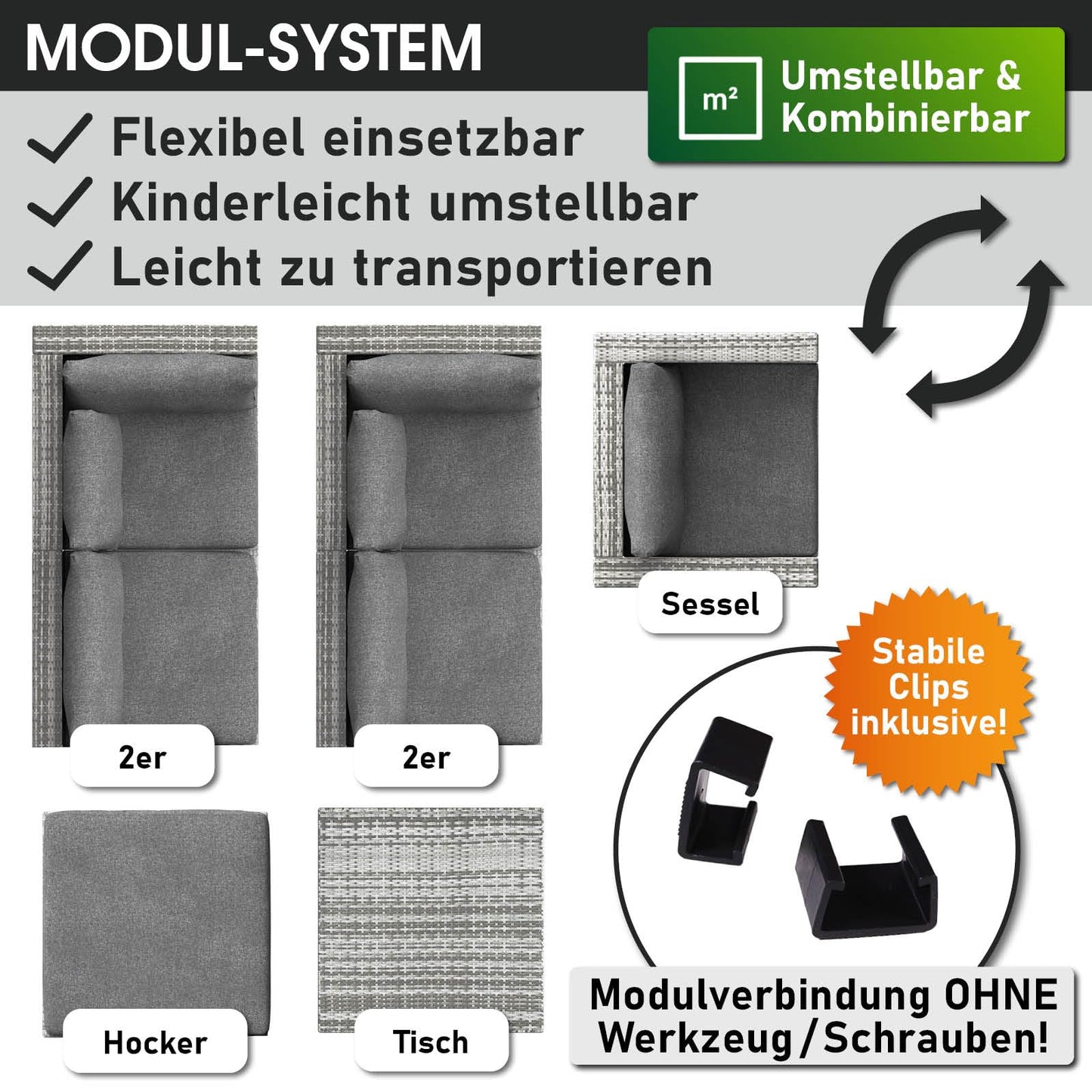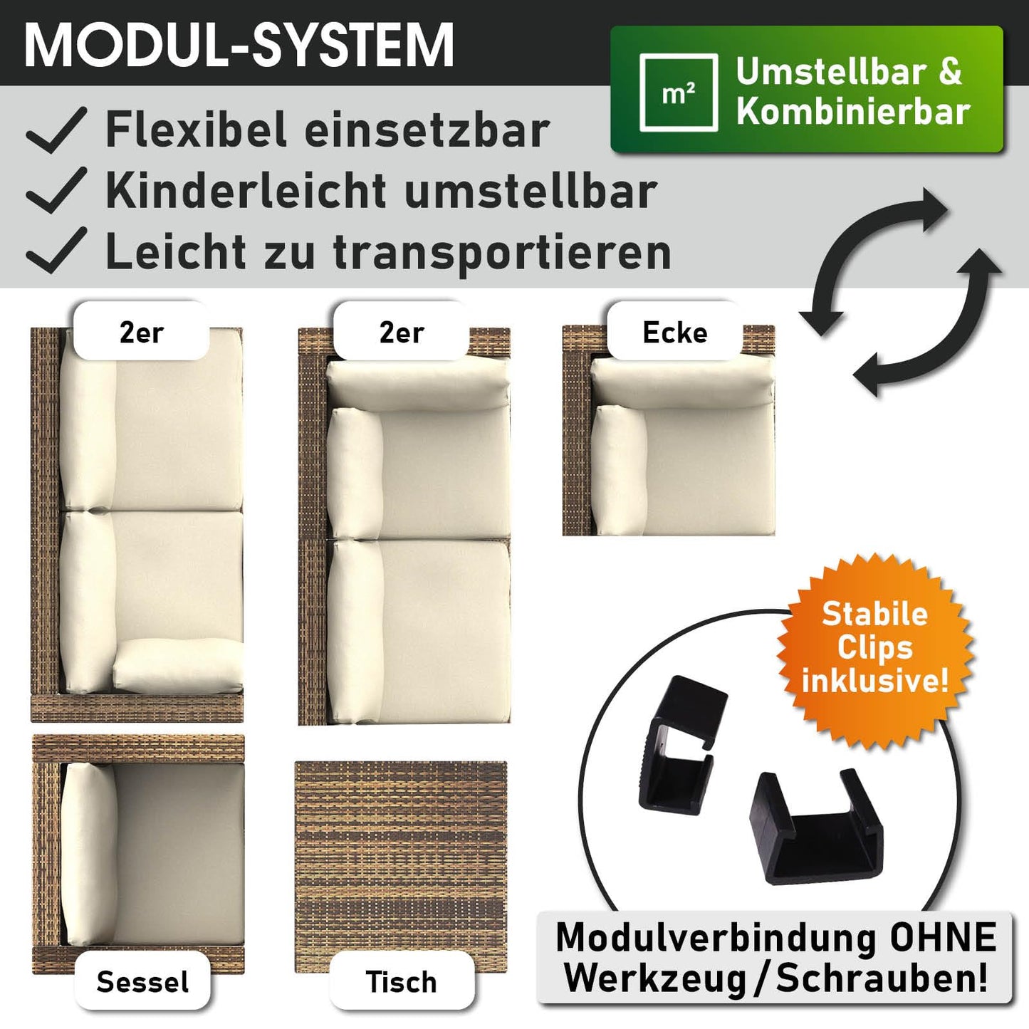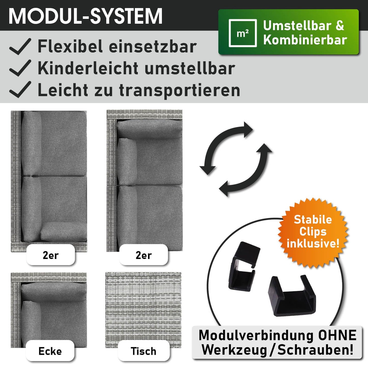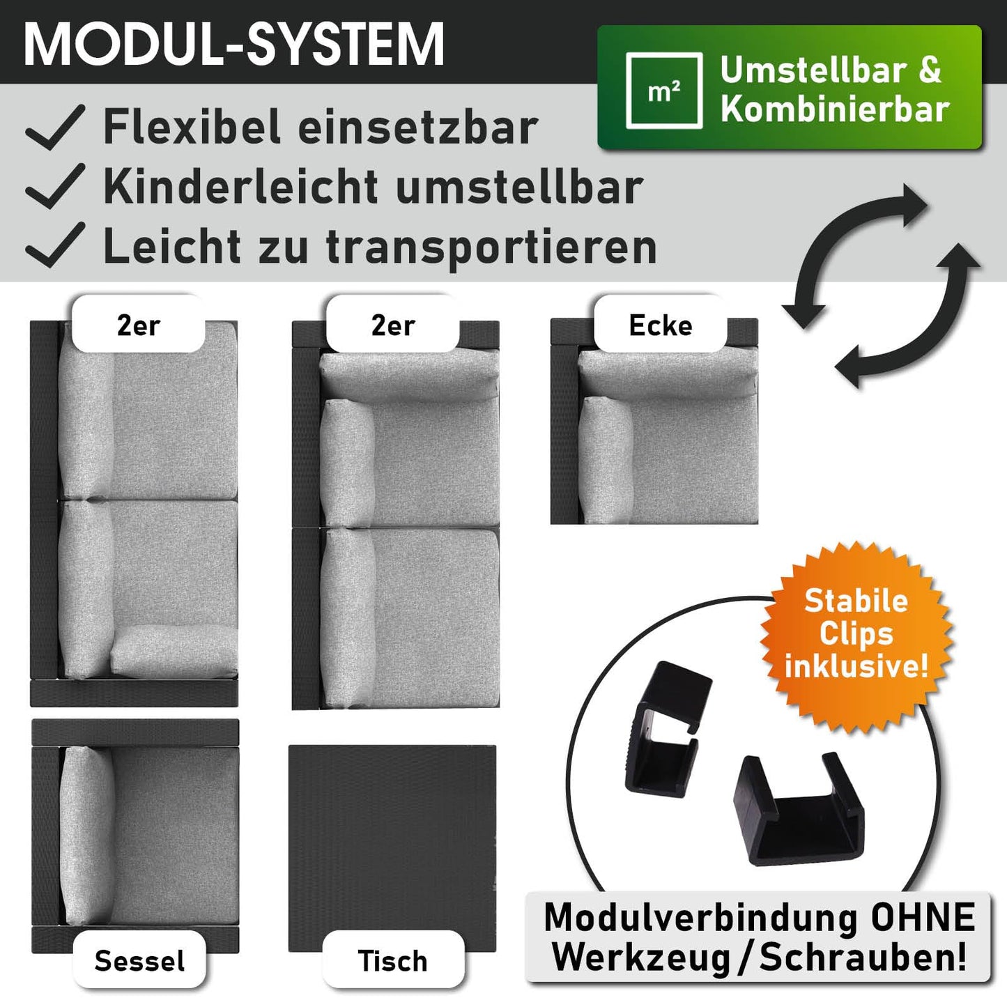 - 𝐓𝐞𝐜𝐡𝐧𝐢𝐬𝐜𝐡𝐞 𝐃𝐚𝐭𝐞𝐧: 2-Sitzer-Sofa-Modul mit rechter Lehne (BxTxH) 140x75x70cm, 2-Sitzer-Sofa-Modul linke Armlehne (BxTxH) 140x75x70cm, Ecksofa-Modul (BxTxH) 75x75x70cm, 1 Sessel mit Armlehnen (BxTxH) 85x75x70cm, Loungetisch (BxTxH) 75x75x37cm (5tlg.), Flügel je (BxTxH) 215x75x70cm, Sitzhöhe 37cm (mit Kissen 46cm), 6 Sitzkissen, 7 Rückenkissen, 2 Seitenkissen, Platz für 5 Personen, Belastbarkeit je Sitz 160kg (unter 40°C), Glasplatte aus Sicherheitsglas
