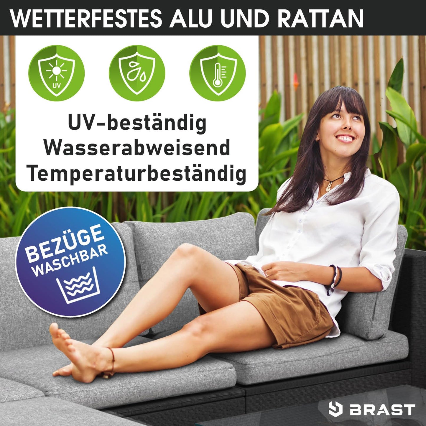 - 𝐄𝐱𝐤𝐥𝐮𝐬𝐢𝐯𝐞 𝐐𝐮𝐚𝐥𝐢𝐭ä𝐭𝐬𝐠𝐚𝐫𝐚𝐧𝐭𝐢𝐞: Unser BRAST Rattan Lounge Set steht für erstklassige Verarbeitung und Langlebigkeit. Mit einem hochwertigen Aluminium-Gestell und rostfreien Edelstahlschrauben garantieren wir Leichtigkeit und Stabilität. Das elegante 3-dimensionale Halbrundrattan überzeugt nicht nur optisch, sondern ist dank seiner Robustheit perfekt für den Einsatz im Freien geeignet