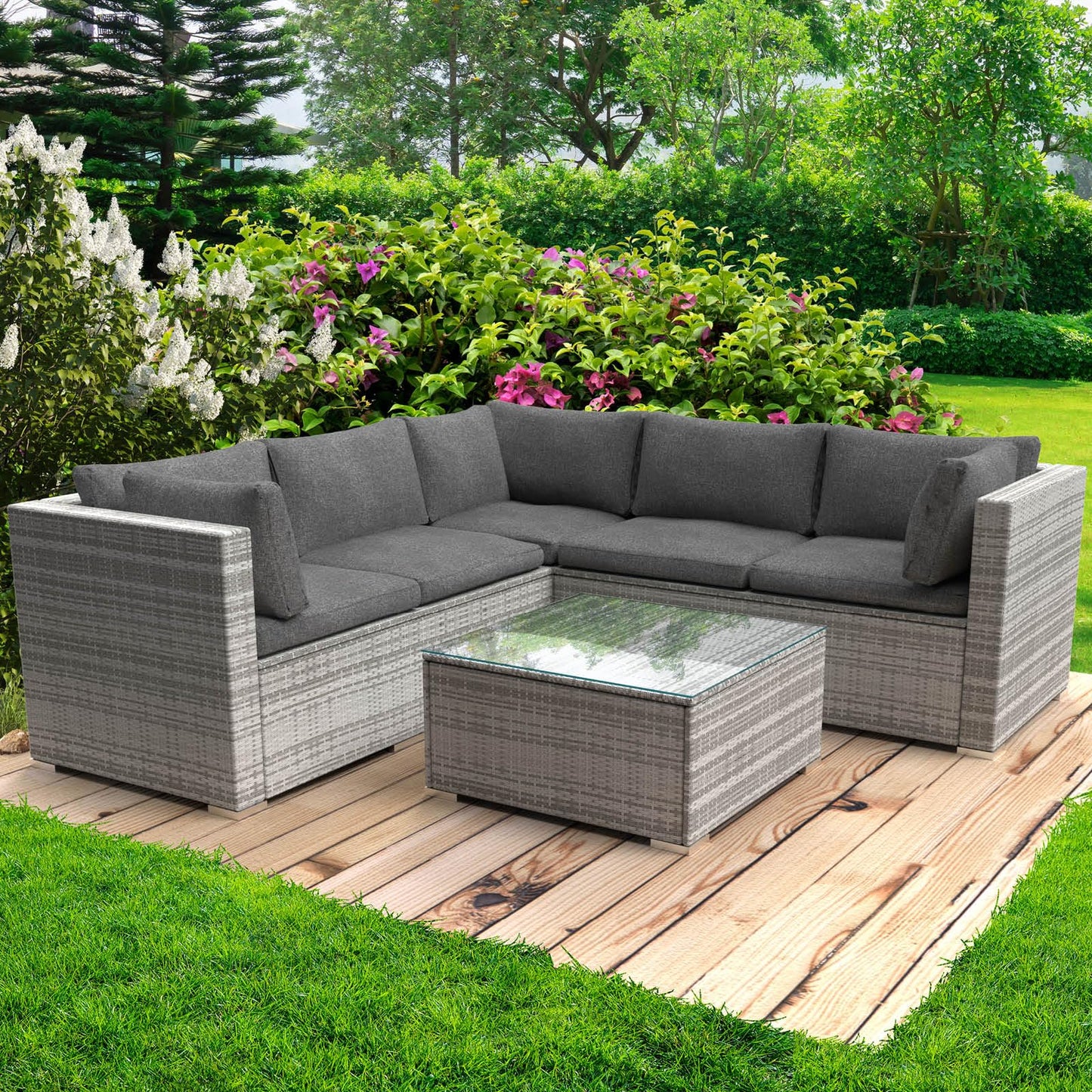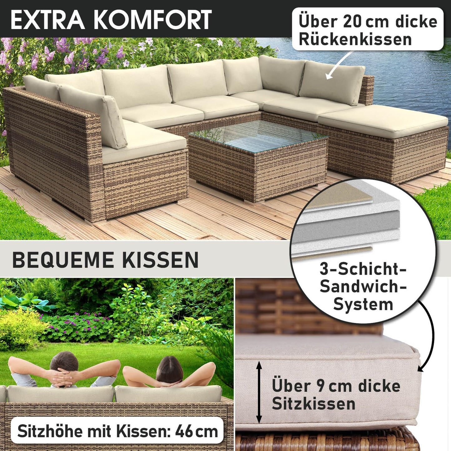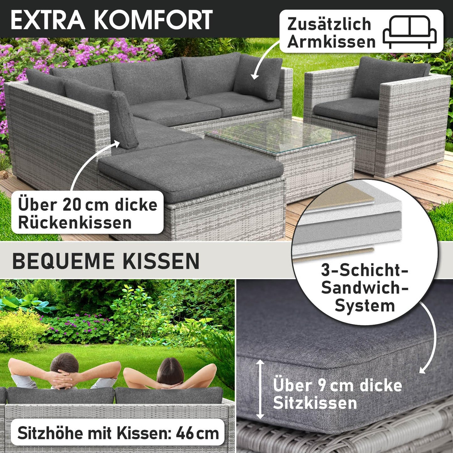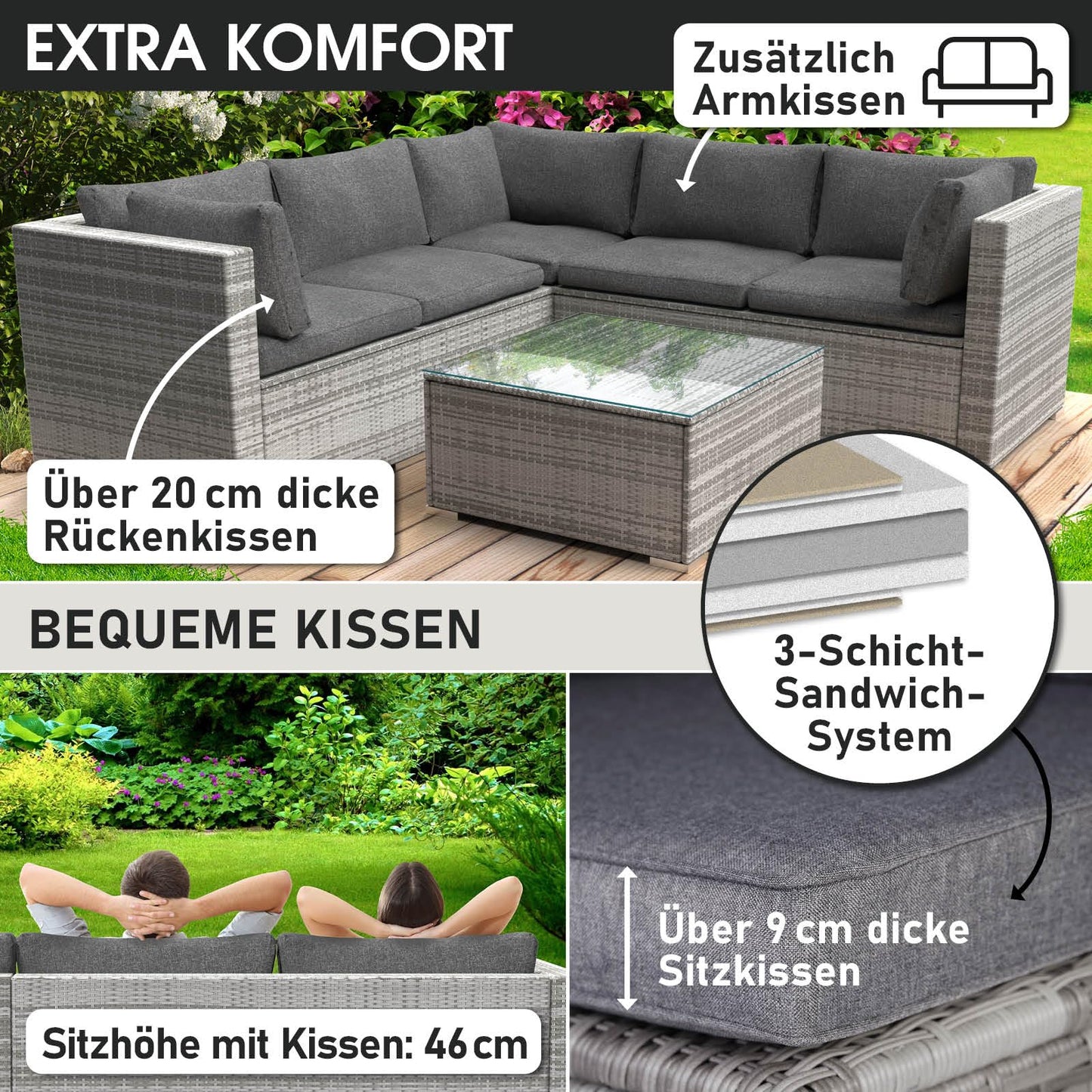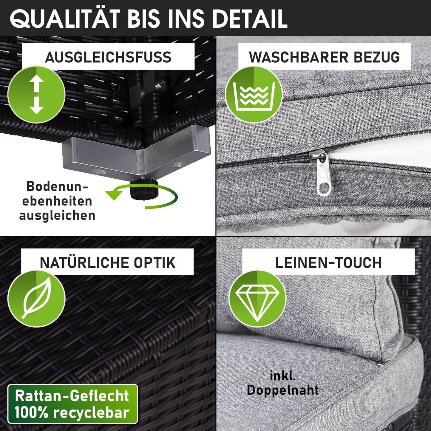 - 𝐄𝐱𝐭𝐫𝐚 𝐊𝐨𝐦𝐟𝐨𝐫𝐭: Der Kissenbezug unserer Rattan Gartenlounge aus edlem Leinen-Touch-Gewebe besticht nicht nur durch seine anspruchsvolle Optik, sondern fühlt sich auch ausgesprochen geschmeidig an. Die Kissen mit einem erheblich bequemeren 3-Schicht-Sandwich-System bieten einen exquisiten Sitzkomfort. Mit eindrucksvollen 9cm dicken Sitz- und 20cm dicken Rückenkissen verspricht unsere Lounge pure Entspannung