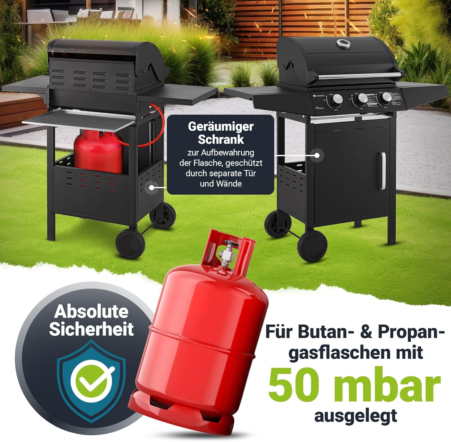 - For butane and propane: The barbecue grill is designed for butane and propane gas cylinders with 50 mbar, and the gas cylinder can be stored in the spacious cabinet with doors under the BBQ.
