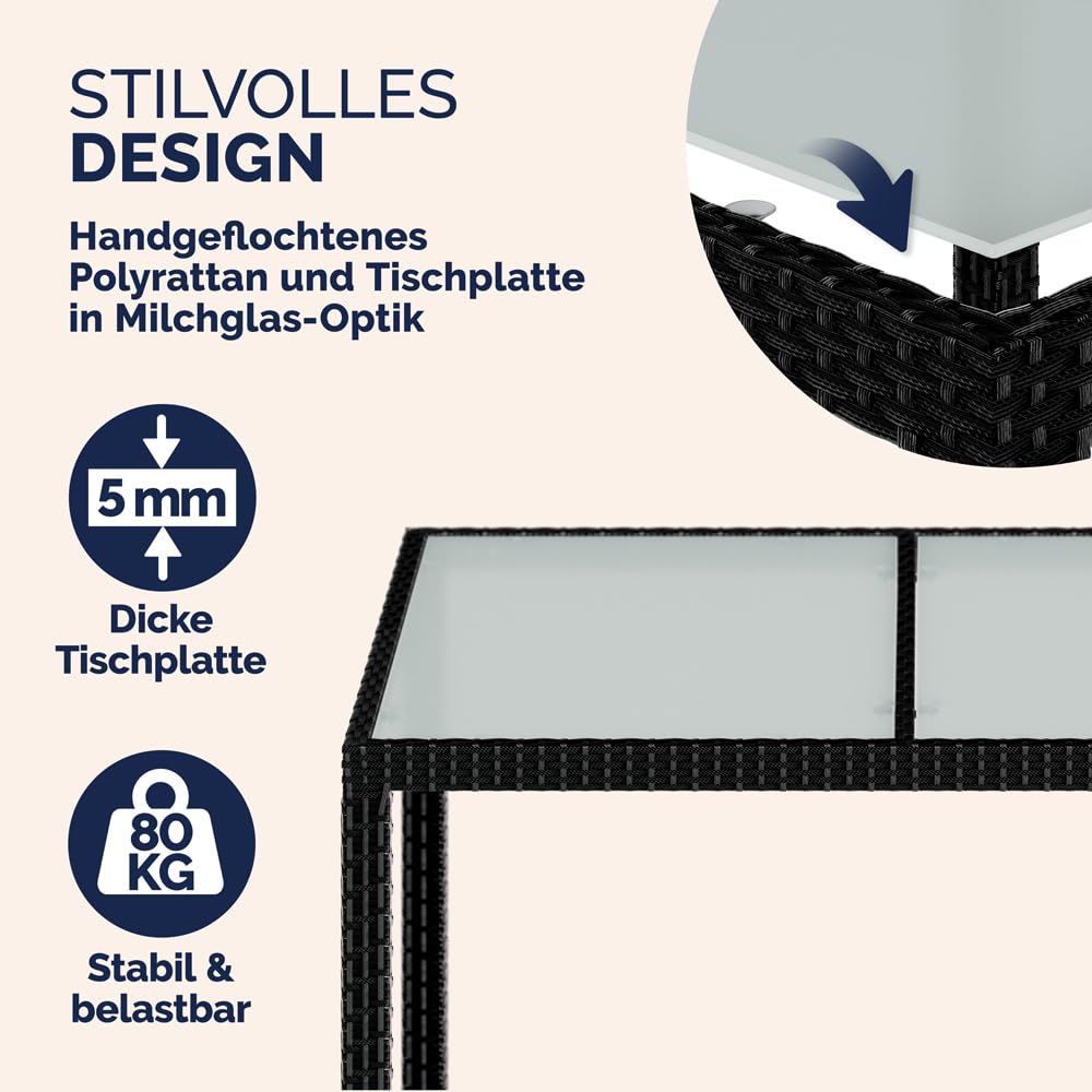 - WETTERFEST, ROBUST & SICHER: Das handgewobene Polyrattan ist wetterfest, UV-beständig und schmutzabweisend. Das pulverbeschichtete Stahlgestell und die 5mm dicke Sicherheitsglasplatte sorgen für Stabilität und Langlebigkeit - der Tisch trägt bis zu 80kg, die Gartensessel bis zu 160kg.