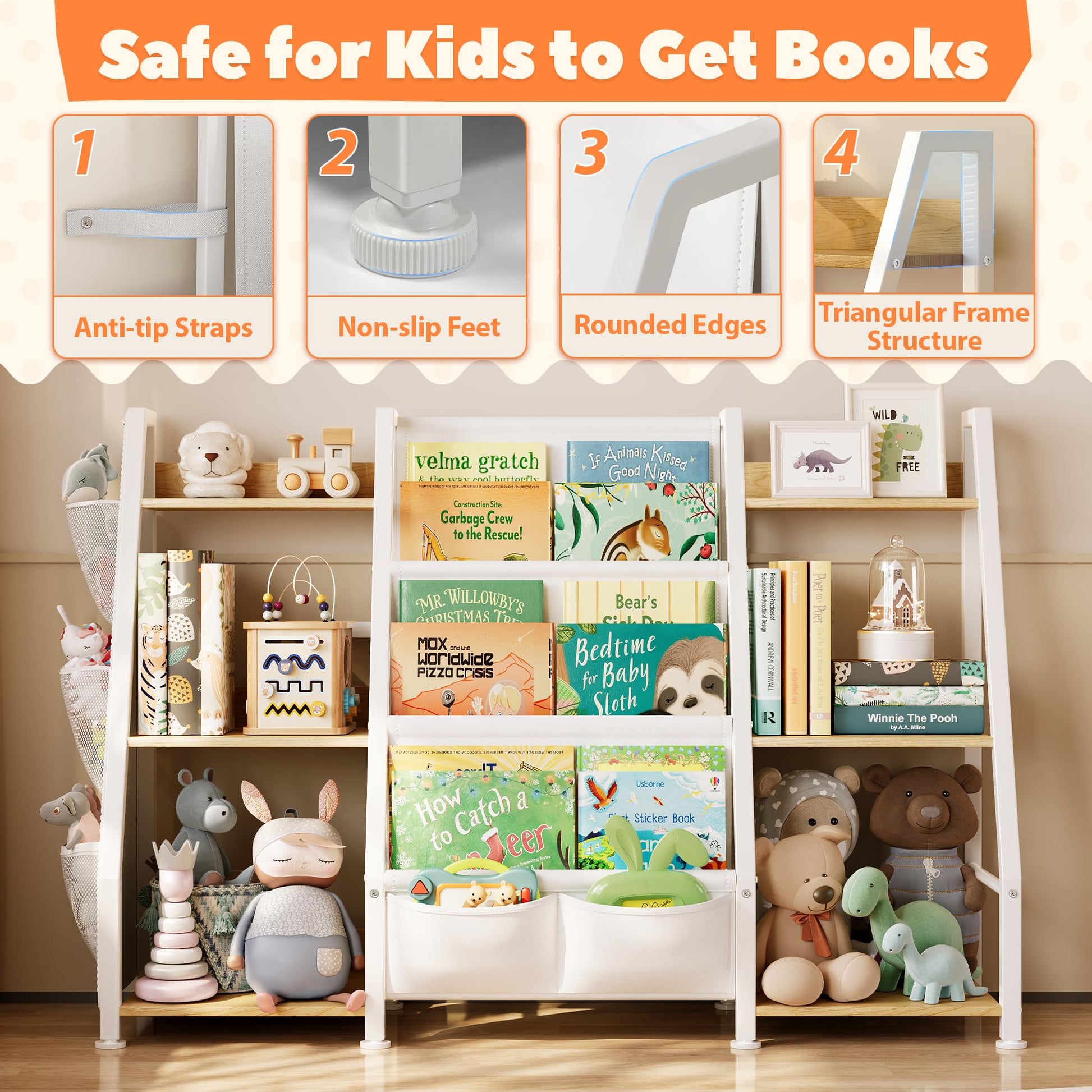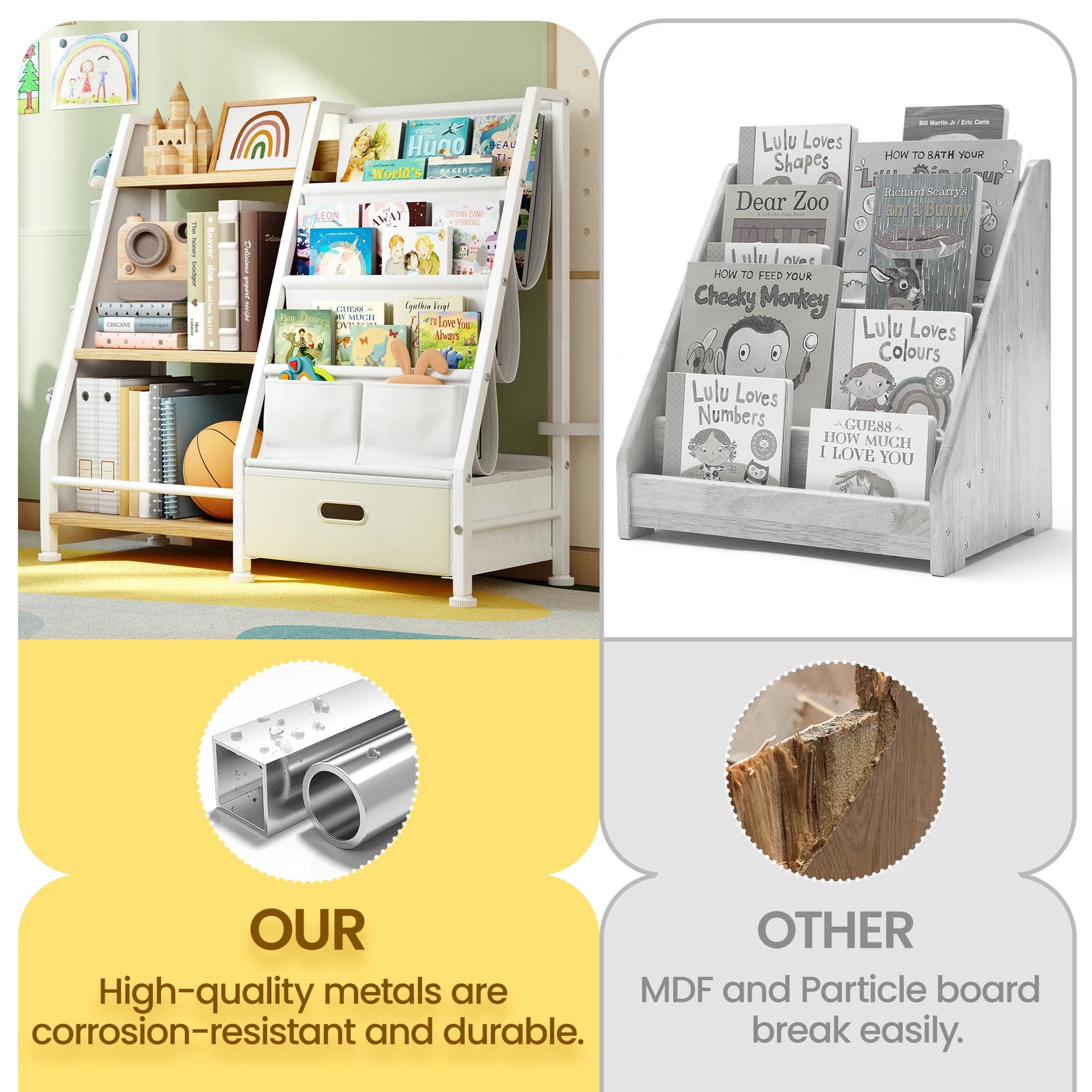 - 2-in-1 children's shelf: shelves for storing children's toys and children's books. The standing bookcase is equipped with 3-tier fabric-covered storage compartments for storing children's books. The book cover of the book faces outwards so that toddlers can easily recognise it.