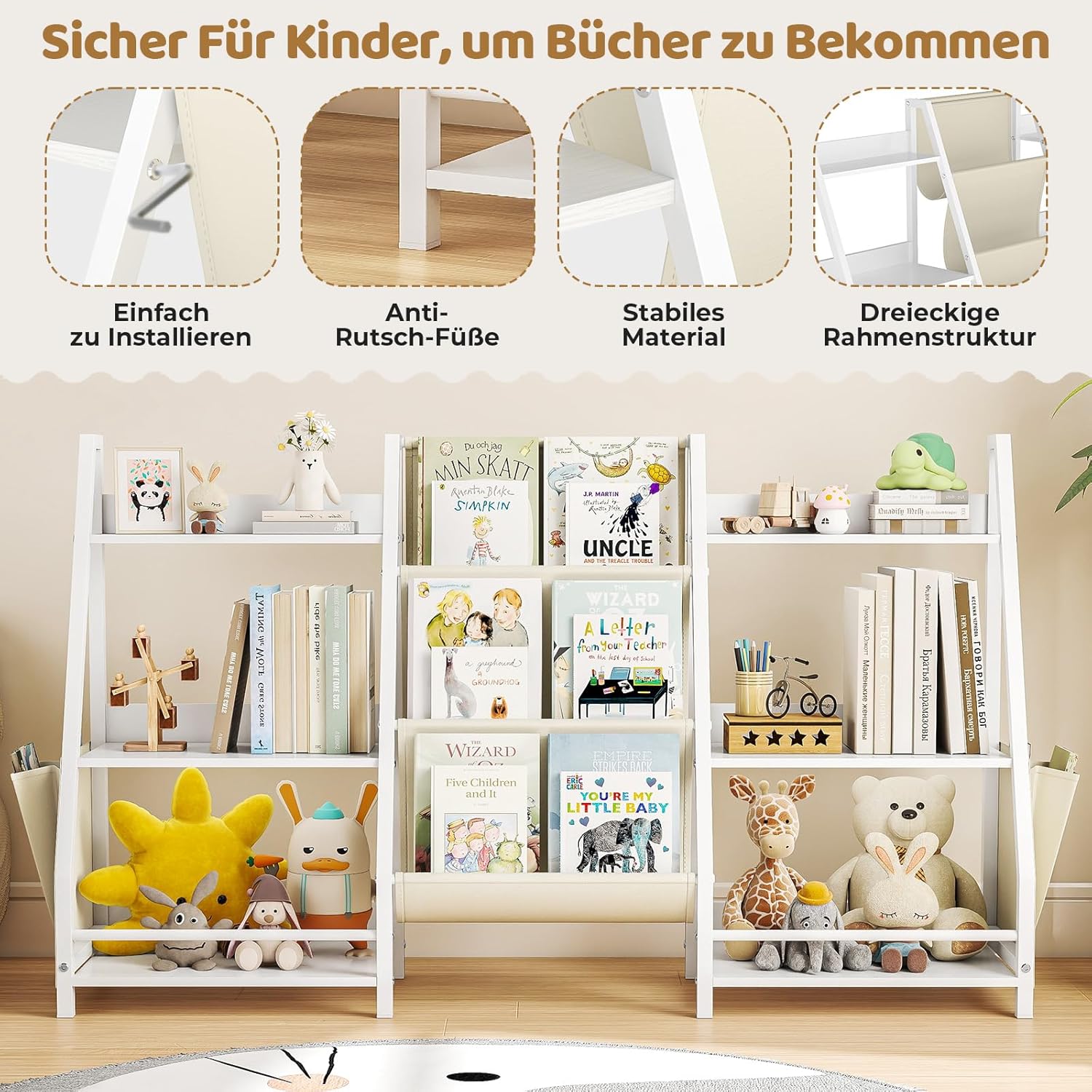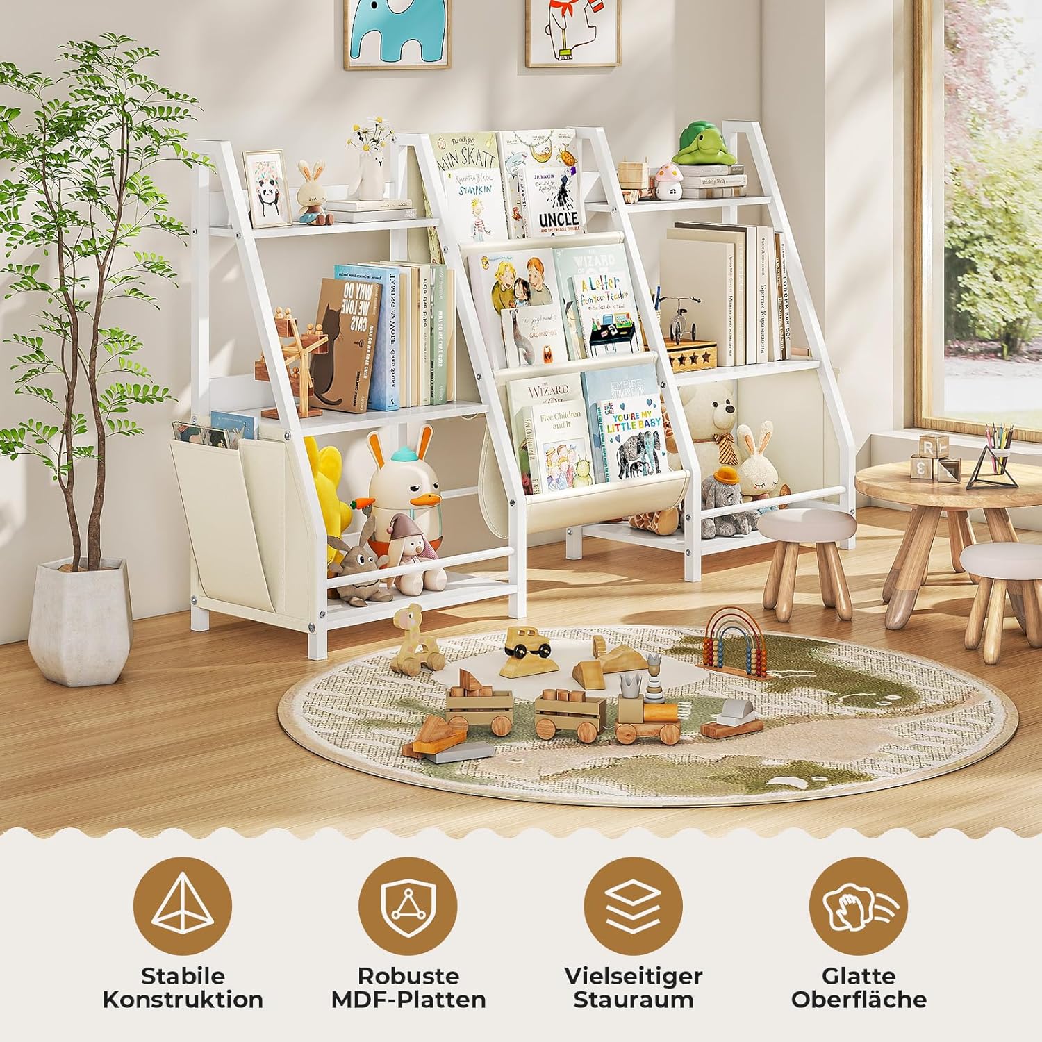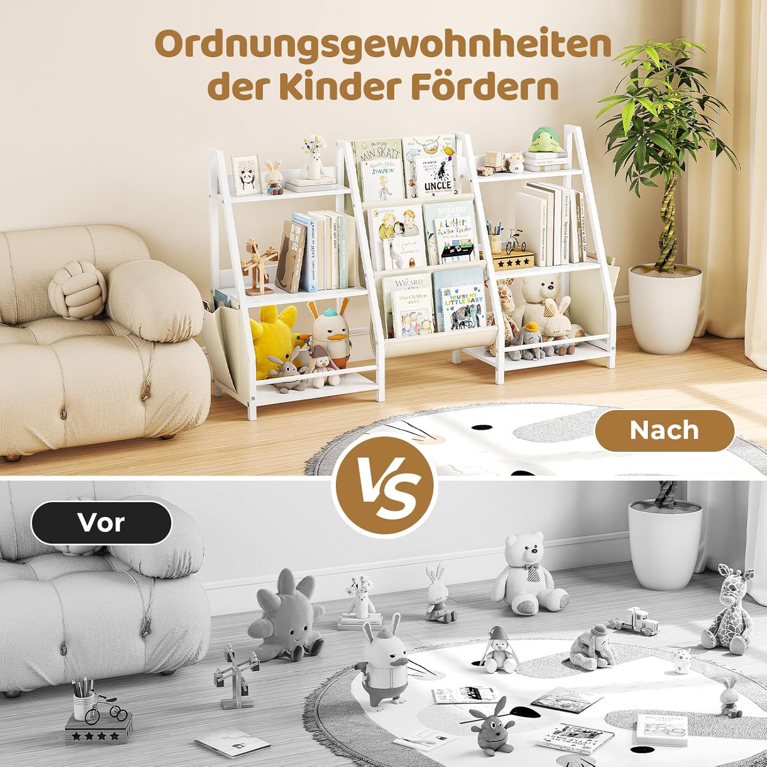 - 2-in-1 children's shelf: shelves for storing children's toys and children's books. The standing bookcase is equipped with 3-tier fabric-covered storage compartments for storing children's books. The book cover of the book points outwards so that toddlers can easily recognise it, awaken attention and interest.