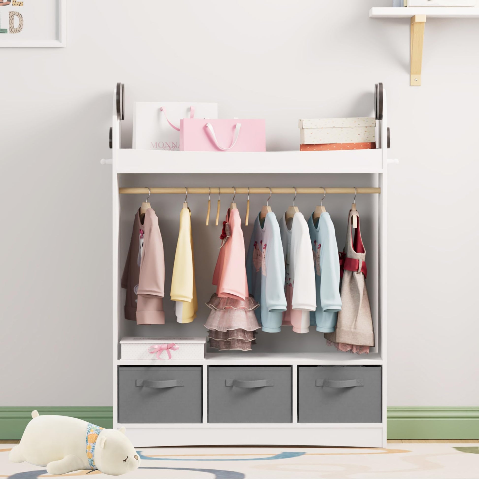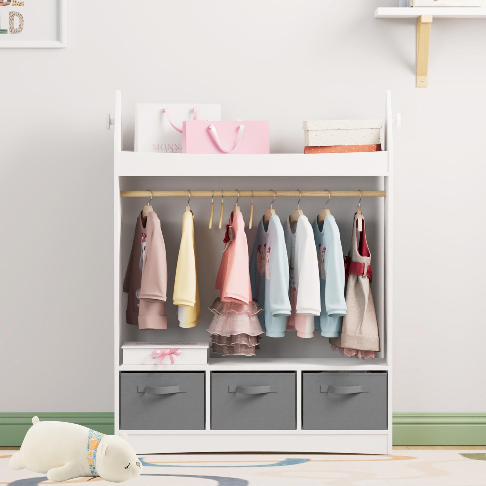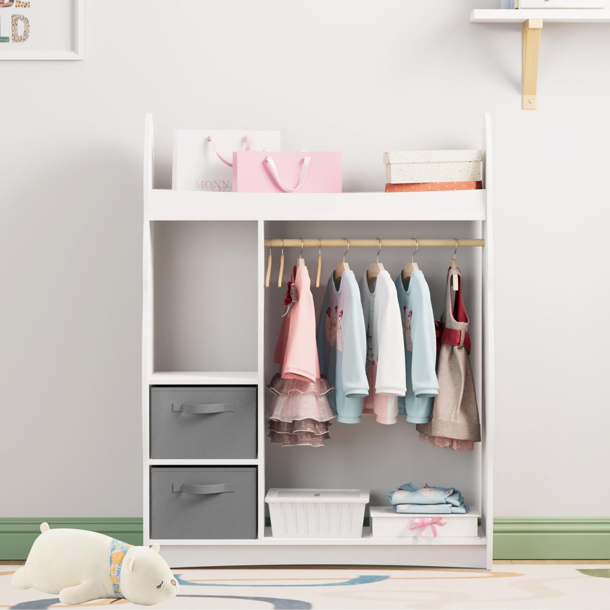 - Enough Storage Space: This children's wardrobe has open shelves or drawers and a clothes rail, meeting the diverse storage needs of children. Children can freely store their clothes, toys, books, shoes and other items in the wardrobe. The additional coat hooks on the side are suitable for jackets or school bags.