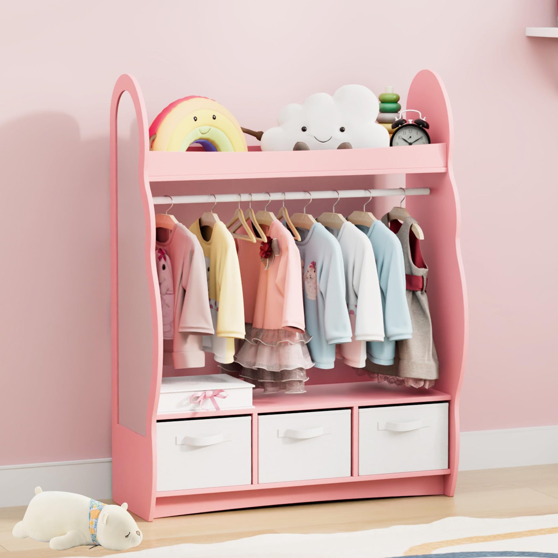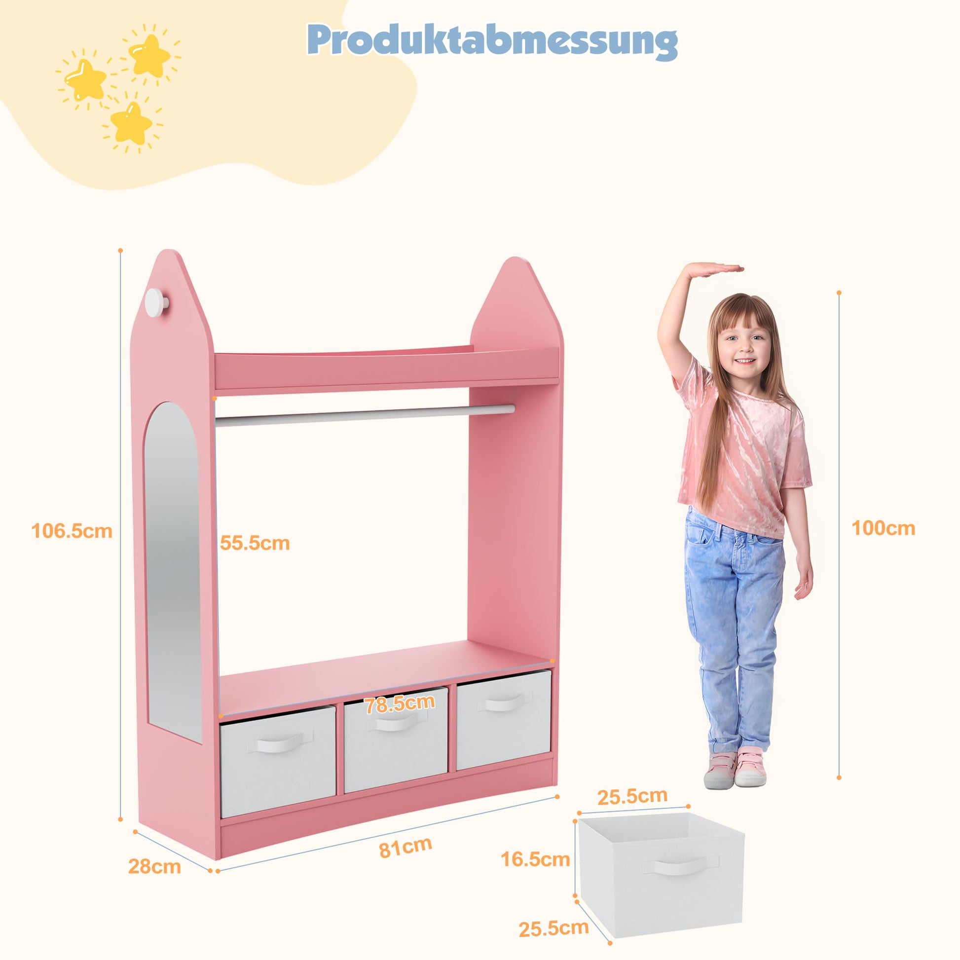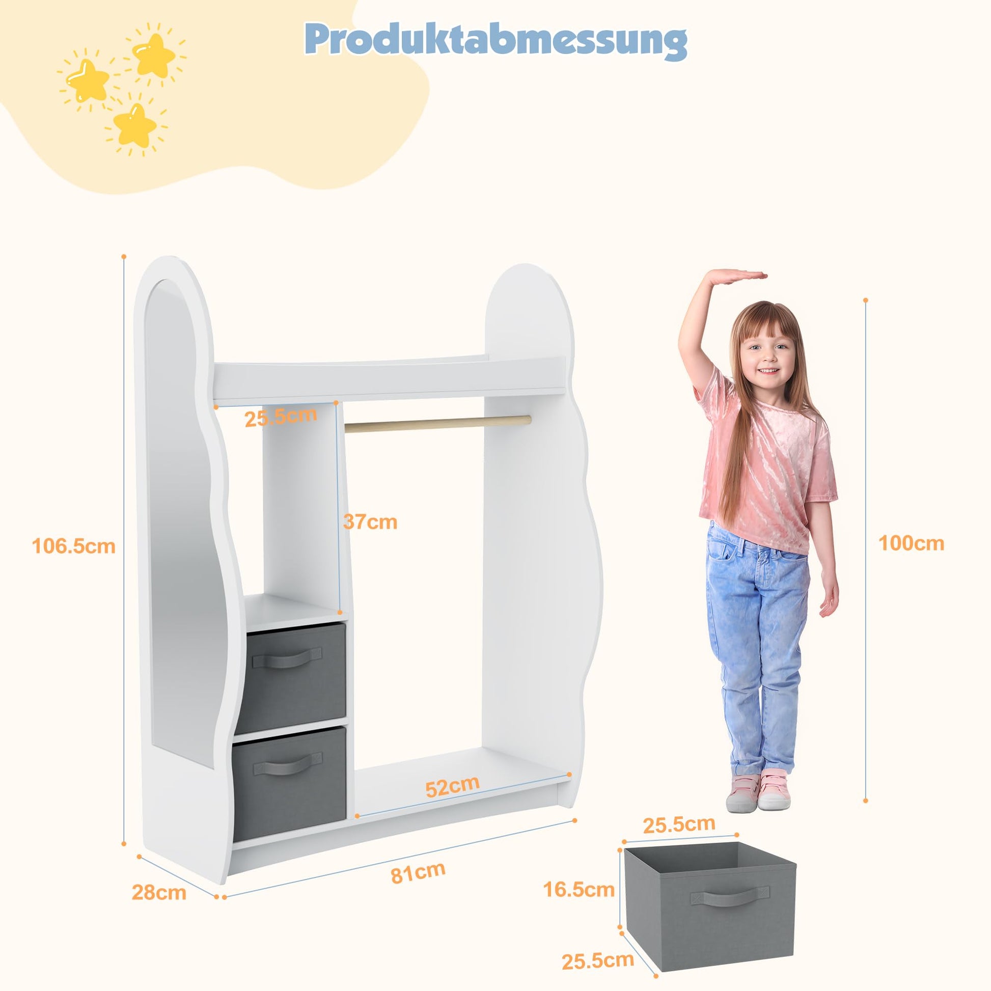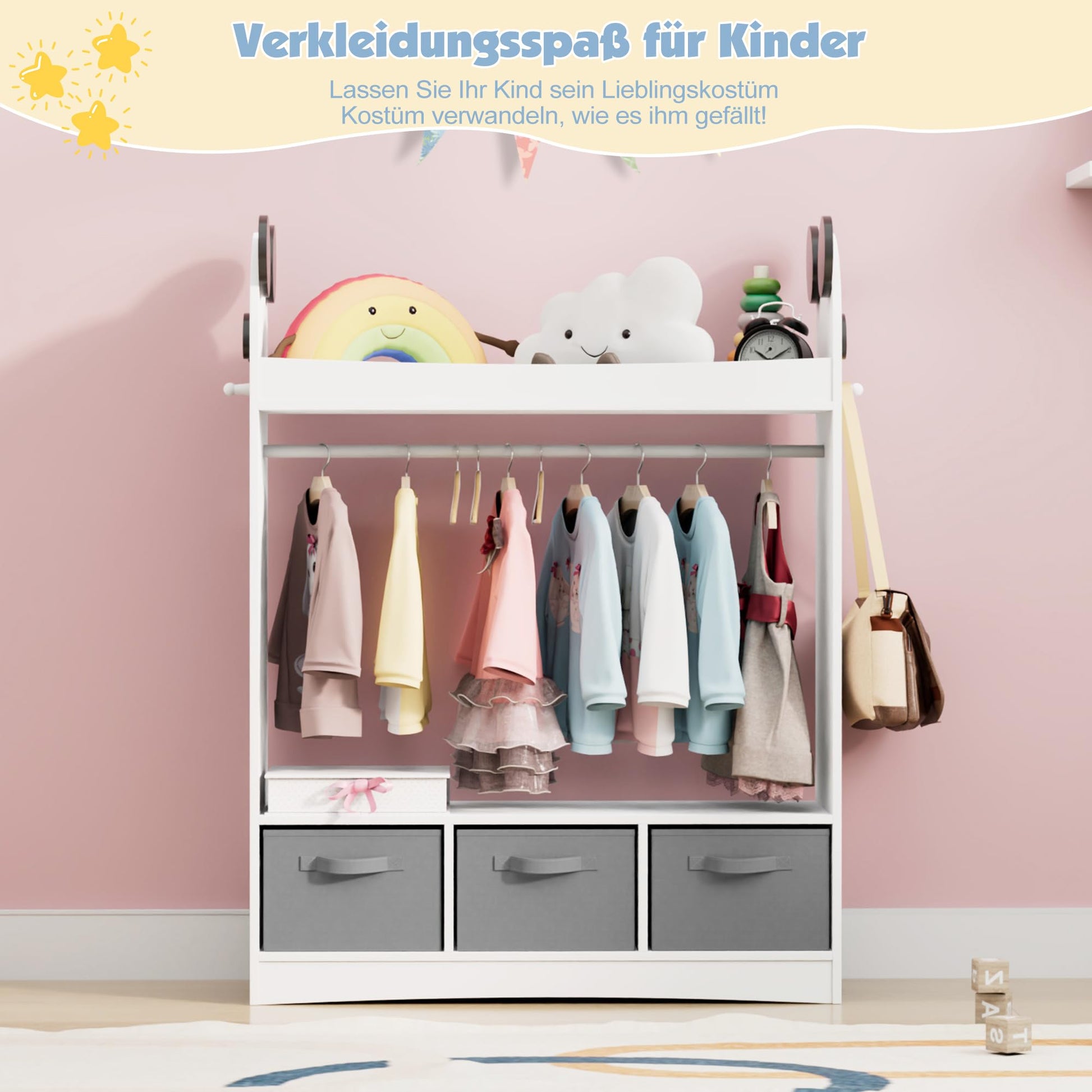 - Enough Storage Space: This children's wardrobe has open shelves or drawers and a clothes rail, meeting the diverse storage needs of children. Children can freely store their clothes, toys, books, shoes and other items in the wardrobe. The additional coat hooks on the side are suitable for jackets or school bags.