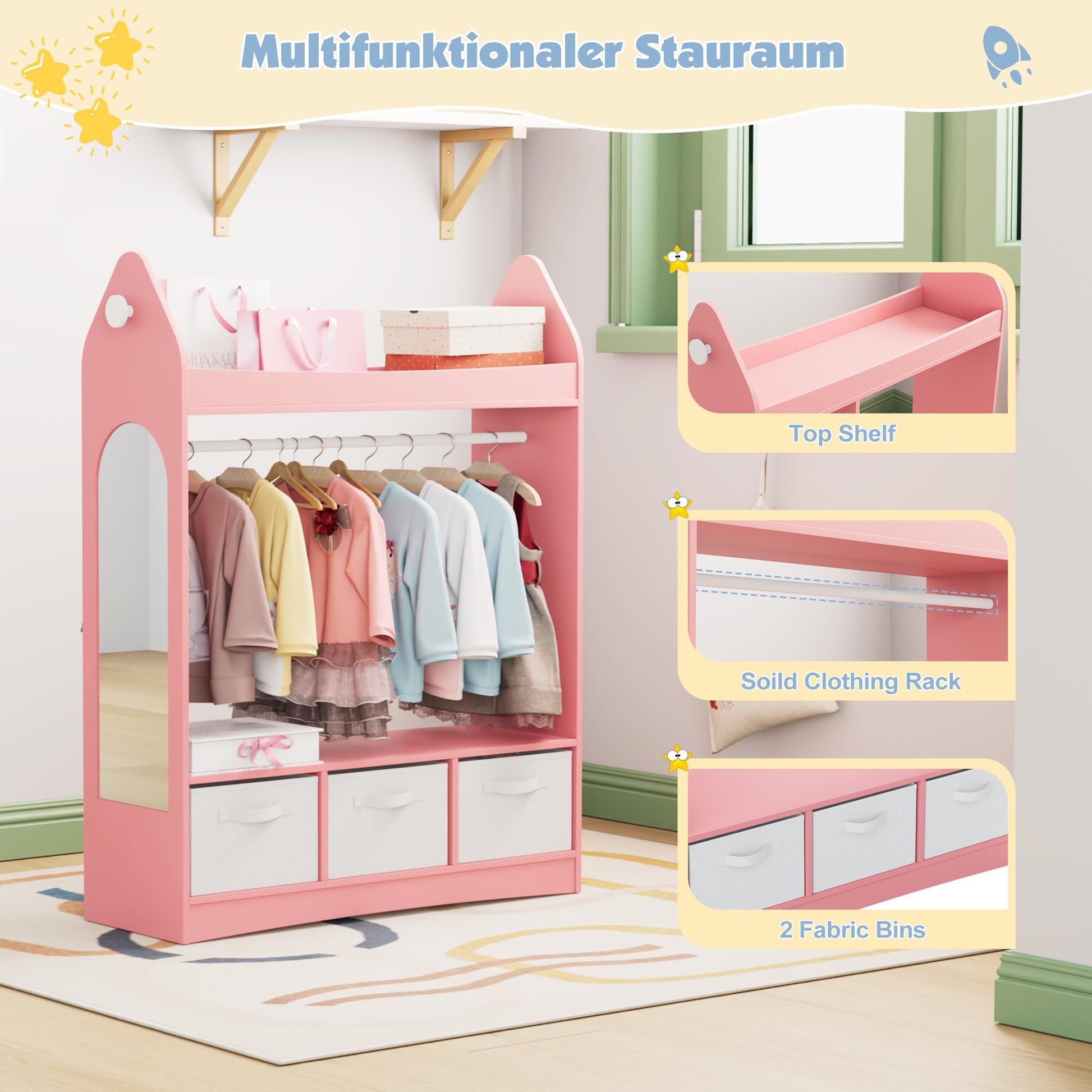 - WITH MIRROR: This children's wardrobe has a large mirror on the side. The mirror allows children to see their clothes clearly and satisfies their pursuit of beauty.