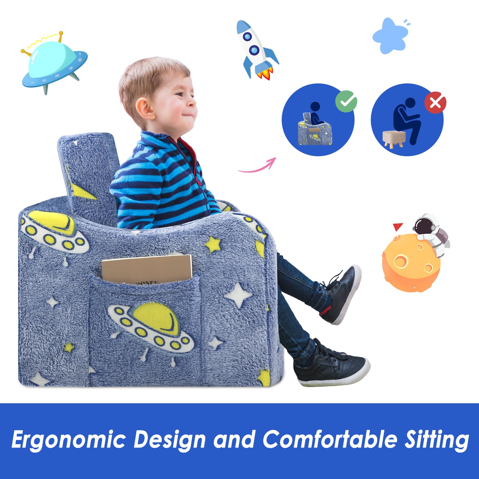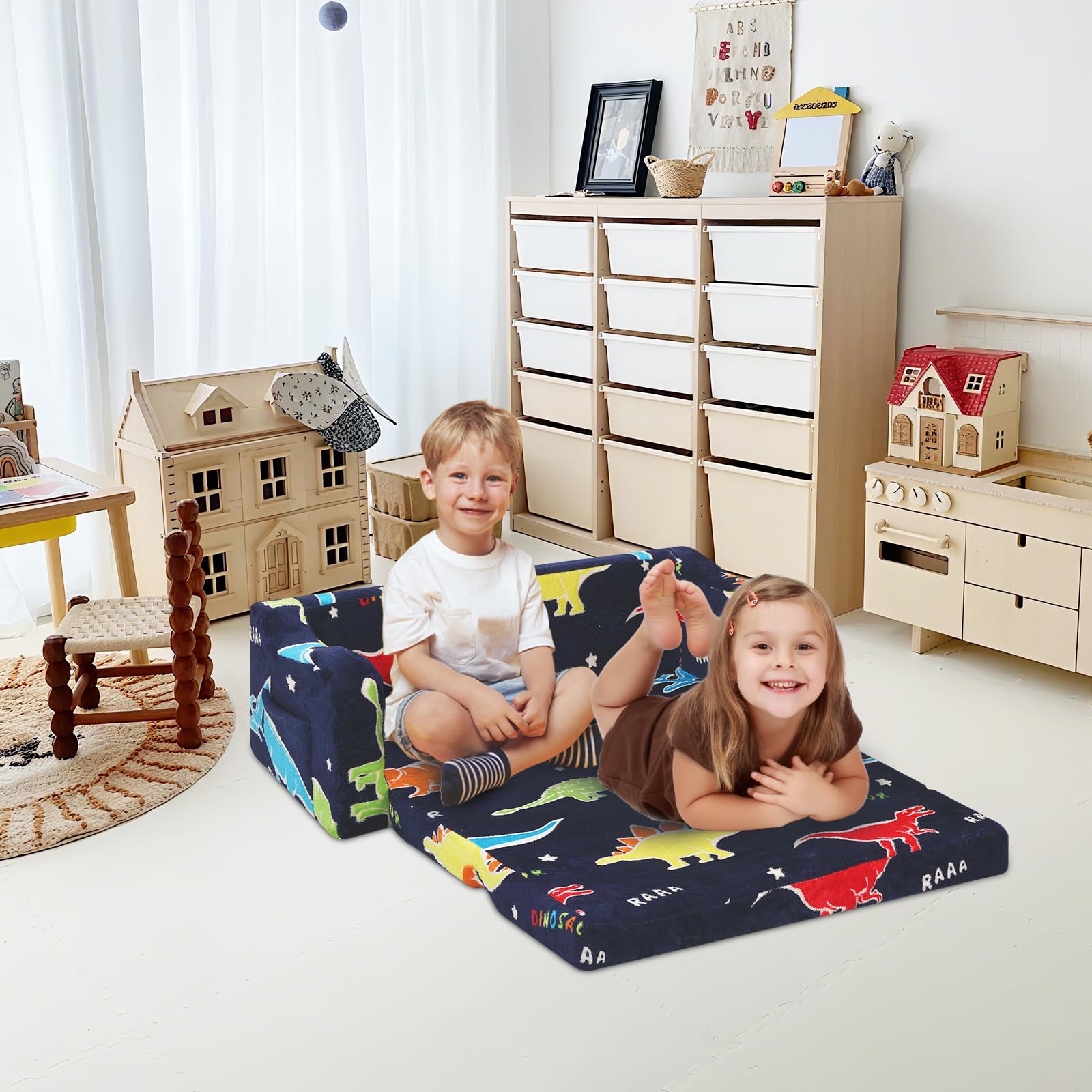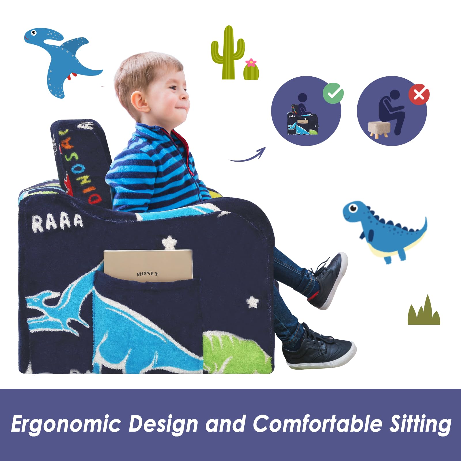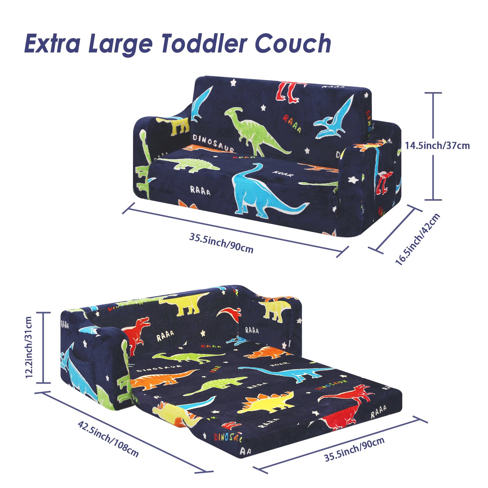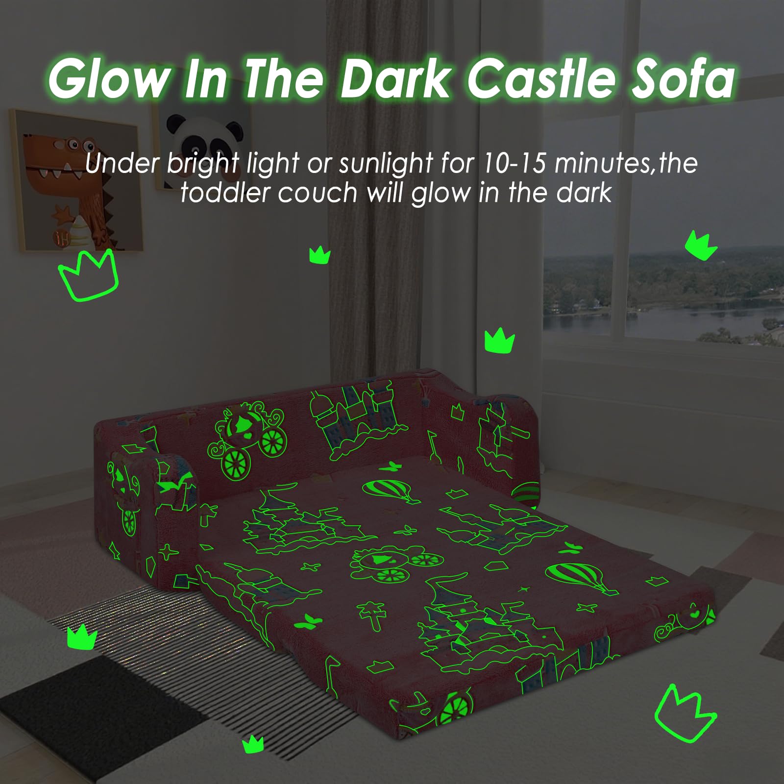 - Glow in the dark design: features a unique luminous design with a cute dinosaur pattern.Under bright light or sunlight for 10-15 minutes, the toddler sofa will glow in the dark