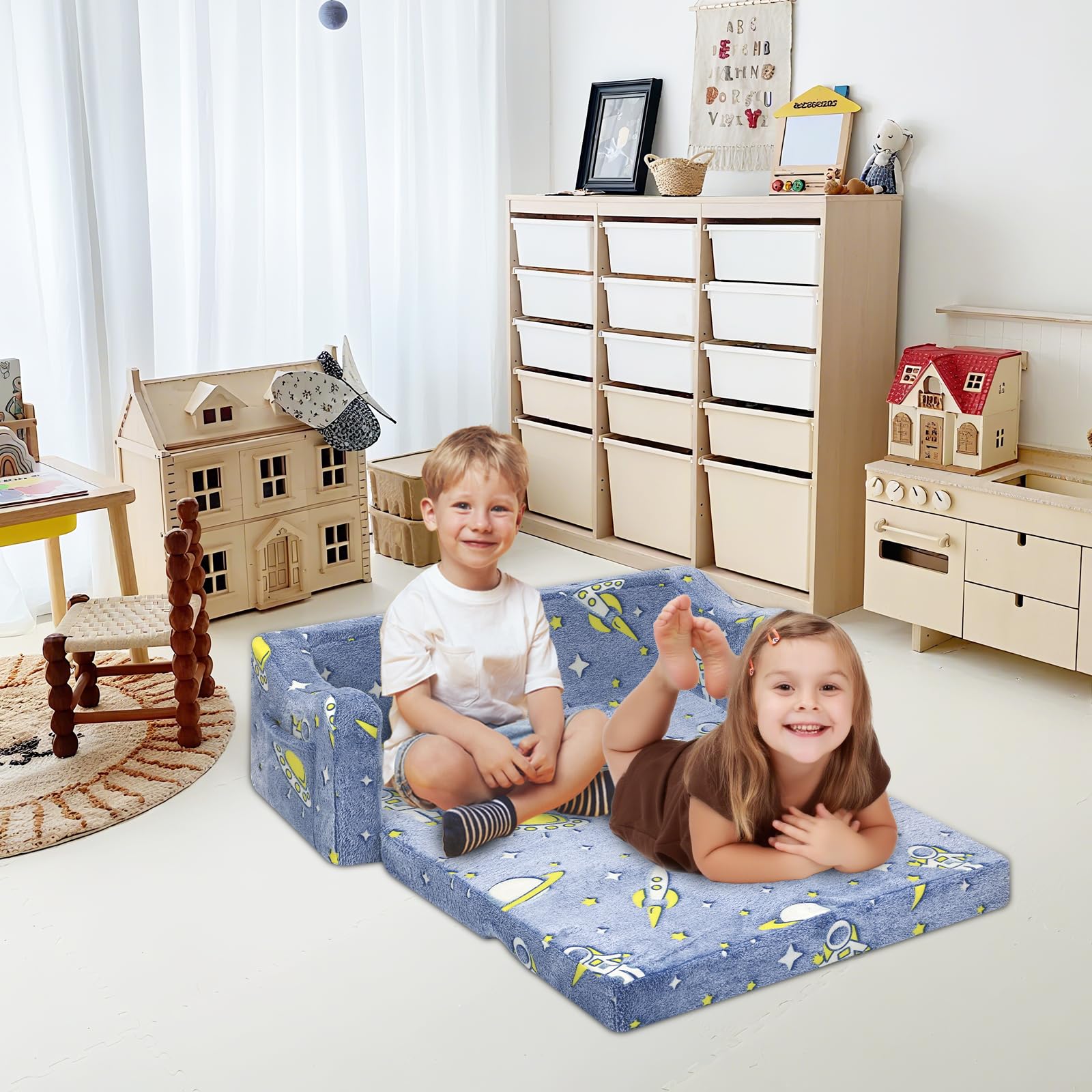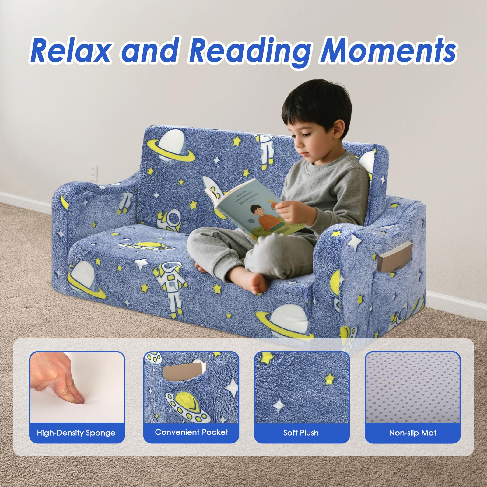 Children's Sofa Fold-Out 2-in-1, Extra Large Children's Sofa Glows in the Dark with Sleep Function, Children's Chair for Children's Room, Playroom, Astronauts