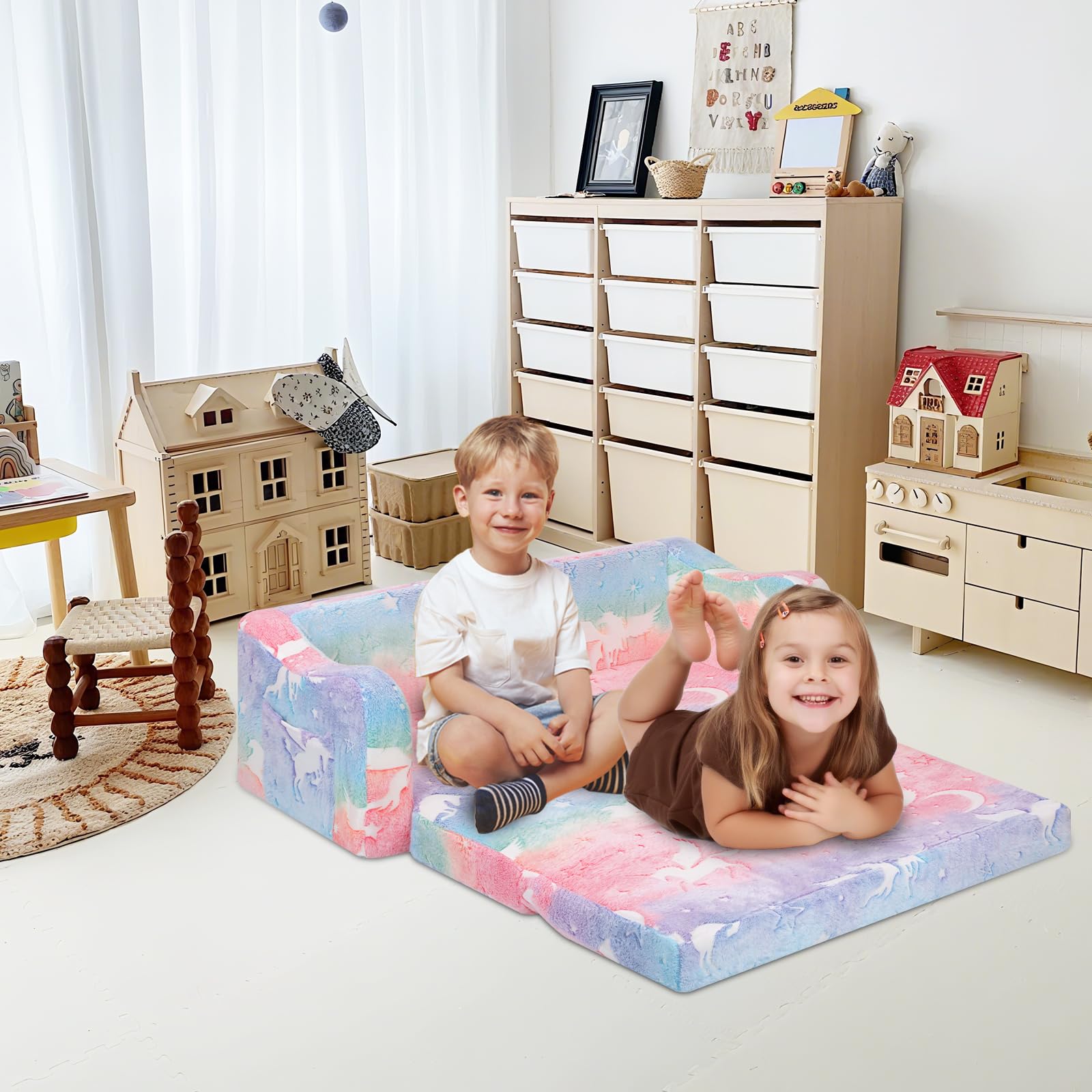 - 2 in 1 Design The 2 in 1 folding sofa can be easily transformed into a lounger. Ideal for resting and playing. The non-slip cushion on the bottom prevents easy slipping and protects the safety of the baby.