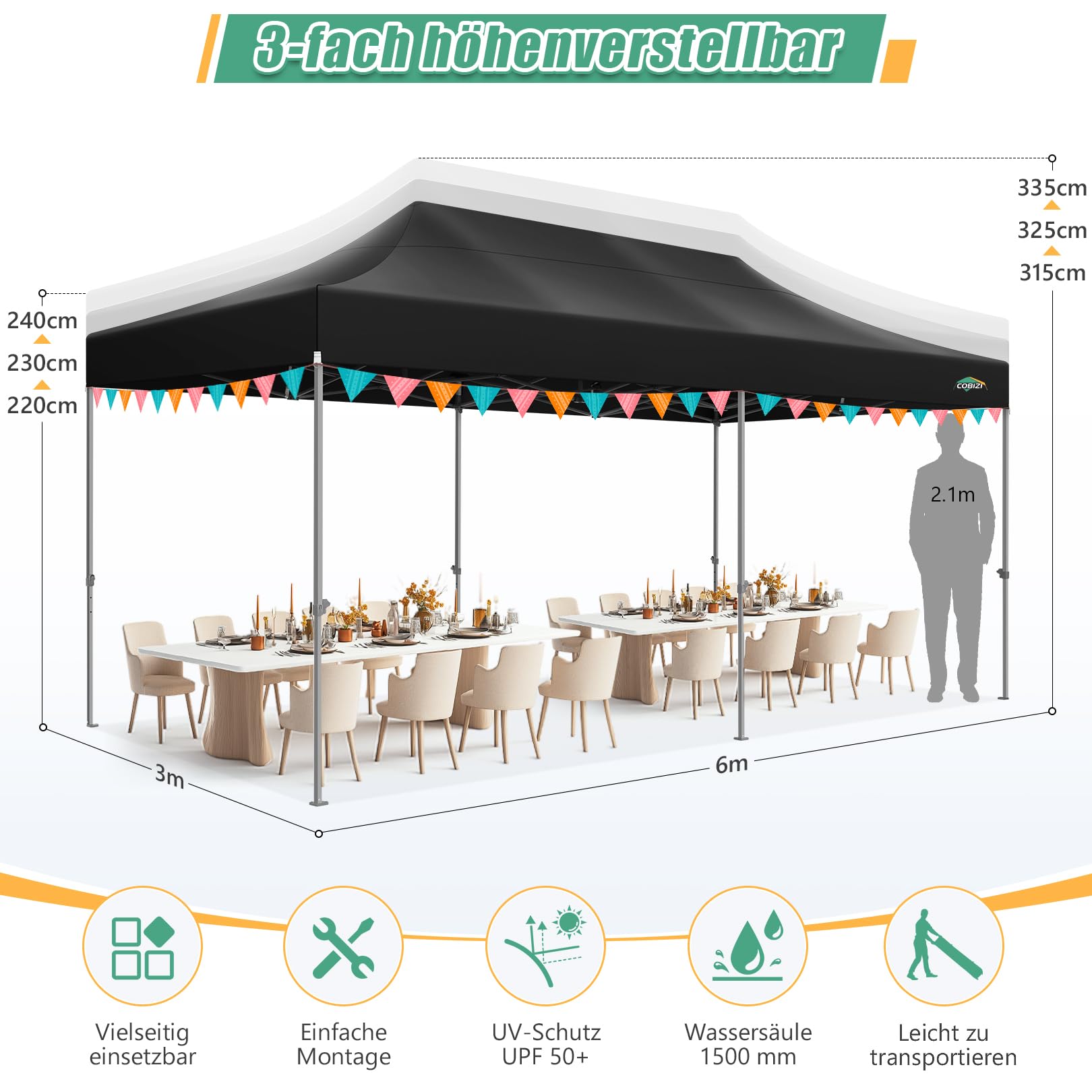 - Easy setup, 3 height positions: 1-2 people can be set up quickly in a short time, no tools required. And provide 3 adjustable heights, the adjustable range ranges from 310 cm over 319 cm to 328 cm, suitable for different usage scenarios, you can adjust your canopy according to your wishes. This commercial canopy is suitable for outdoor events, camping, sports, weddings, picnics, barbecues and other commercial purposes