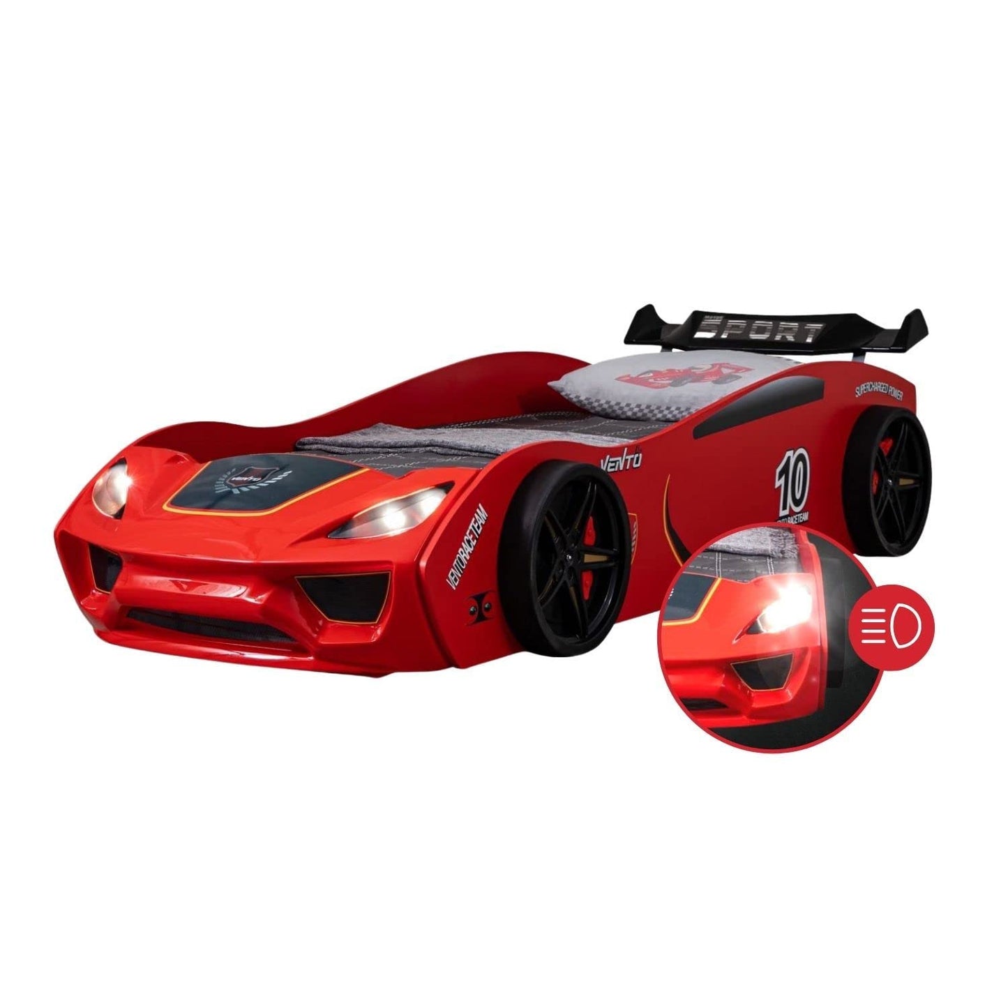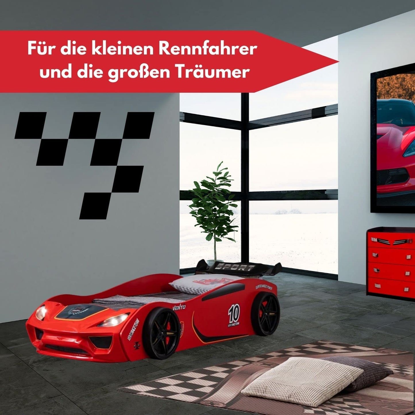 - Advantages Dream Racer car bed - bed frame made of robust, easy-care MDF - generous lying surface 90 x 200 cm for children and teenagers - raised side panels as fall protection - sporty, original close design - lighting can also be used as a night light