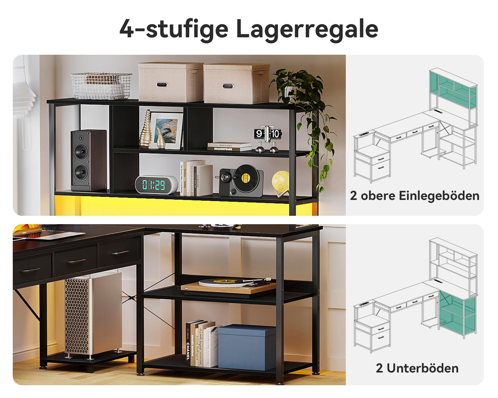 Coleshome Corner Desk with 5 Drawers and 4 Shelves, 200 x 110 cm Desk L-Shape with LED, Sockets & USB, Large Desk for Home Office, Black