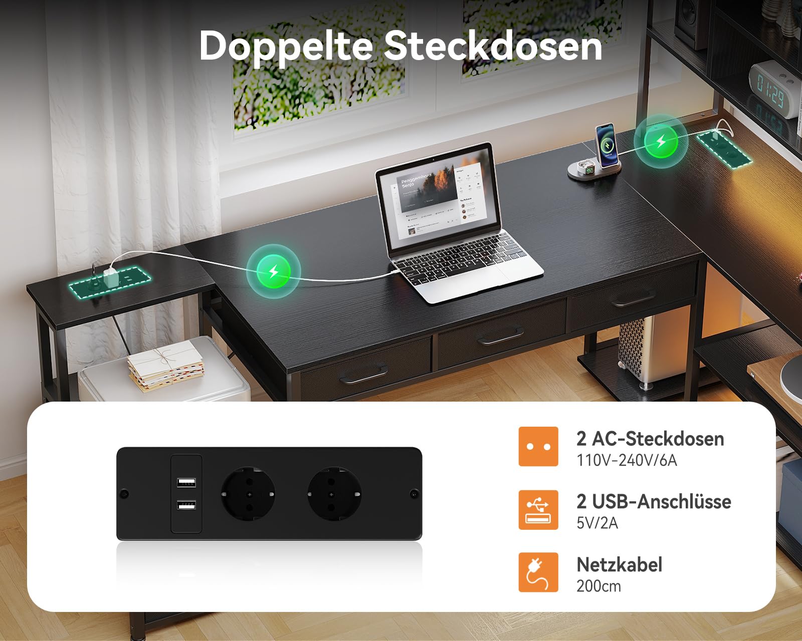 - Modern sockets: the L-shaped desk has 2 sockets (2 ports each) and USB ports. Charge your smartphone, laptop or gaming devices directly at your desk. Practical for work, study or games - without tangled cables!