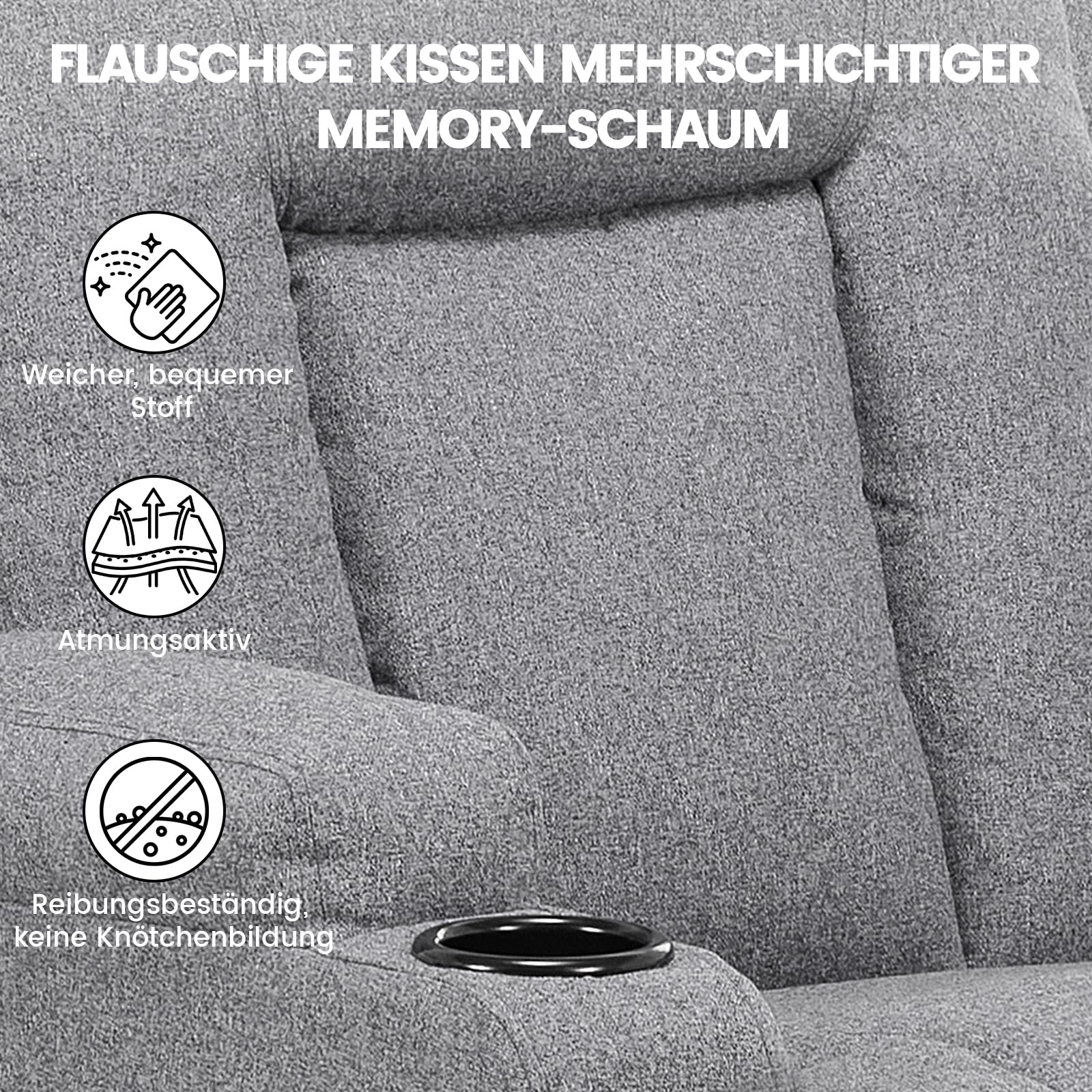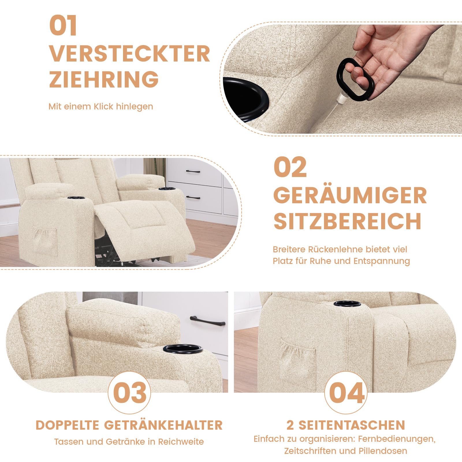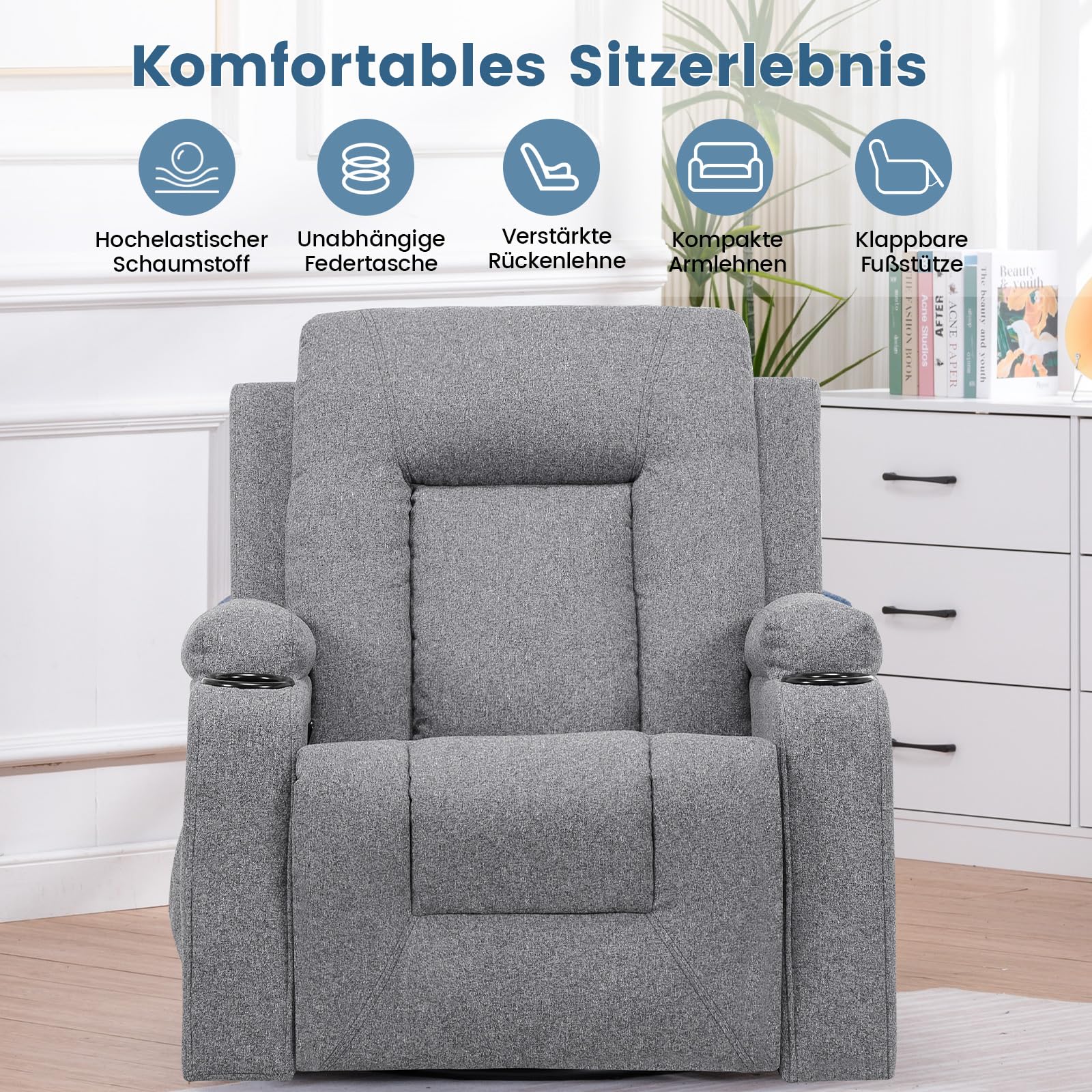 - Vielseitiges Design: Durch das schlichte und moderne Design ist der Sessel für unterschiedliche Einsatzbereiche geeignet und lässt sich perfekt in Wohnzimmer, Schlafzimmer und Büro integrieren. Ausgestattet mit Getränkehaltern und Seitentaschen können Sie Getränke und andere Kleinigkeiten unterbringen.