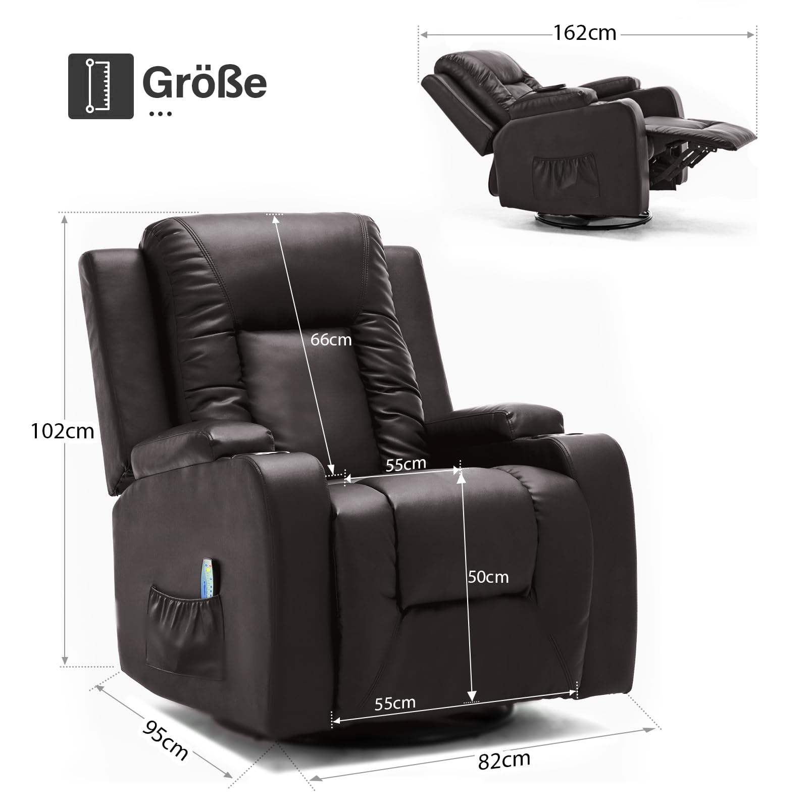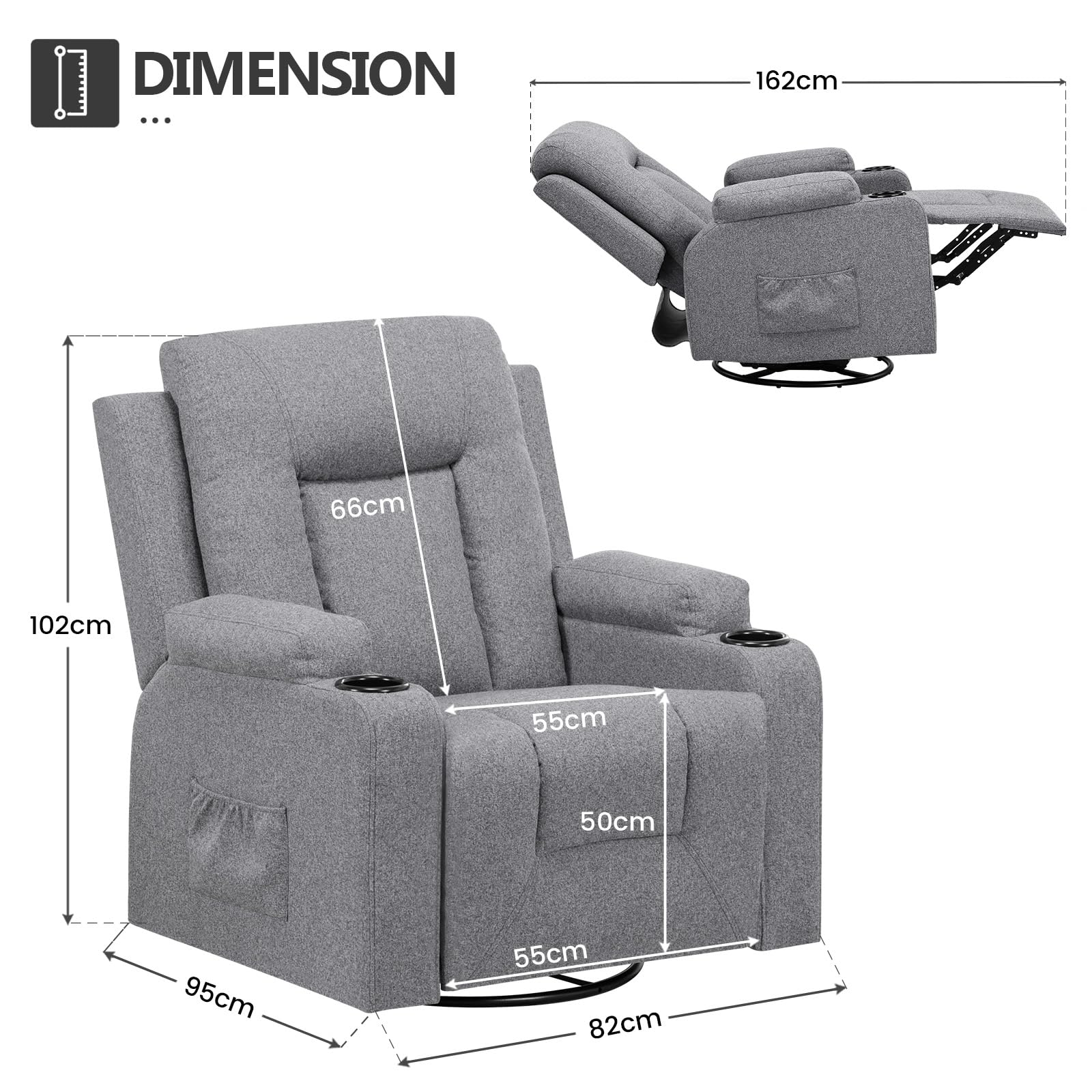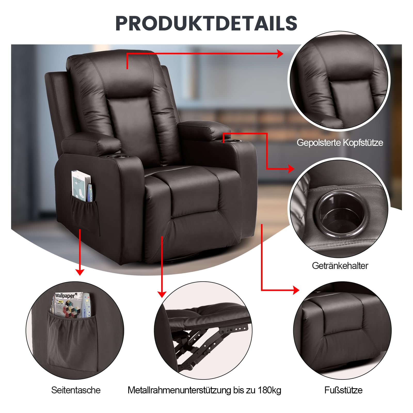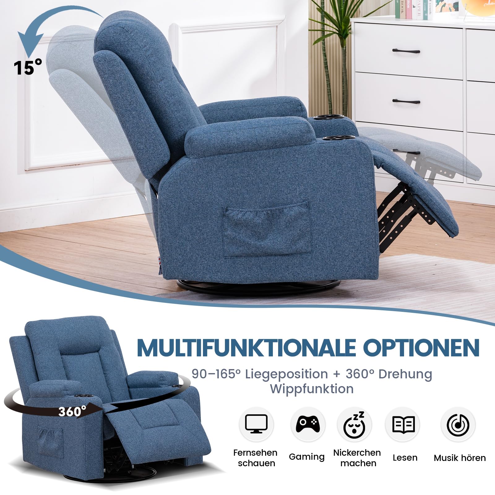 - Vielseitiges Design: Durch das schlichte und moderne Design ist der Sessel für unterschiedliche Einsatzbereiche geeignet und lässt sich perfekt in Wohnzimmer, Schlafzimmer und Büro integrieren. Ausgestattet mit Getränkehaltern und Seitentaschen können Sie Getränke und andere Kleinigkeiten unterbringen.