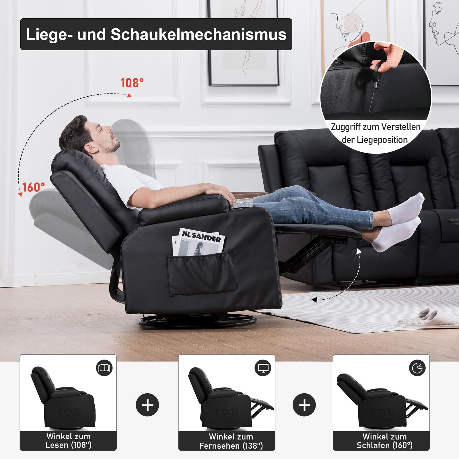 - Hochwertiges Material: Der Liegesessel ist aus hochwertigem PU-Leder gefertigt, das sich nicht nur weich anfühlt, sondern auch leicht zu reinigen ist. Wischen Sie ihn einfach vorsichtig mit einem Lappen ab, anders als bei anderen Loungesesseln aus Stoff, die schwer zu reinigen sind. Der hochdichte Schwamm, der Sitzfläche und Rückenlehne füllt, verformt sich nicht so leicht und bietet sowohl ein umhüllendes Gefühl als auch guten Halt.