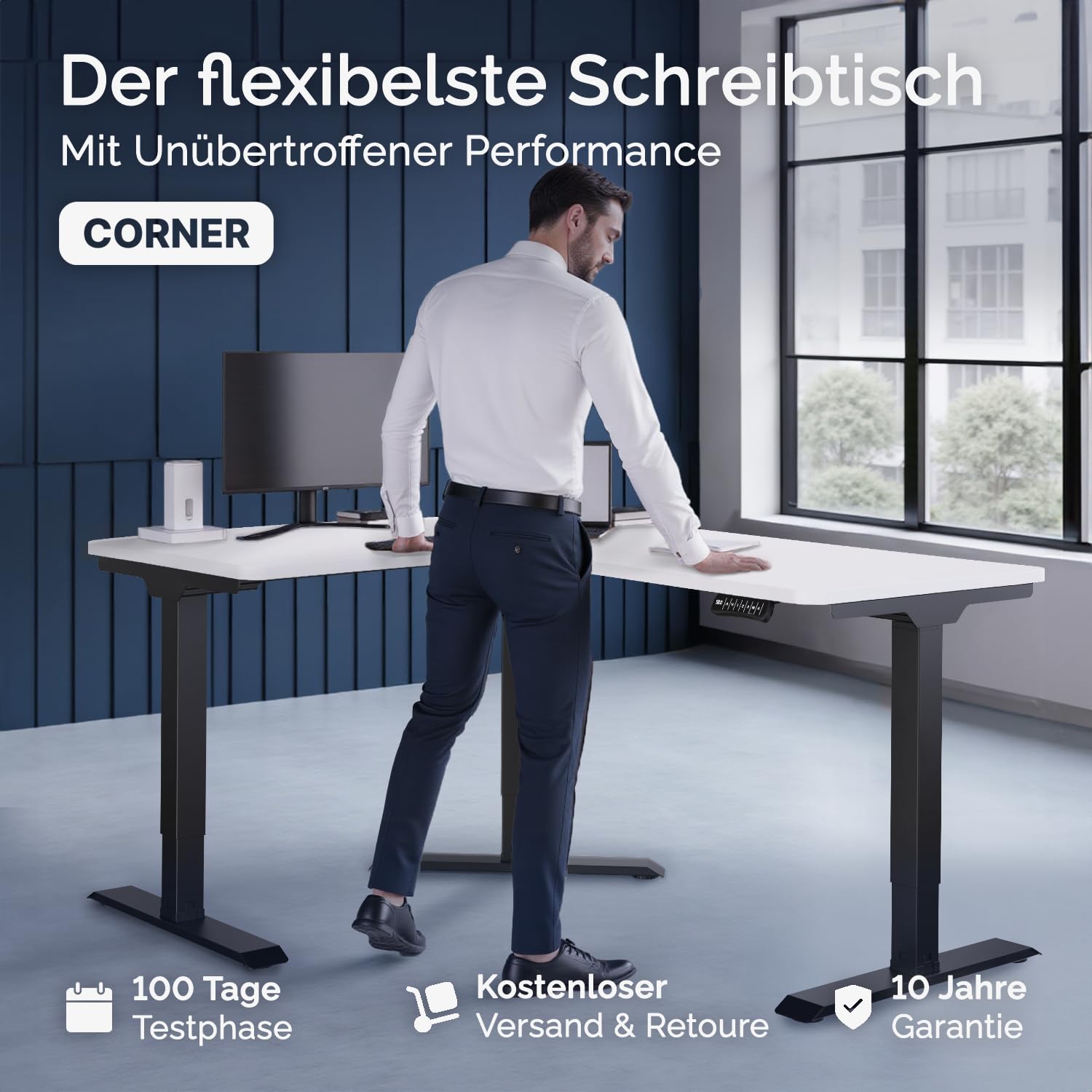 - Ergonomic and comfortable - The electrically height-adjustable corner desk frame can help improve comfort and well-being in the home office or everyday office life. The height adjustment allows for an ergonomic working position.
