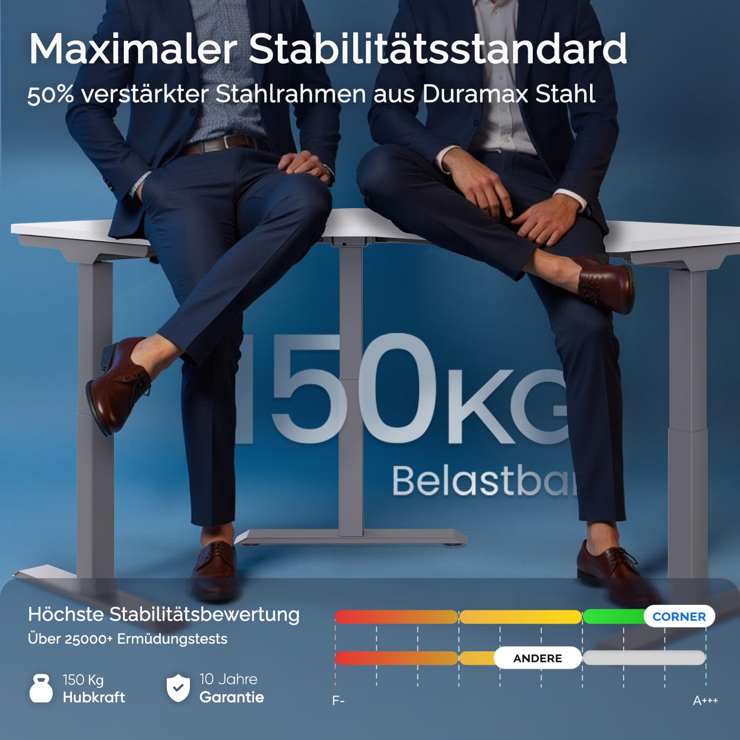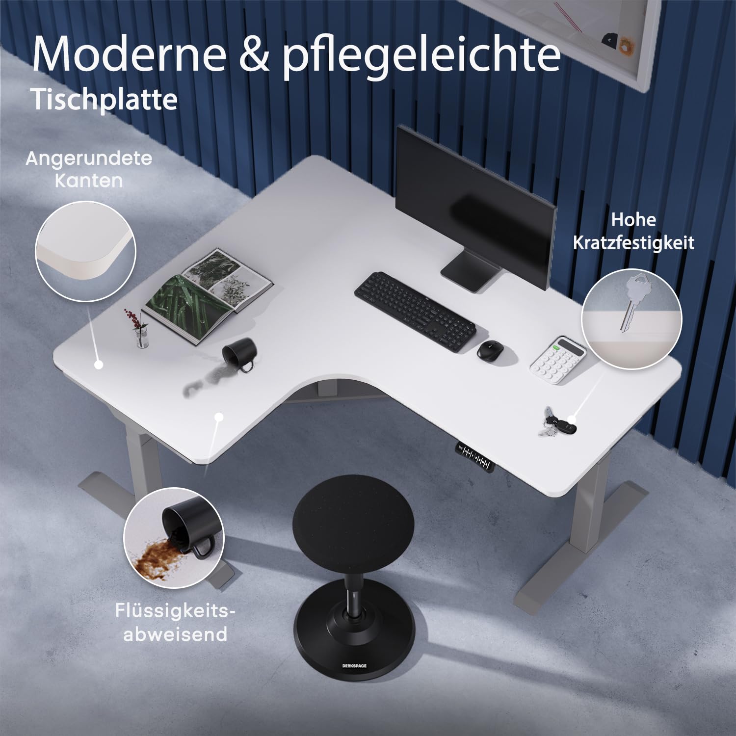 - Robust and quiet - The high-quality motor in the corner desk height-adjustable works pleasantly quiet at less than 50 dB - even with loads of up to 150 kg.