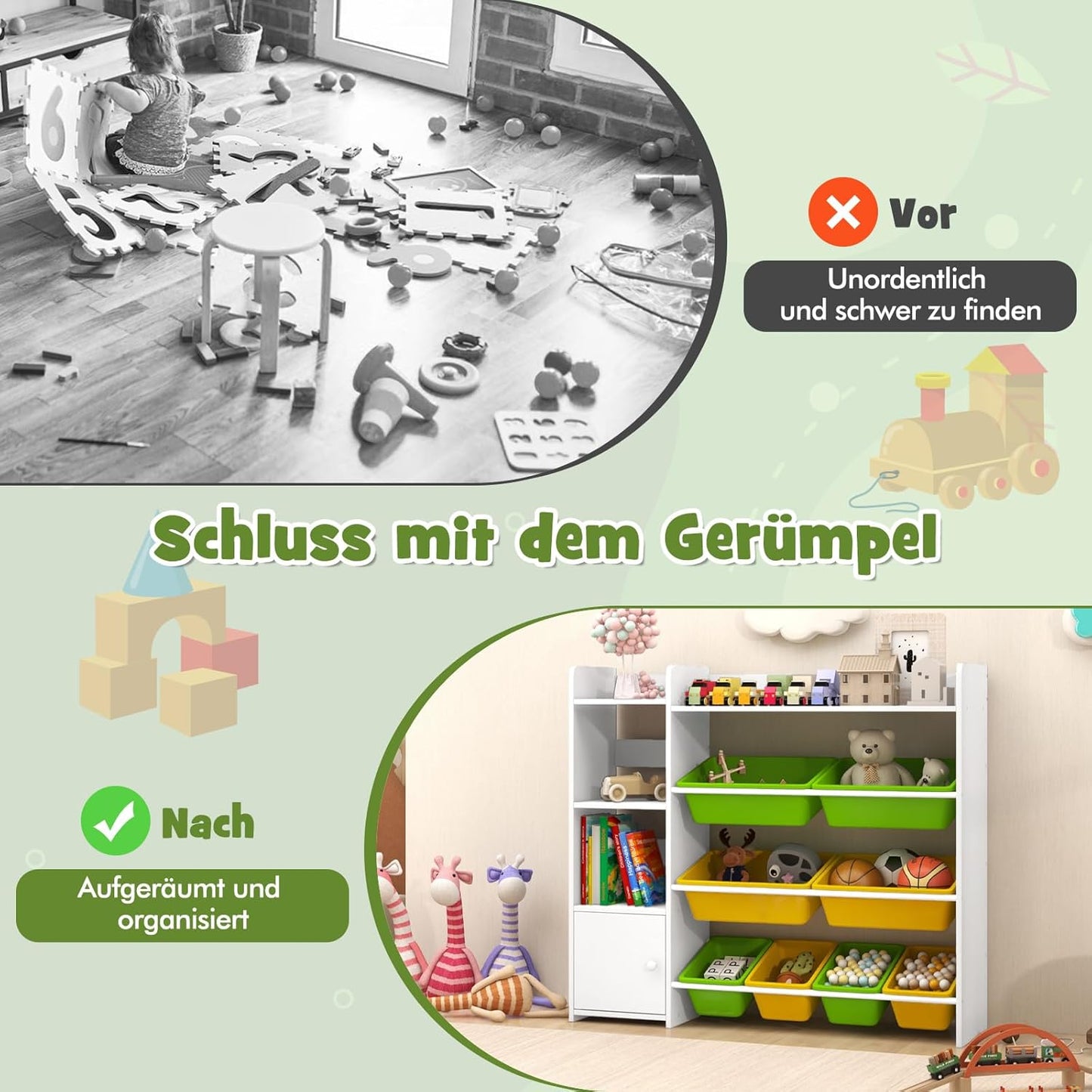 Dieser Spielzeugschrank kombiniert Bücherregale, Spielzeugkörbe und einen Schrank in einem, was dazu beiträgt, Ihr Zimmer sauber und organisiert zu halten. Er ist mit 4 großen und 4 kleinen Kunststoffbehältern ausgestattet. Darüber hinaus erfüllen die seitlichen Regale sowie der Unterschrank die Anforderungen einer klassifizierten Aufbewahrung für Kinder. Was die Robustheit anbelangt, besteht dieser Aufbewahrungsorganisator aus einem haltbaren Rahmen und ausgewählten Materialien, und die Kippschutzvorrichtungen machen ihn stabiler im Gebrauch.