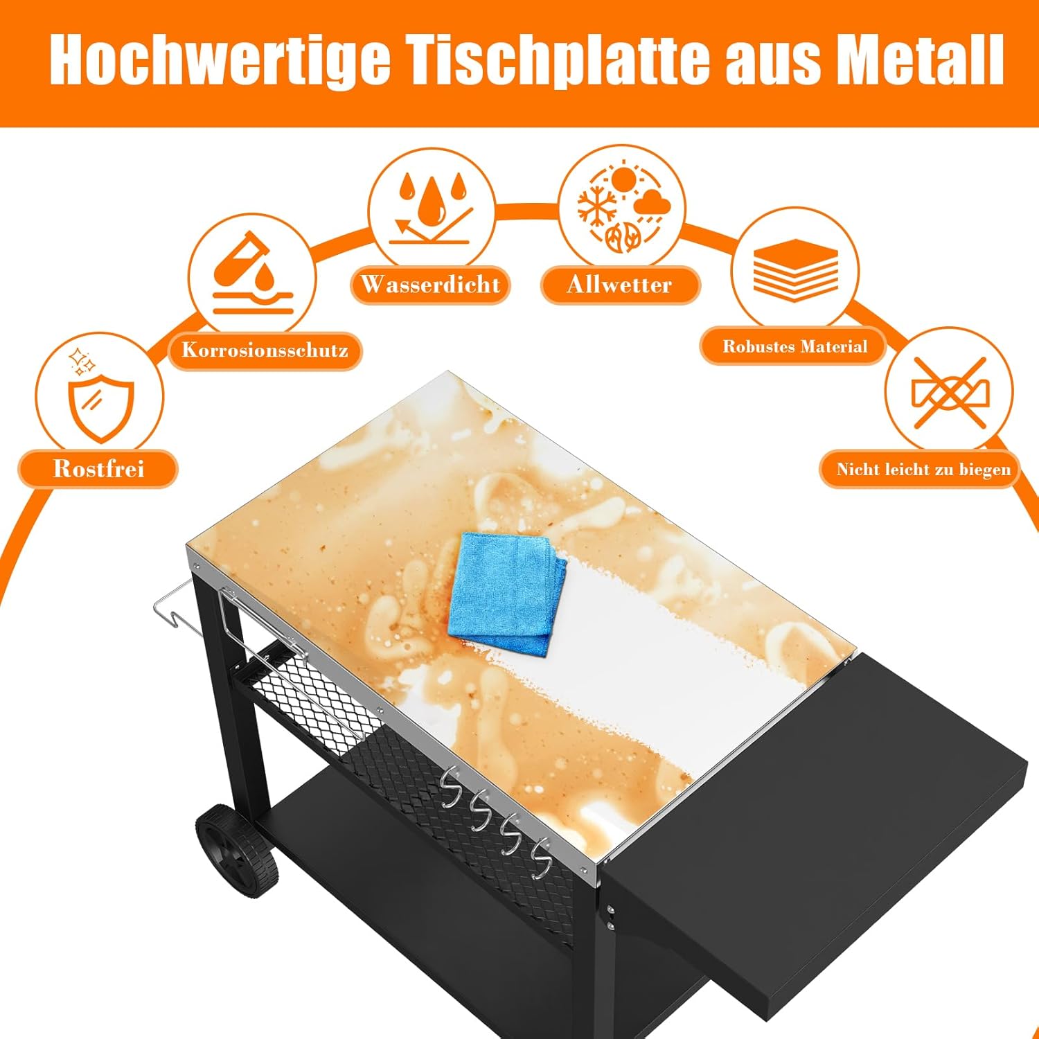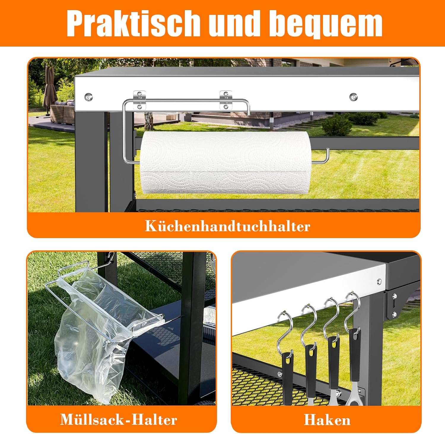 - Practical table for preparing food: The outdoor grill stand has everything you need to grill like a professional. Folding side table as an additional workspace. The garbage bag holder can store garbage at any time, 4 hooks for hanging tongs, barbecue forks and spatulas. Also have a paper towel ready. Everything is so organized.