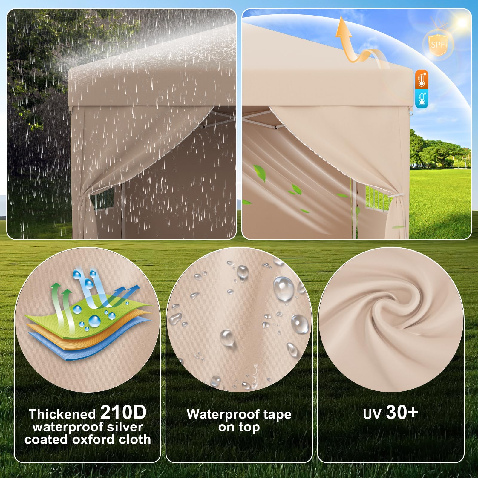 - 210D Oxford fabric: The roof of the Devoko garden pavilion is made of 210D Oxford fabric with PVC coating, 100% polyester and has UV protection 50+. All articulated details are equipped with a heat seal that effectively protects against UV rays and rainwater and provides a comfortable environment for your family celebrations and business events.