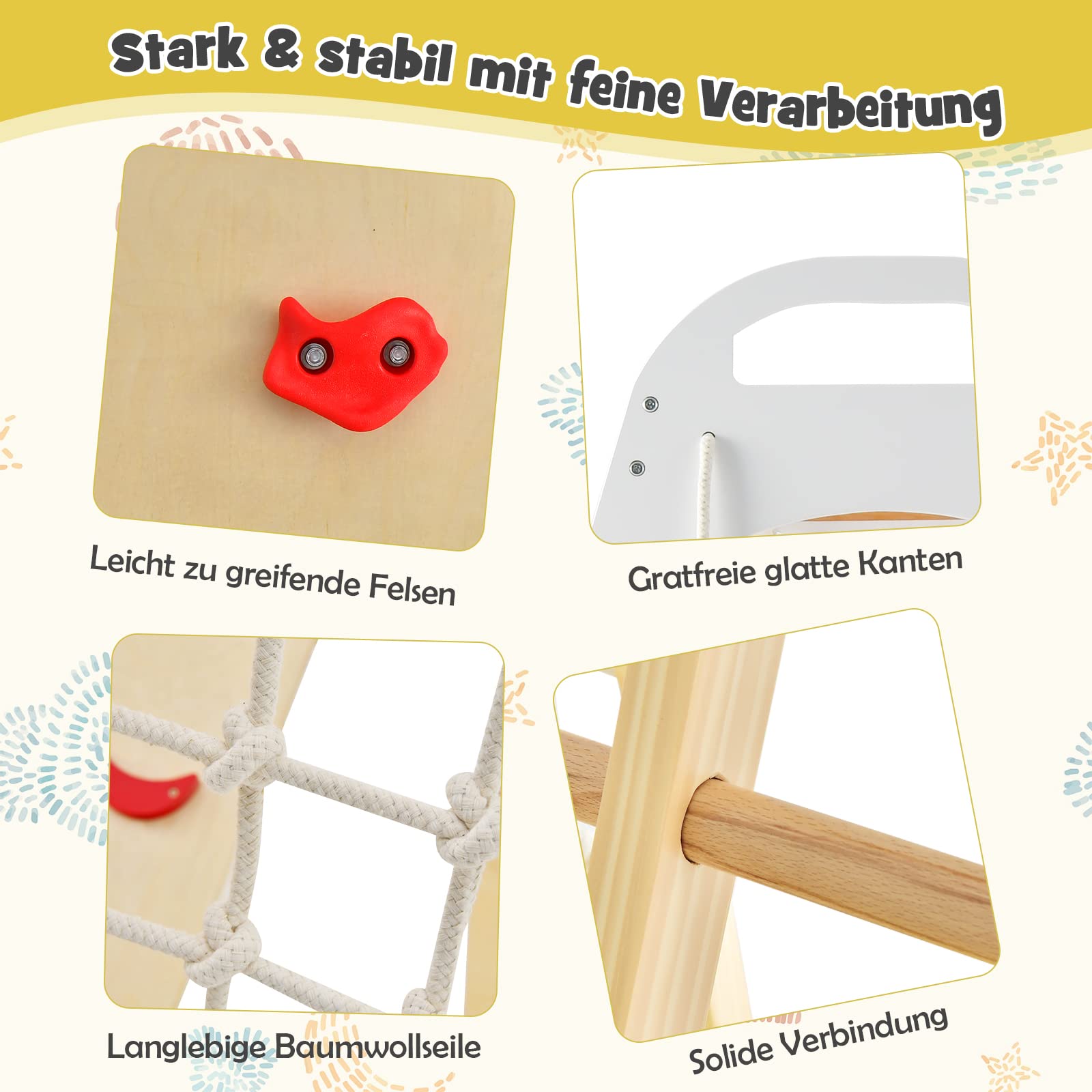 - Multifunctional climbing frame - The indoor wooden climbing frame is versatile and includes slide, rope ladder, climbing frame, climbing net, swing, gymnastics rings, climbing net, climbing rocks. The slide board is double sided, one side has climbing rocks, the other side is smooth and can be used as a slide.