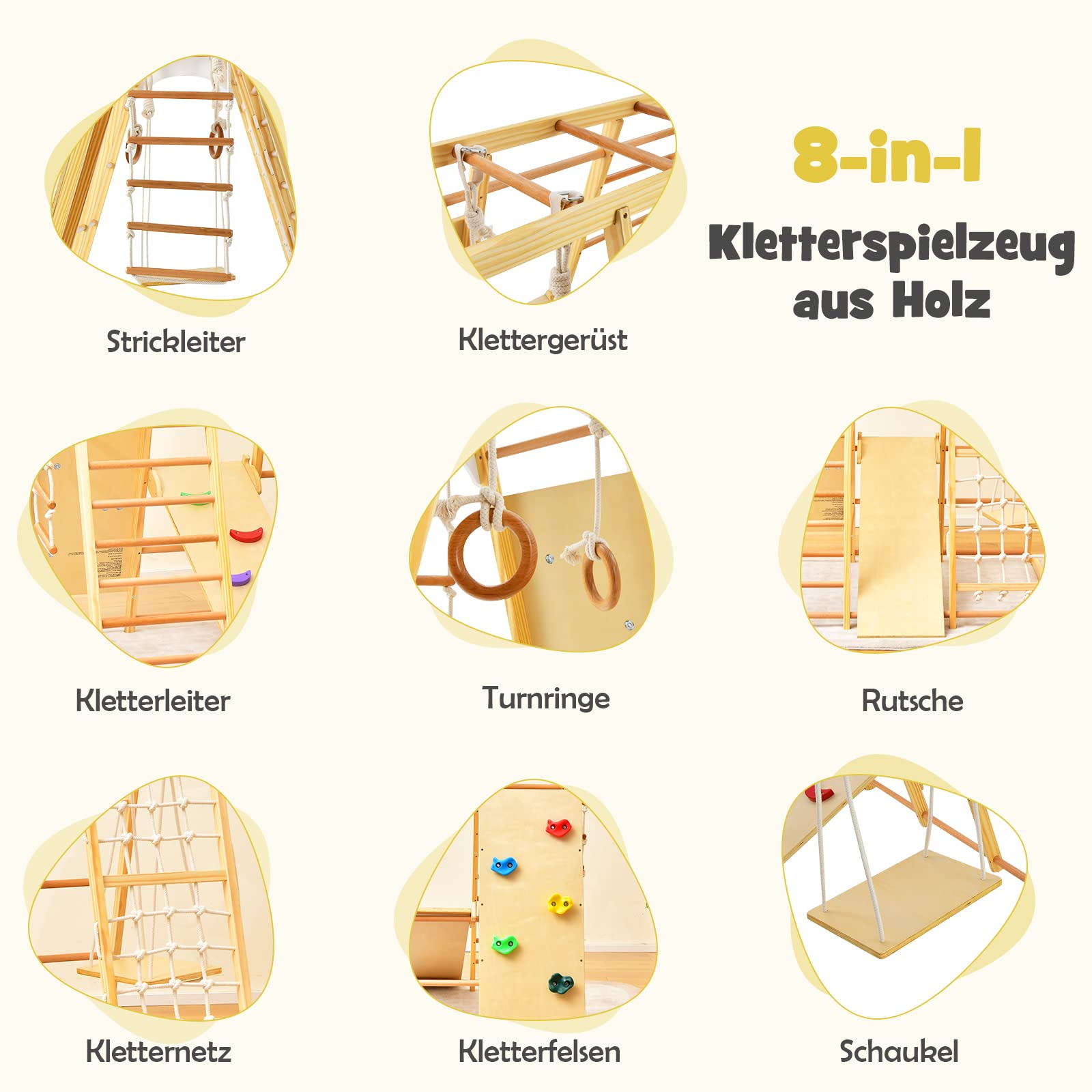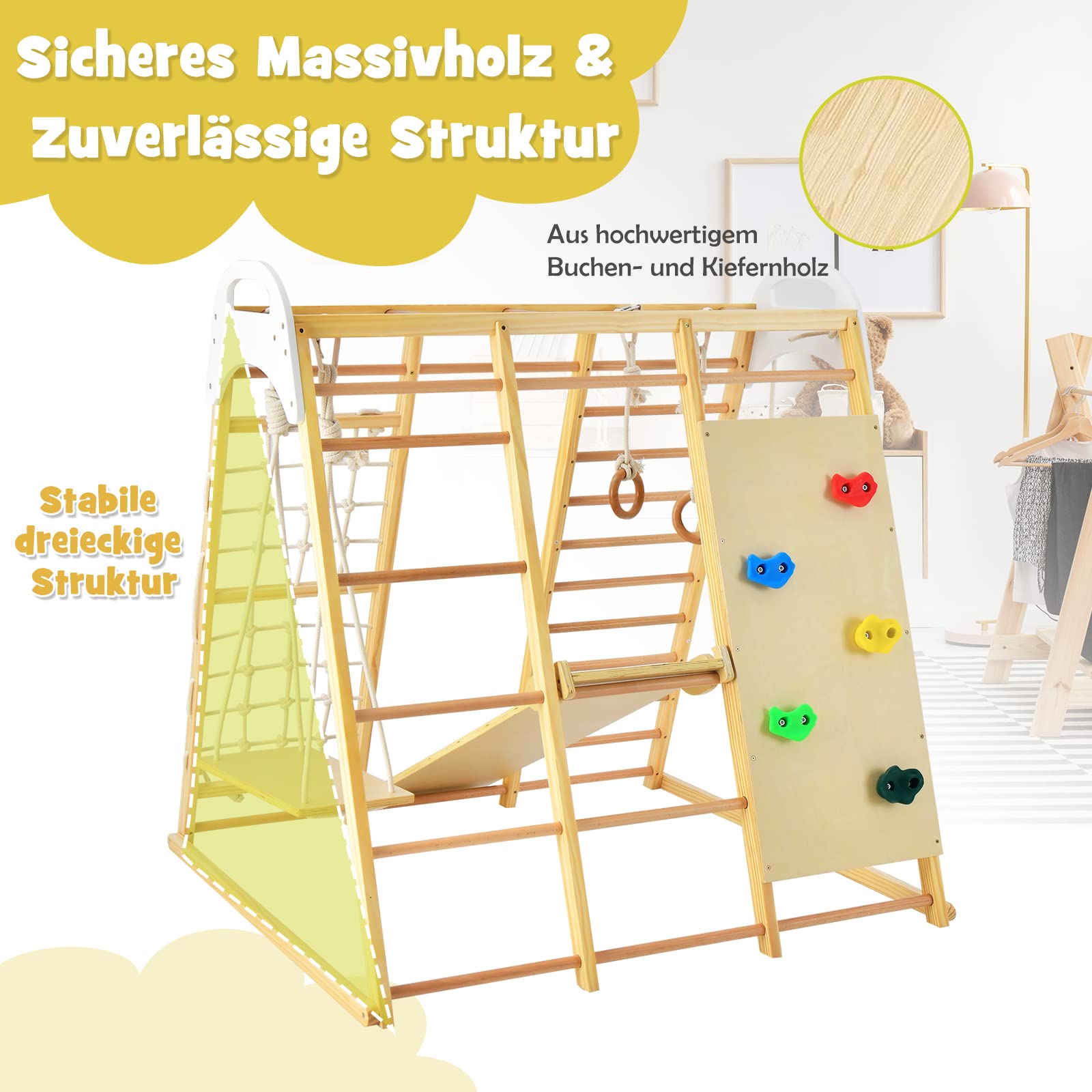 DREAMADE 8 in 1 Climbing Triangle Climbing Toy with Swing Ladder Slide Climbing Net Gym Rings Playground Indoor Wooden Climbing Frame for Sliding & Climbing for Children from 3 Years (Natural)