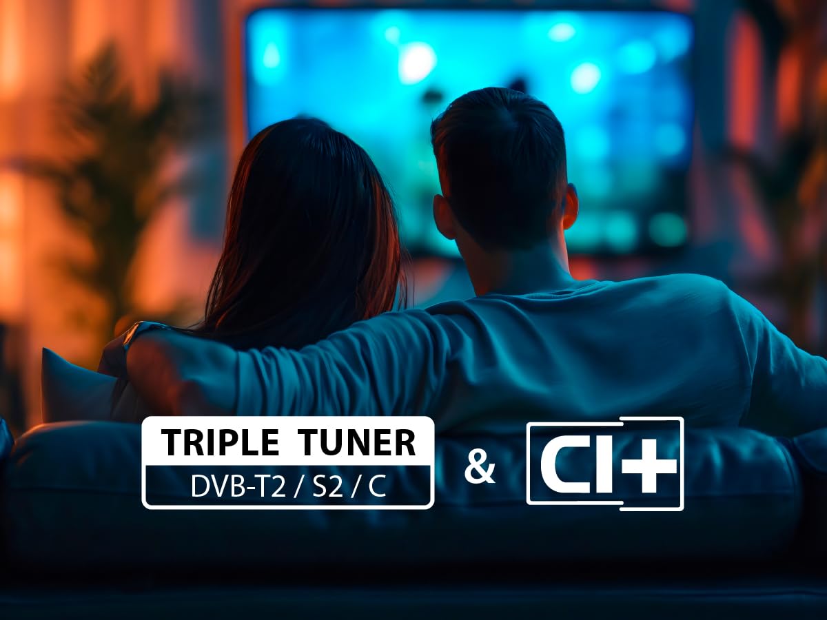 - Reception: DVB-T2 (terrestrial), DVB-C (cable), DVB-S2 (satellite), CI+; no external receiver required.