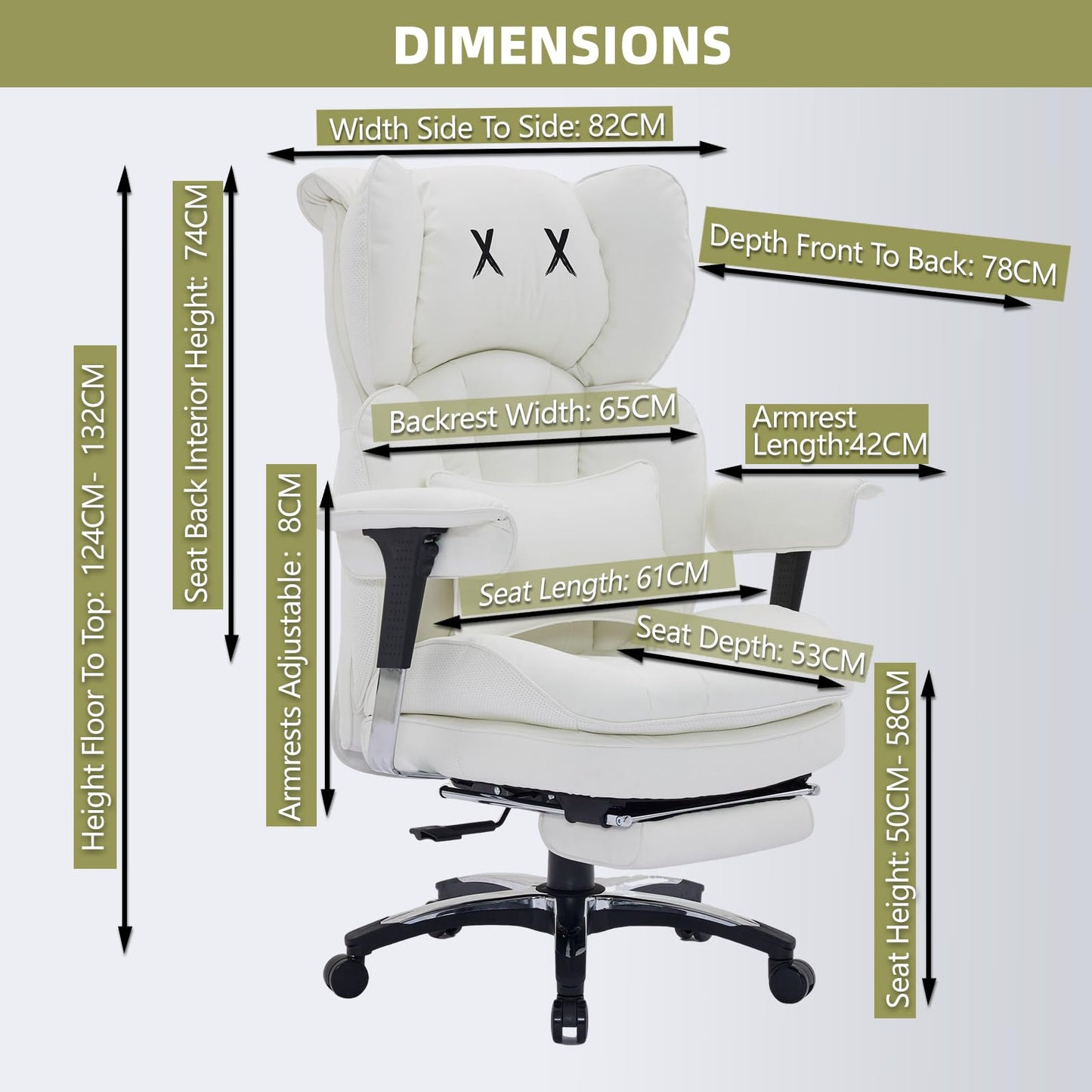 Efomao Bürostuhl, X-Stickerei Big and Tall Stuhl aus PU Leder für Zuhause, Verstellbarer Hochlehner Computer Gaming Stuhl, 200 kg drehbarer Chefsessel mit Fußstütze und Lendenwirbelstütze, Weiß