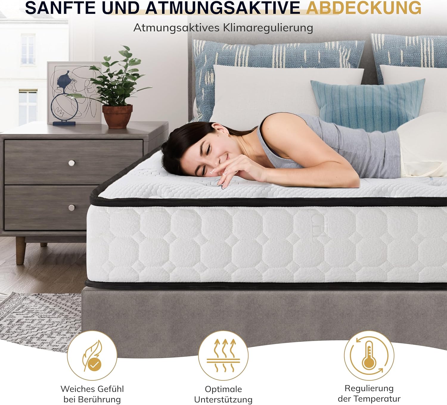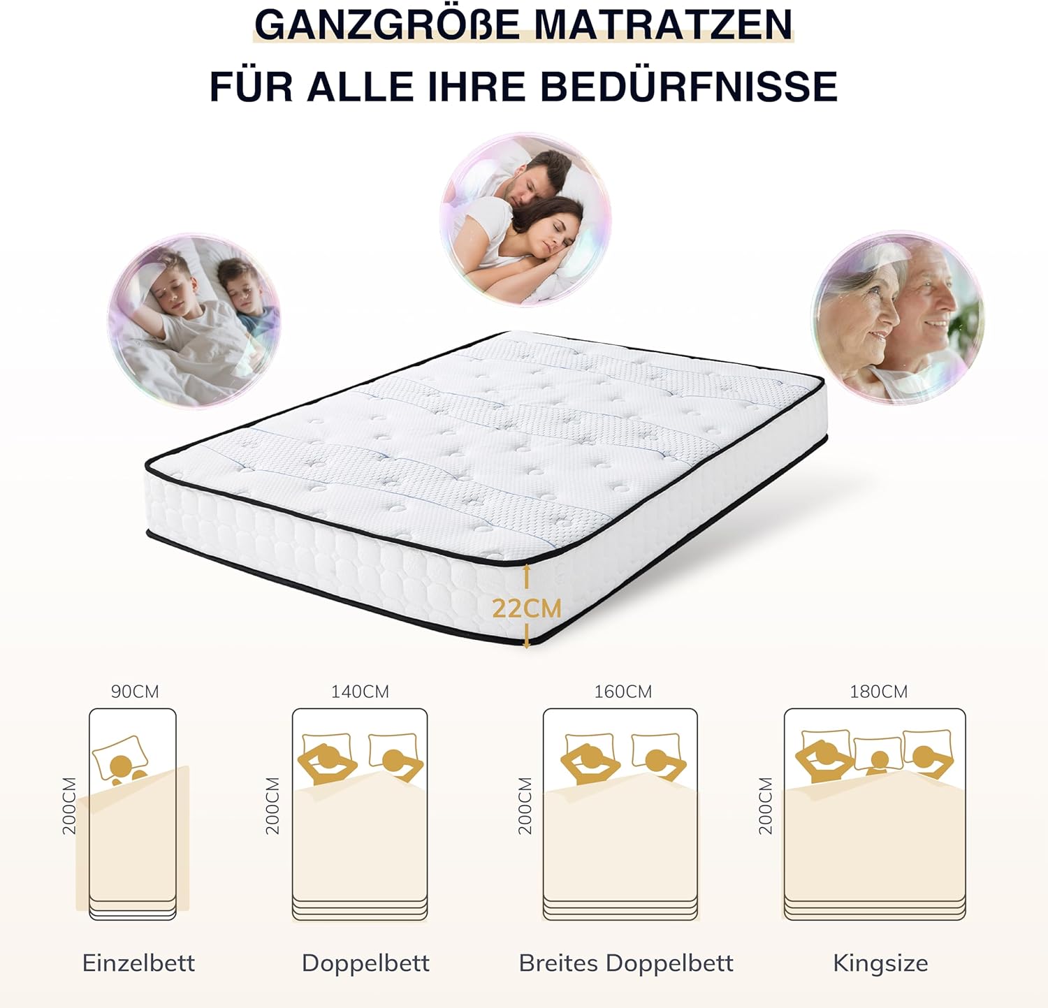 EGO HOME Pocket Spring Mattress 180 x 200 cm Height 22 cm Ergonomic 7-Zone Spring Mattress with Comfort Foam and Microfibre Cover Hardness H3 Mattress 180 x 200 cm Oeko-Tex Certified