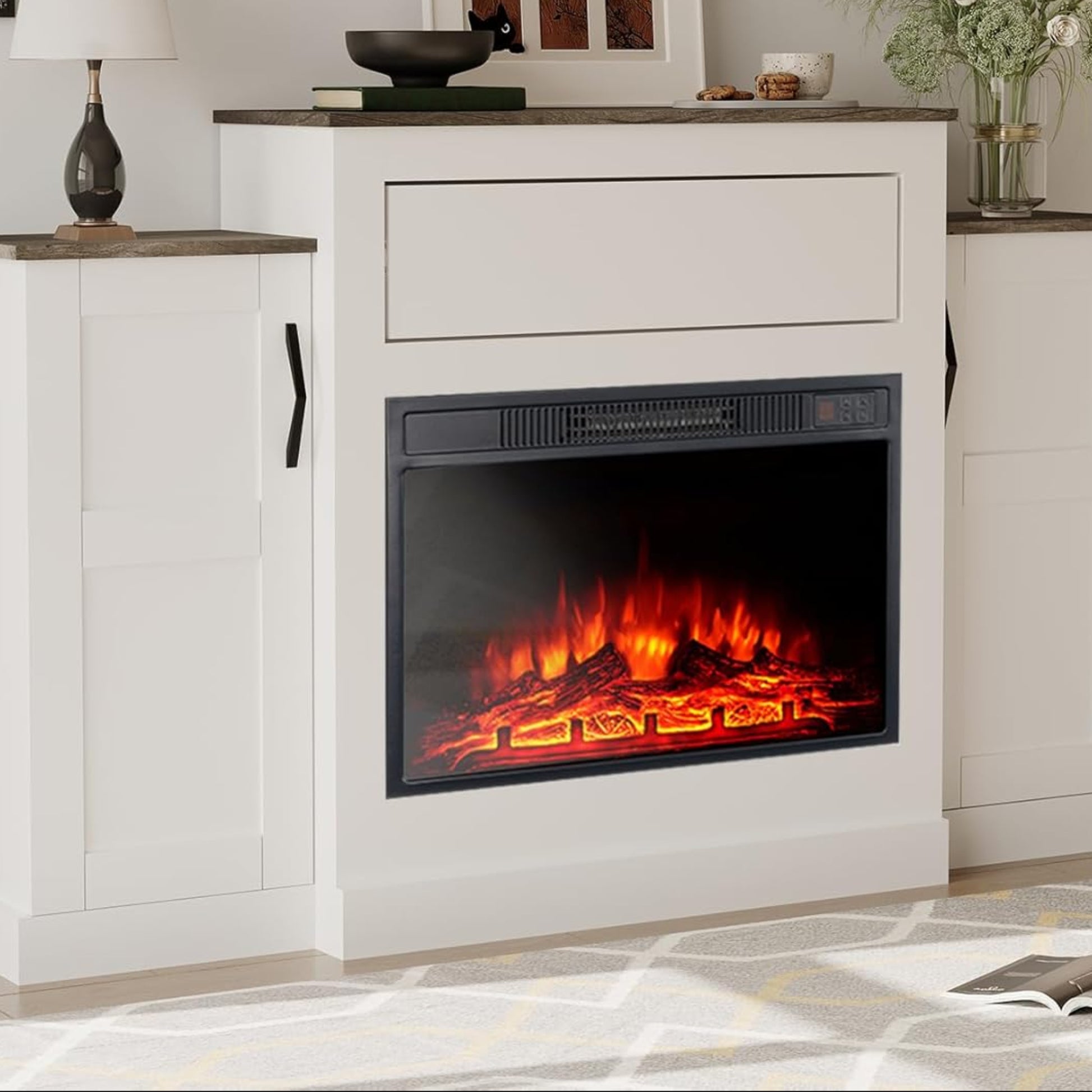 - Fireplace with tablecloth: the rich grain of the wood gives it a naturally worn look that accentuates its beautifully classic details. Chic and refined with its wood finish and white latch, this fireplace TV stand is the perfect storage and display piece for your living room. Pair it with the 23-inch fireplace to create an entertainment space that is both stylish and functional.