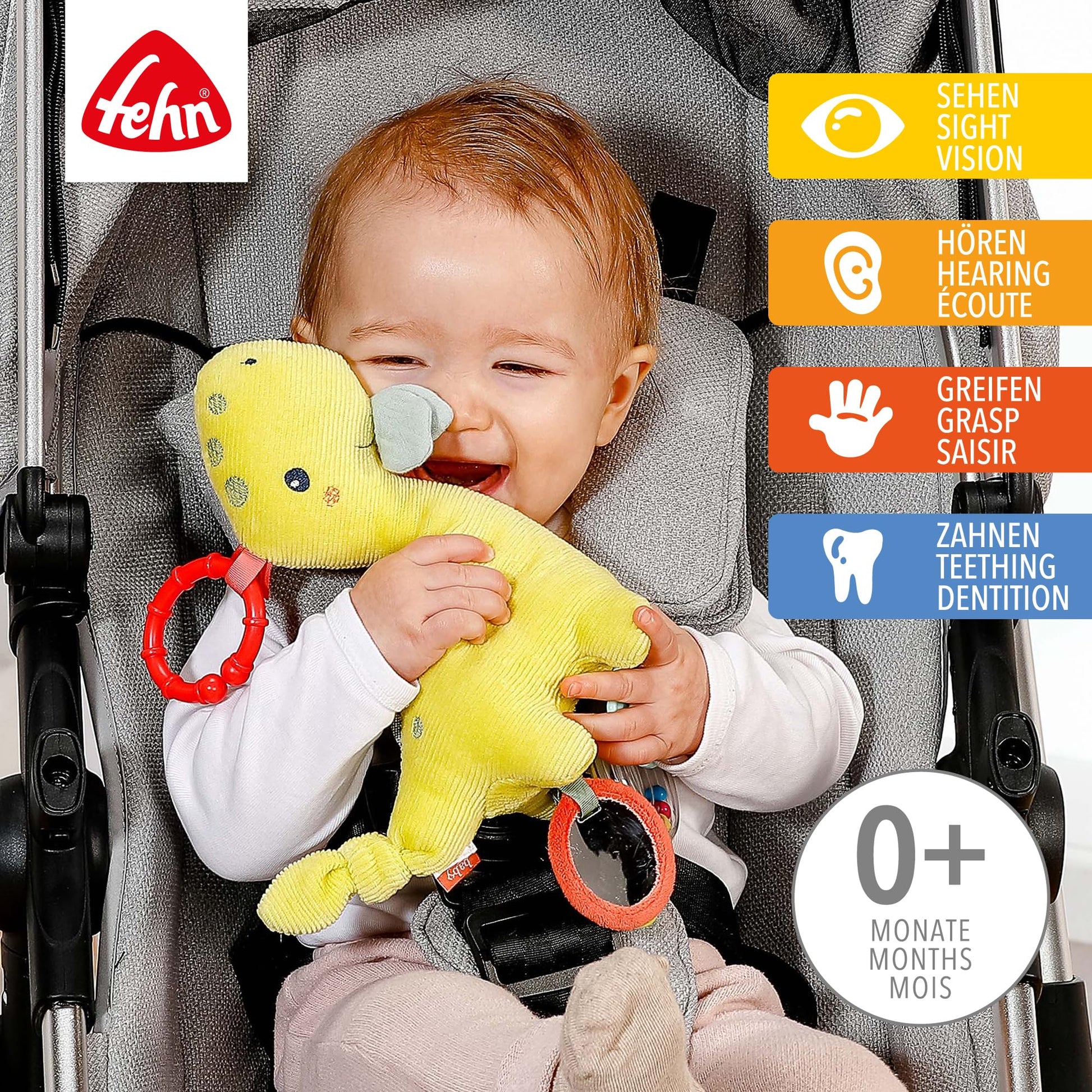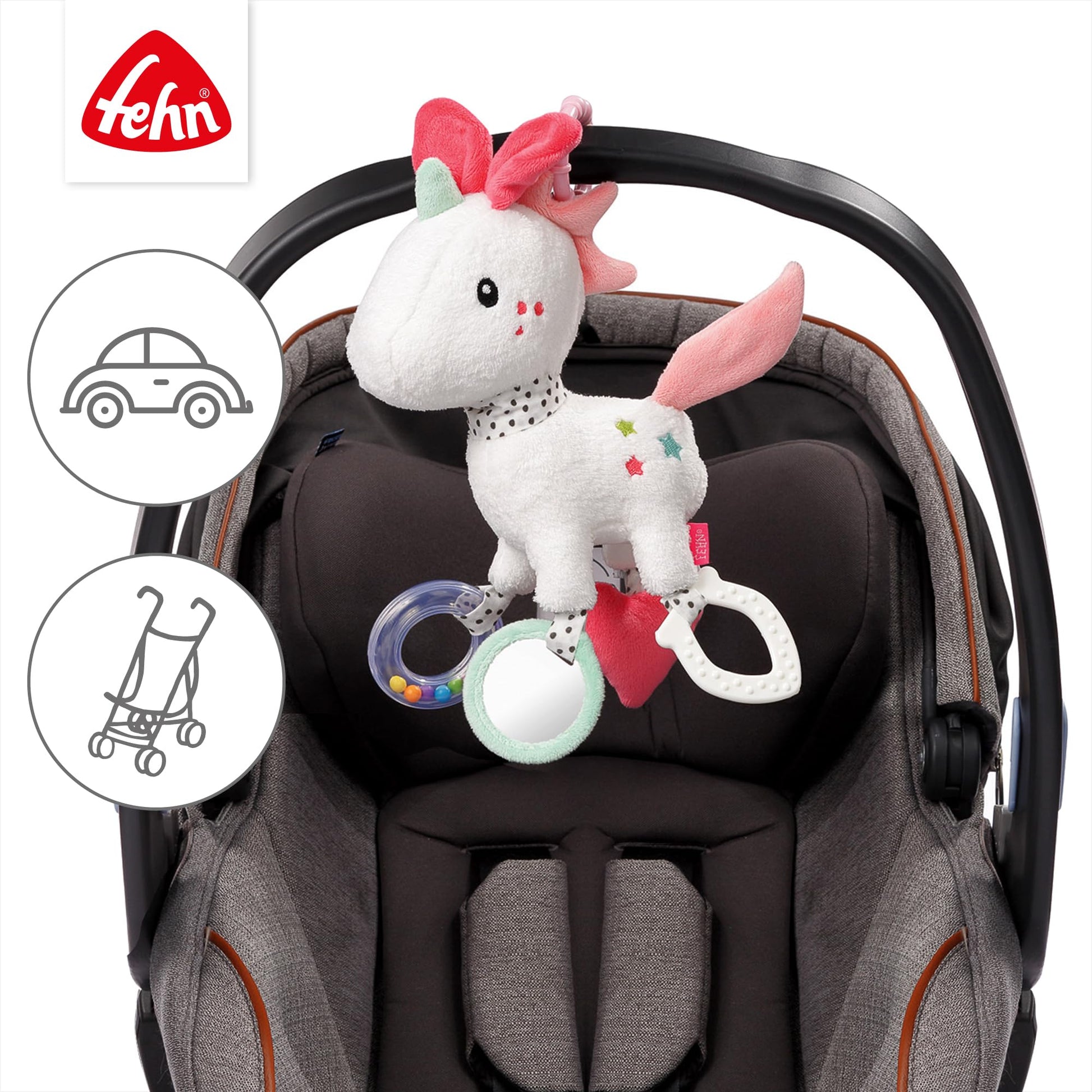 - Versatile fun – the baby can discover himself playfully in the small mirror and creates fun sounds with the pearl rattle ring and the bell in the plush unicorn