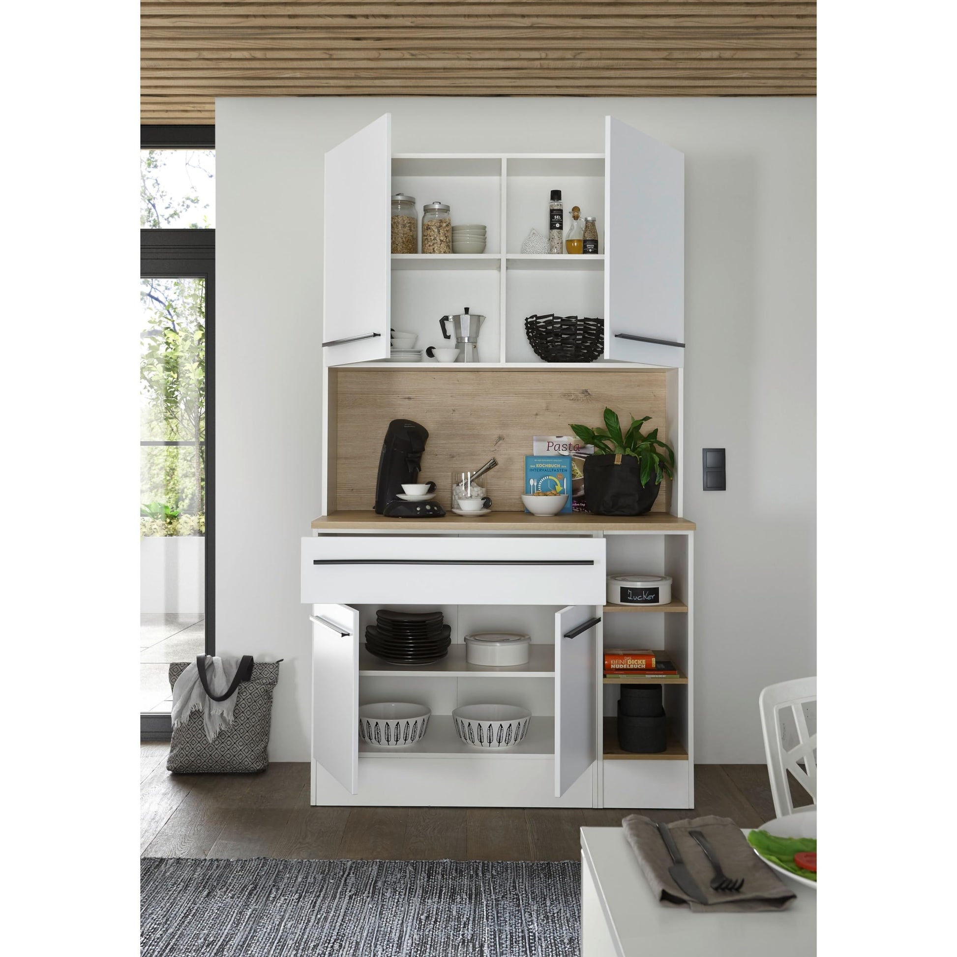 - Modern – The kitchen unit is presented in matte white, which ensures a modern appearance. The worktop in Artisan oak and the long handles in black set special accents.